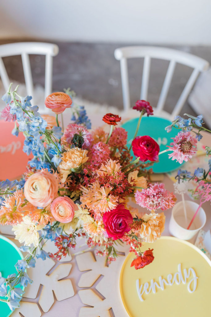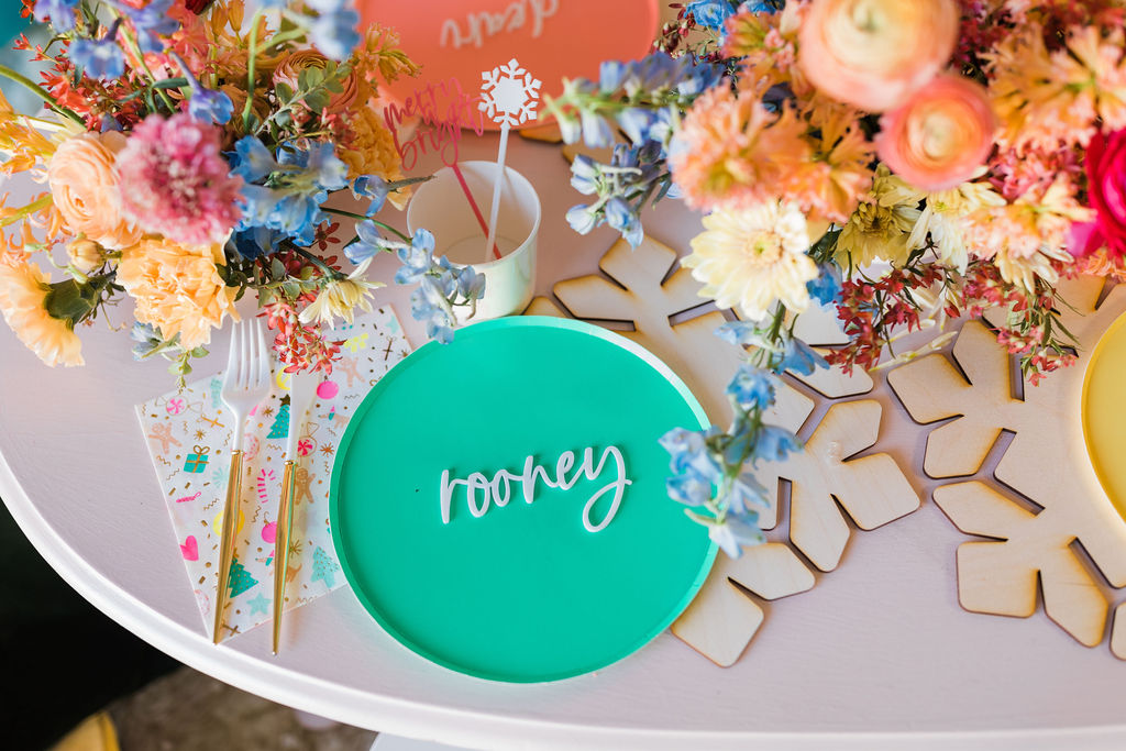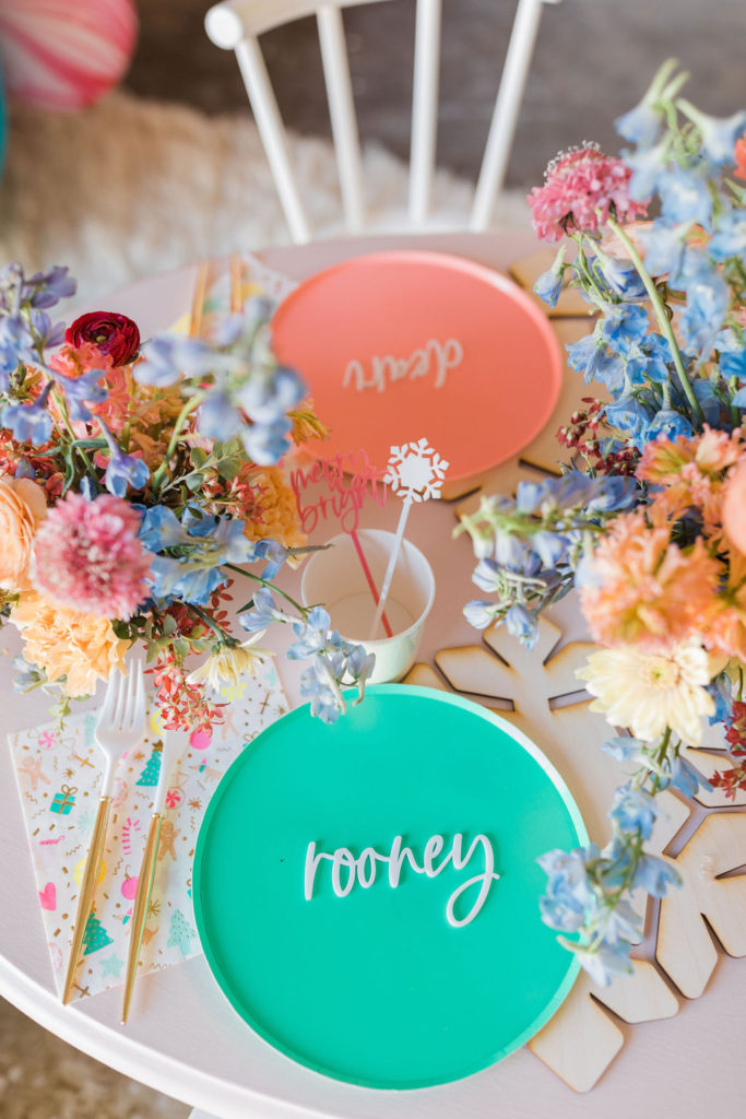 The table was set with three of my favorite tabletop companies, Oh Happy Day colorful plates, Daydream Society’s napkins, and Sophistiplate flatware. For those extra details, David & Leanna did the sweet little place cards, cocktail stirrers, and my favorite, the wooden snowflake chargers.