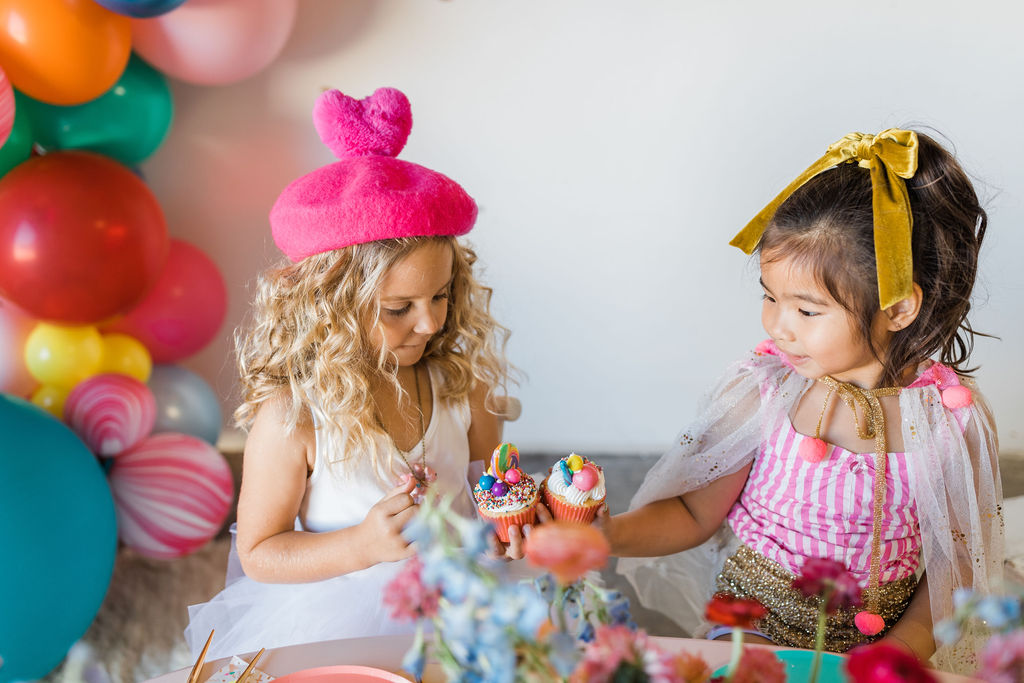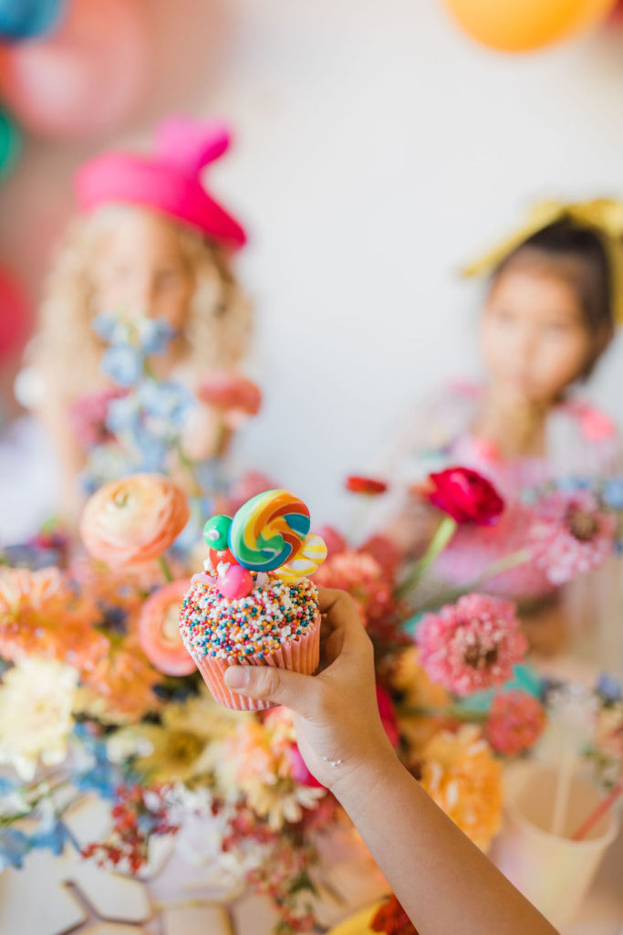 Sweet Salvage Rentals showed off with part of their new kid’s collection. The cutest white chairs and pretty pink table are the perfect addition to any little lady’s party. We added some colorful pillows to round it out.