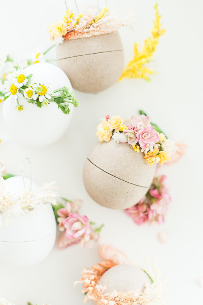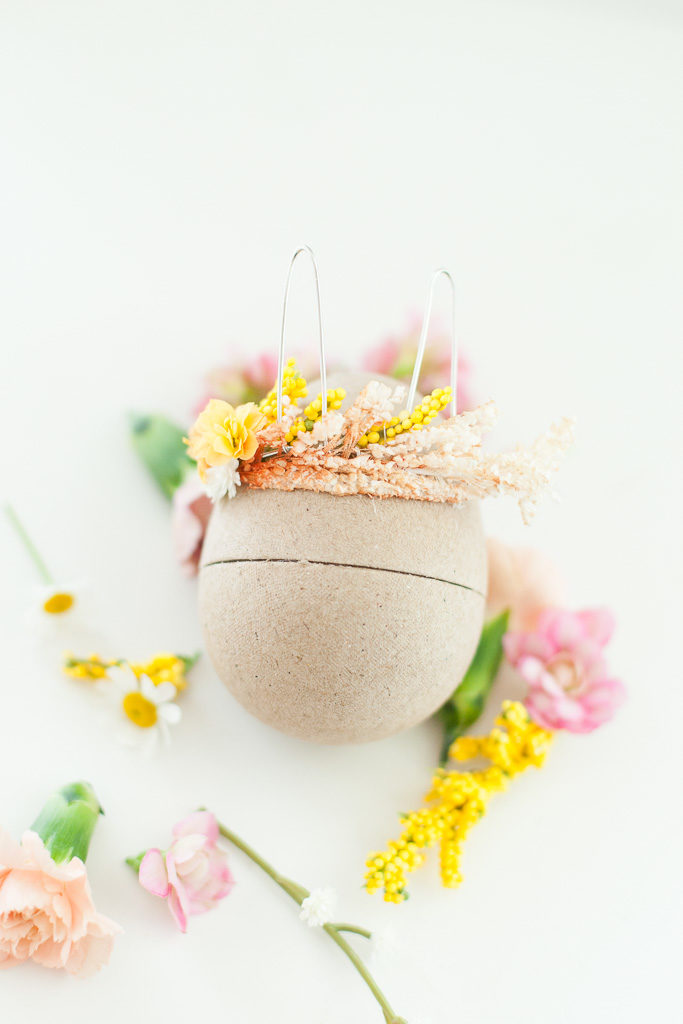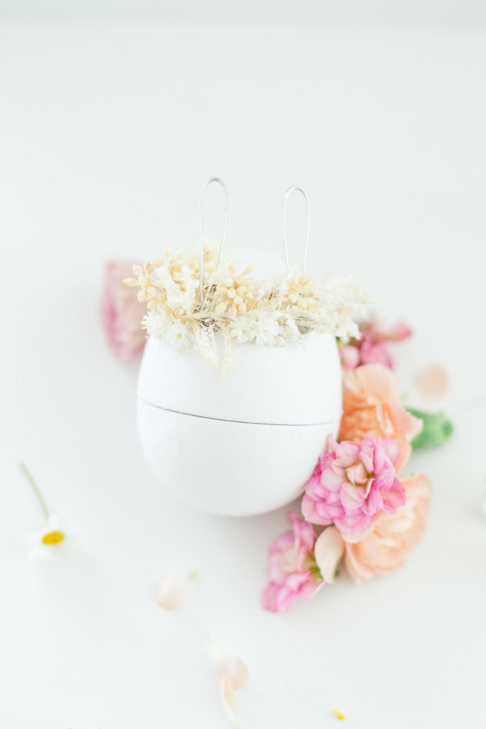 Now, this is pretty easy to do. Simply, just make floral crowns, ha! I started from one side and worked and layered my way to the other side. I started with some fake flowers and then sprinkled in some real ones for detail. Each egg was different from the next! Now when using all real flowers, you know those suckers will die and wilt, so don’t be sad when they do. So using all fake flowers is fine! I’m sure you know, be careful with the glue gun! To make the bunny ears, I took some jewelry wire and formed some ears, and then glue them to the egg. Covering the bottom wire with the flowers.