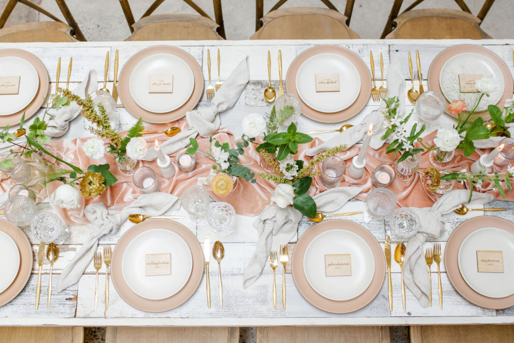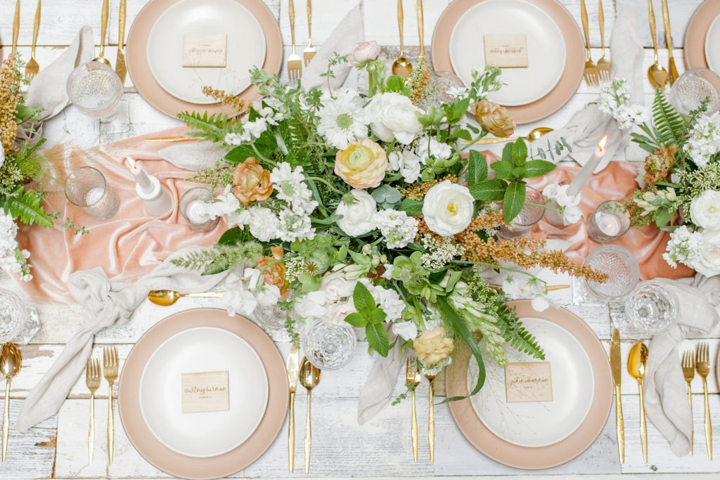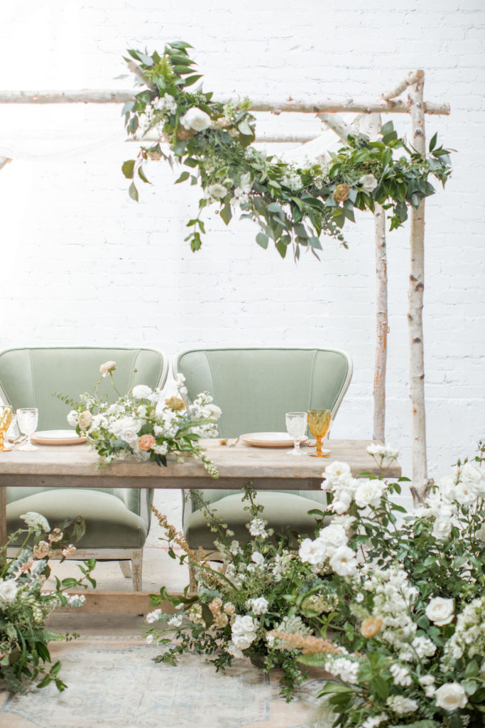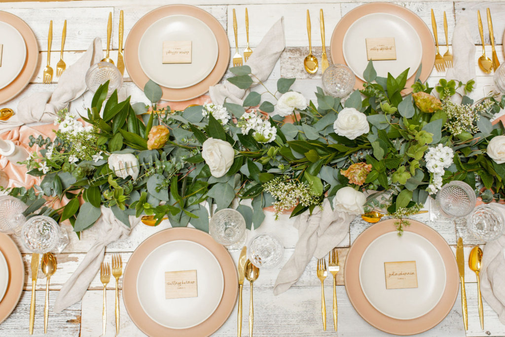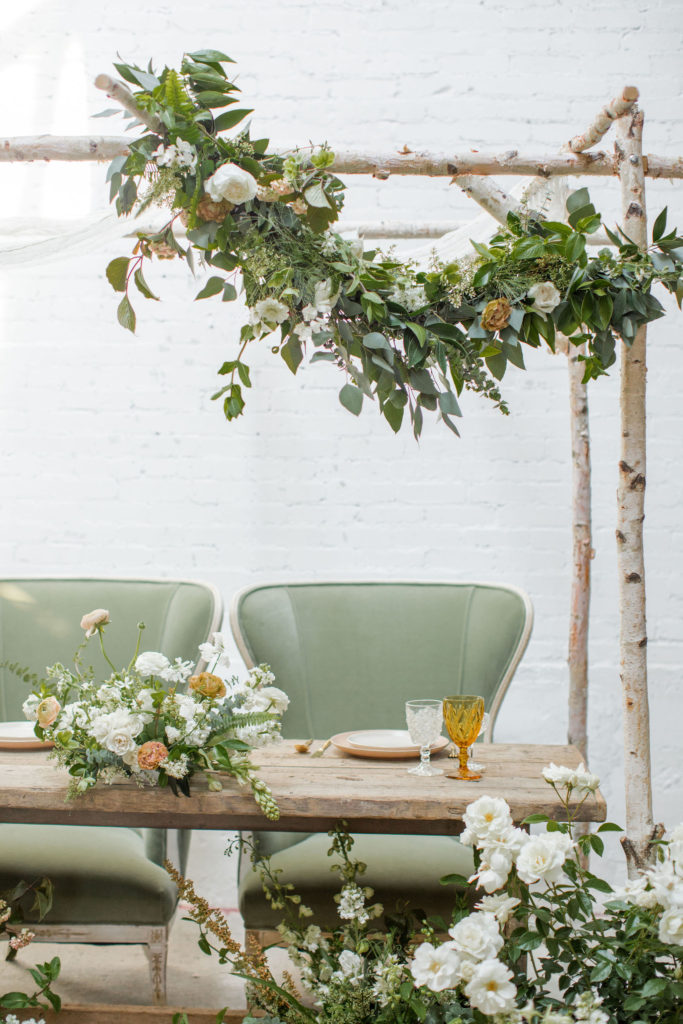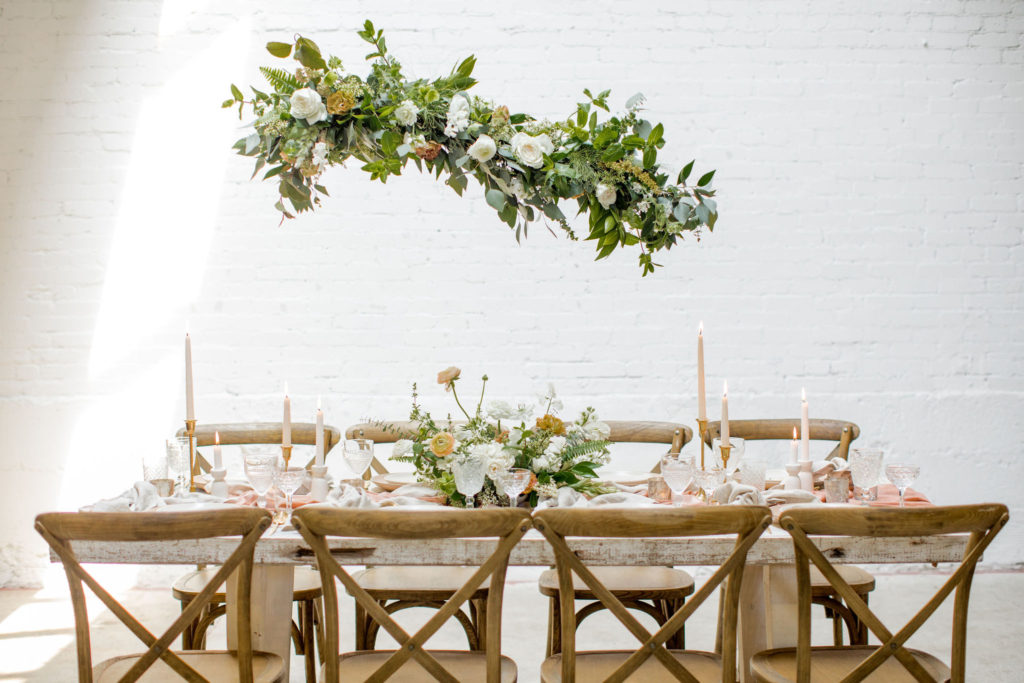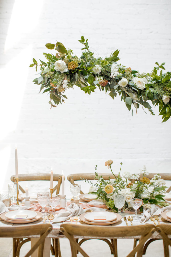 Another fun idea we played with while doing this shoot was having a garland as a hanging installation over the table! Isn’t that eye catching?! Your guests will definitely be wow’d!! We placed the floral arrangements back on the table and added that beauty up top. Pretty gorgeous if you ask me!!