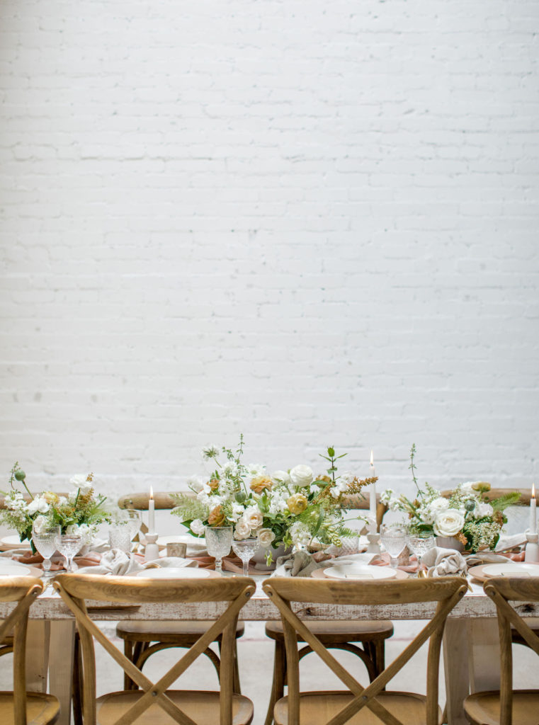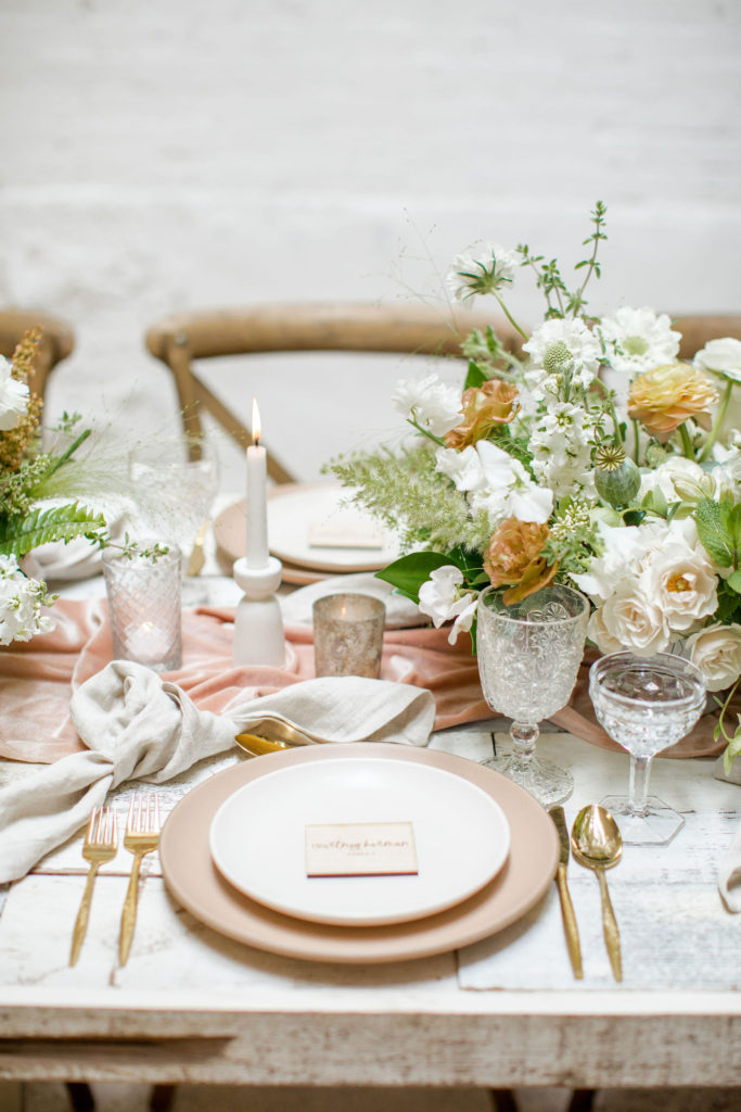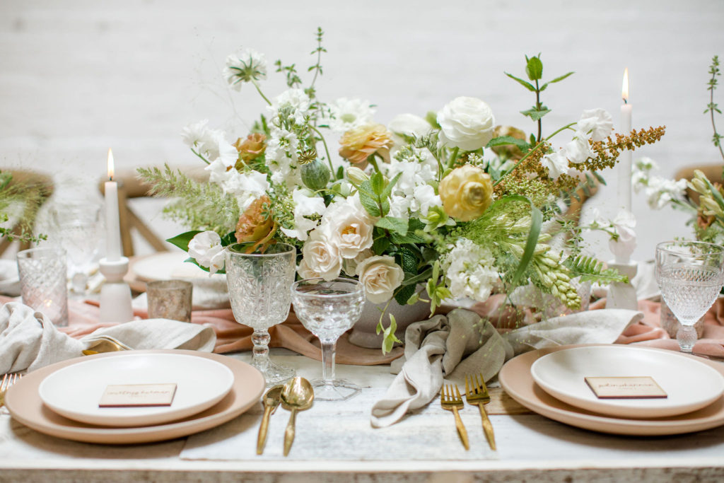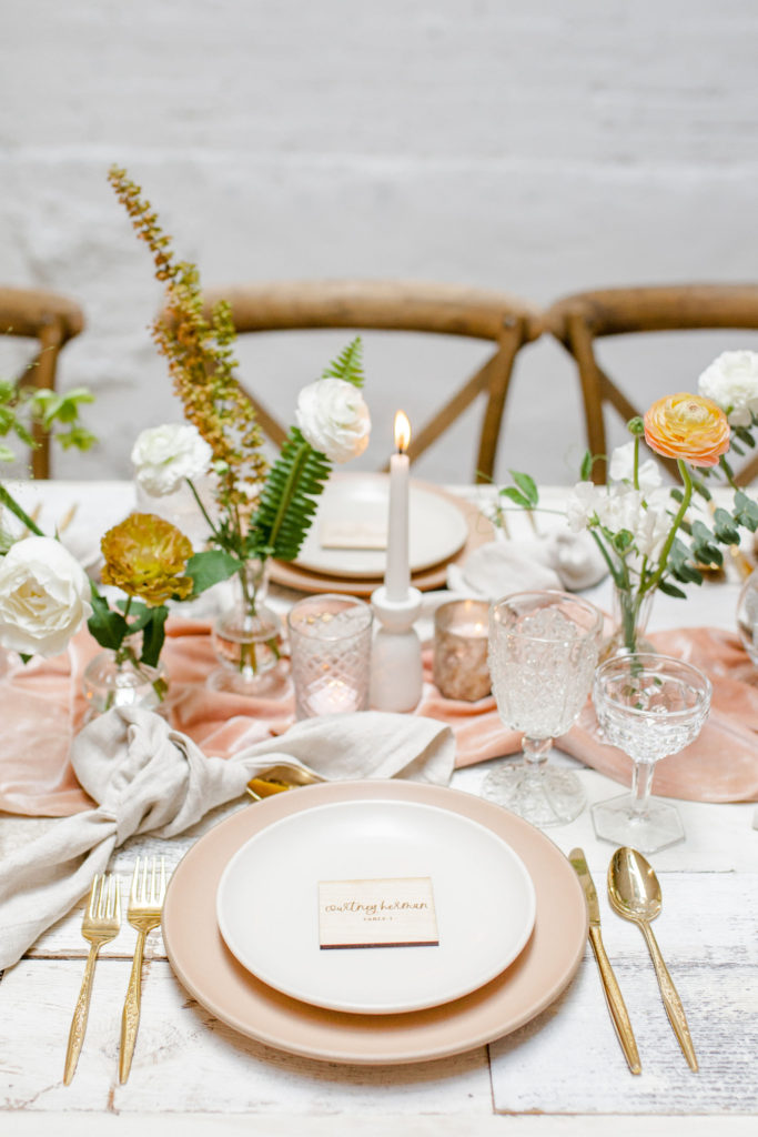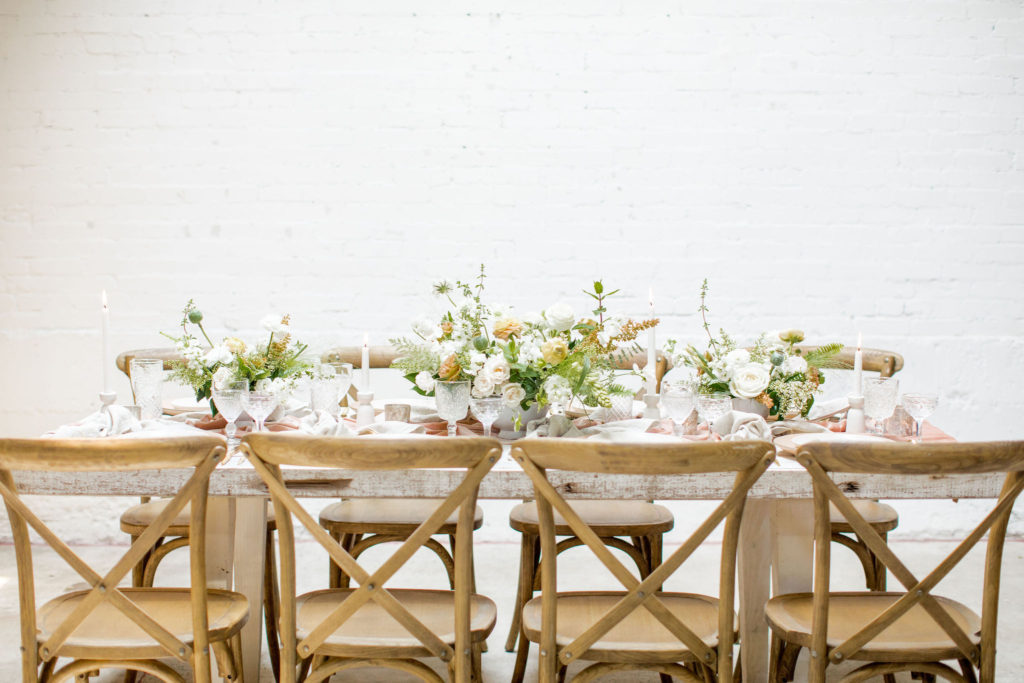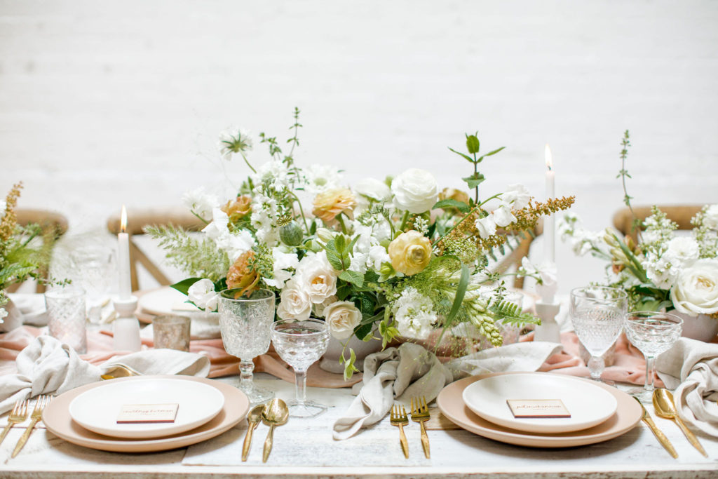 Another fun idea we played with while doing this shoot was having a garland as a hanging installation over the table! Isn’t that eye catching?! Your guests will definitely be wow’d!! We placed the floral arrangements back on the table and added that beauty up top. Pretty gorgeous if you ask me!!