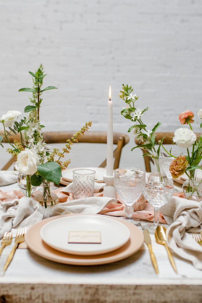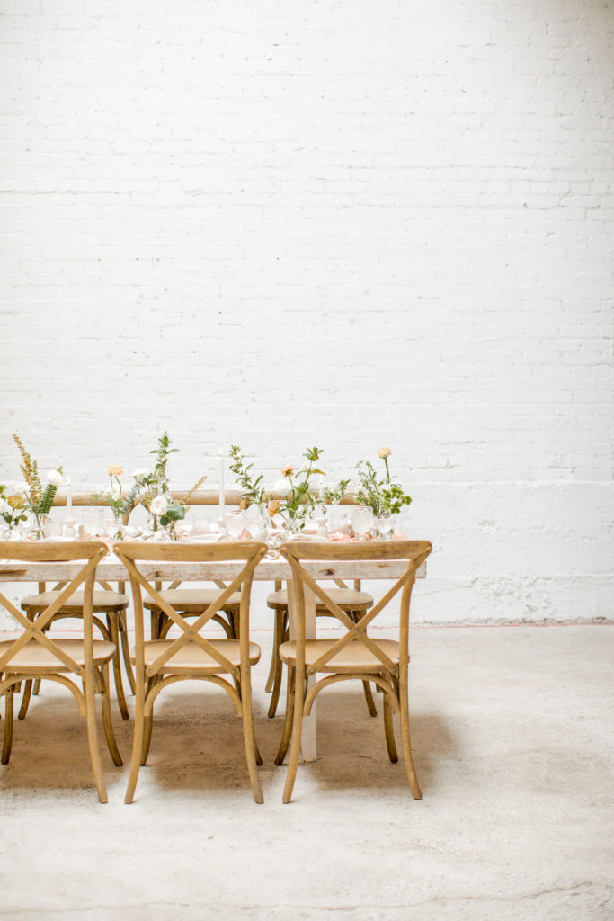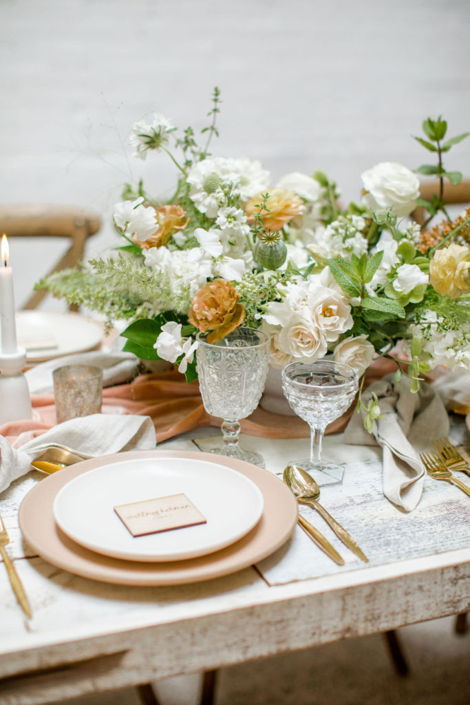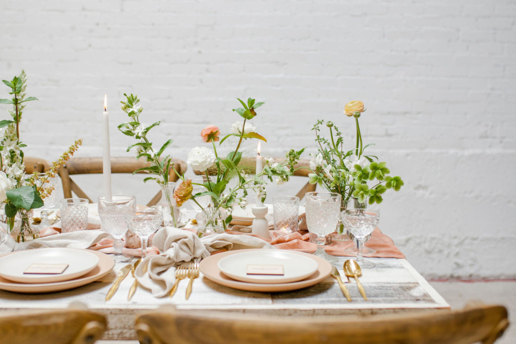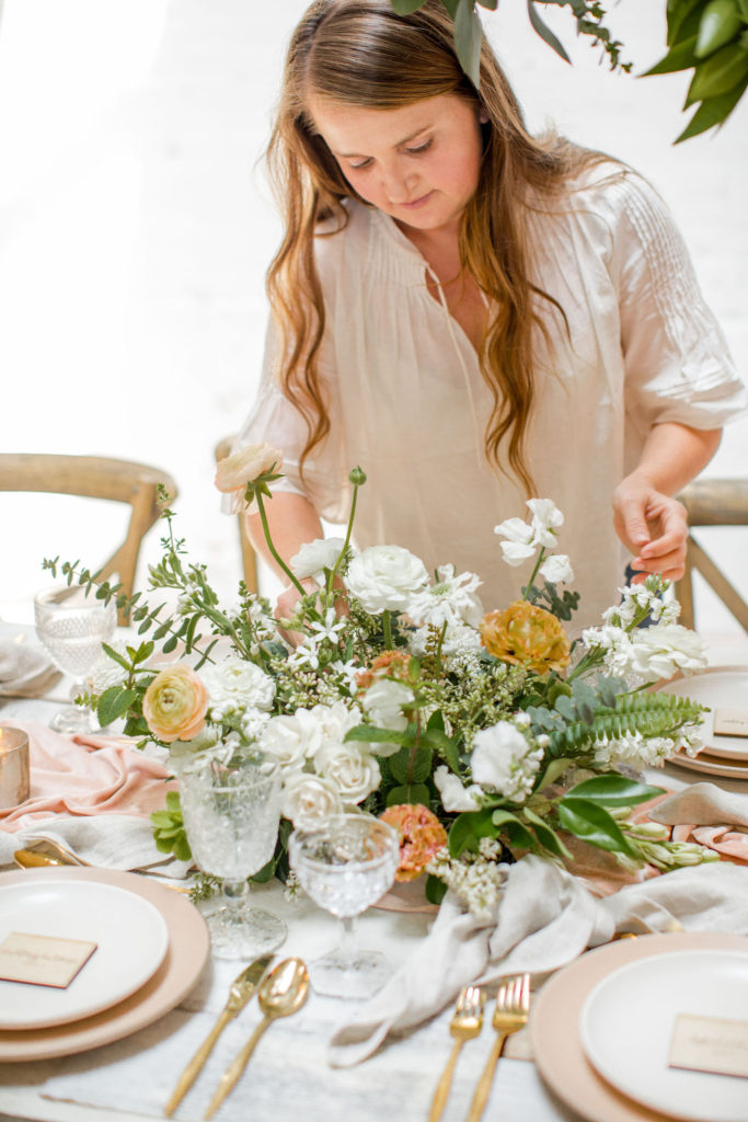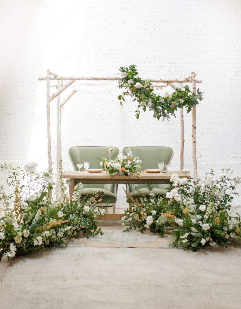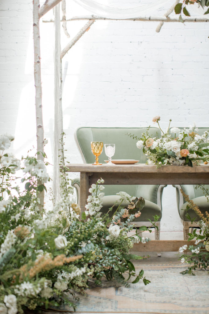 Another fun idea we played with while doing this shoot was having a garland as a hanging installation over the table! Isn’t that eye catching?! Your guests will definitely be wow’d!! We placed the floral arrangements back on the table and added that beauty up top. Pretty gorgeous if you ask me!!