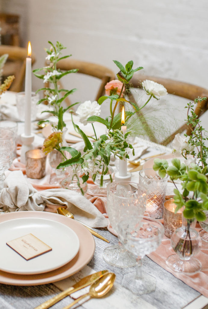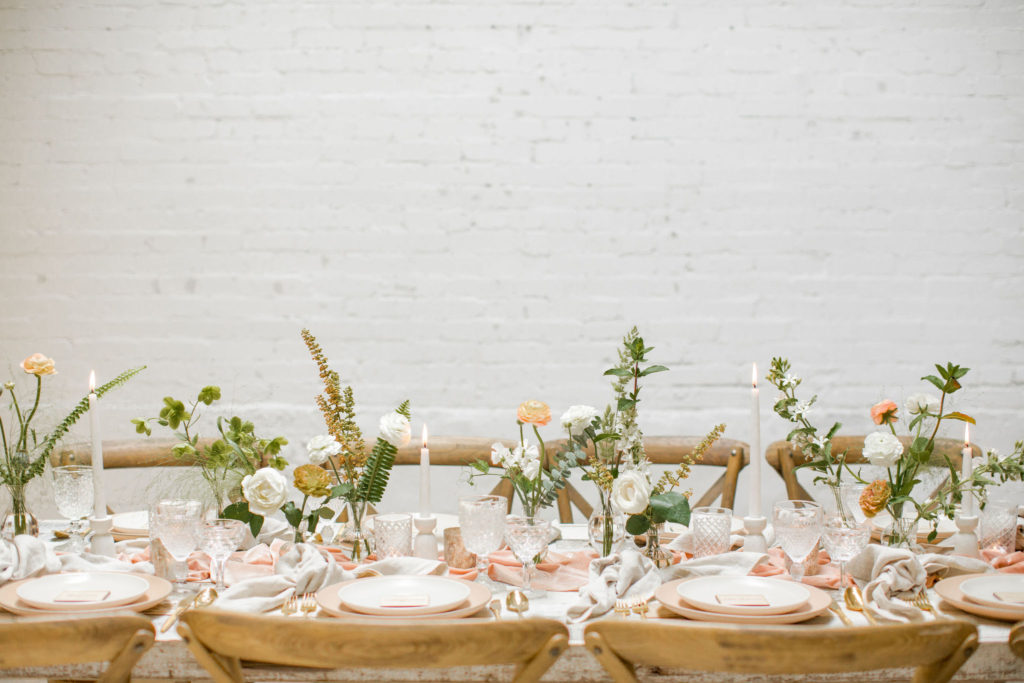 Our first set up is all about bud vases! These little suckers are small, but pack a punch! If you are a bride on a budget, or if you want to put more of your budget elsewhere, this is a great option for you. In this case we added a beautiful runner and candles to spice it up. This is probably the most cost effective option, especially for longer tables, and it’s still just gorgeous!