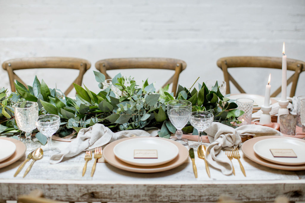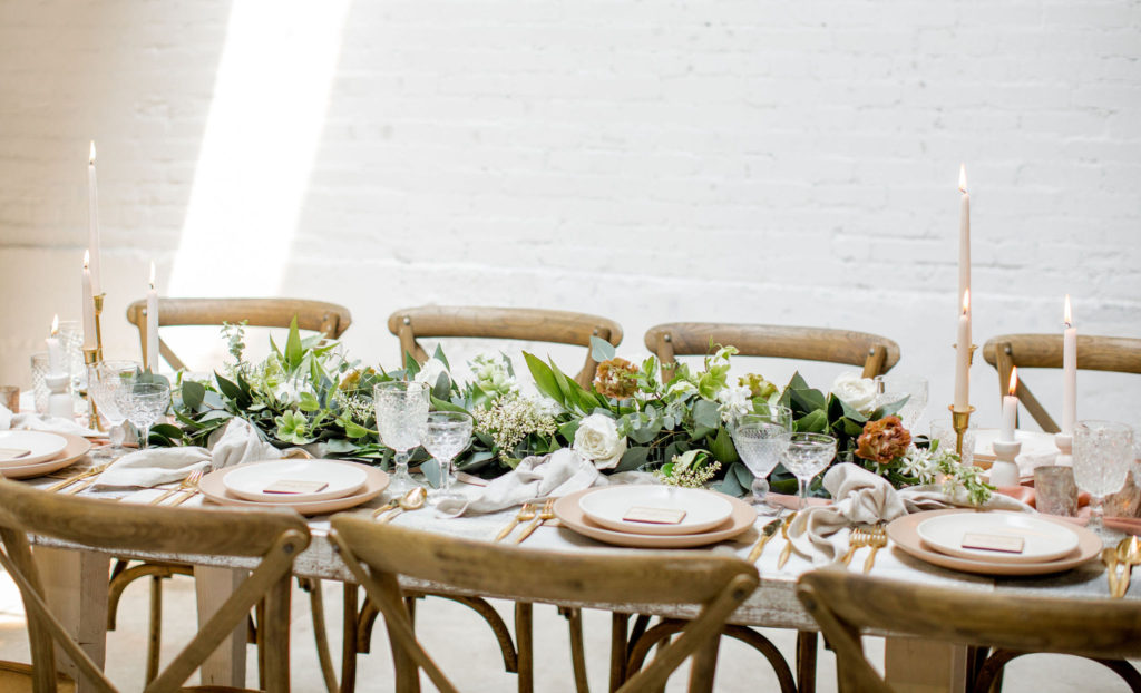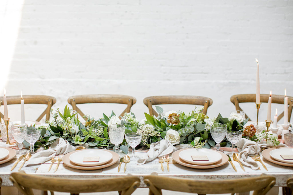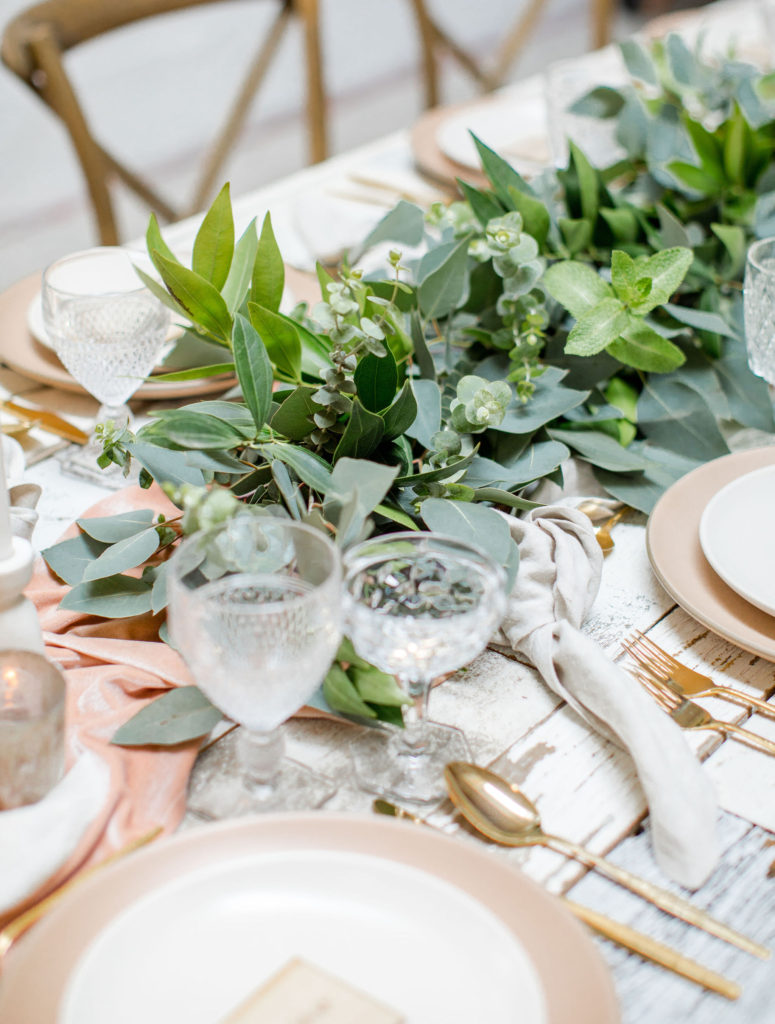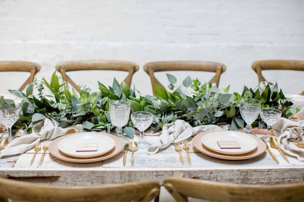 Our third table set up is using greenery, here is a little more from Alex… “Garlands are a classic, neutral look that never goes out of style. You can create a garland to blend well with any type of design or theme your wedding might have. Whether it’s boho, rustic, classic, tropical etc – a garland will work! I like mixing 2 or 3 different types of greenery in my garlands to add some dimension and texture.