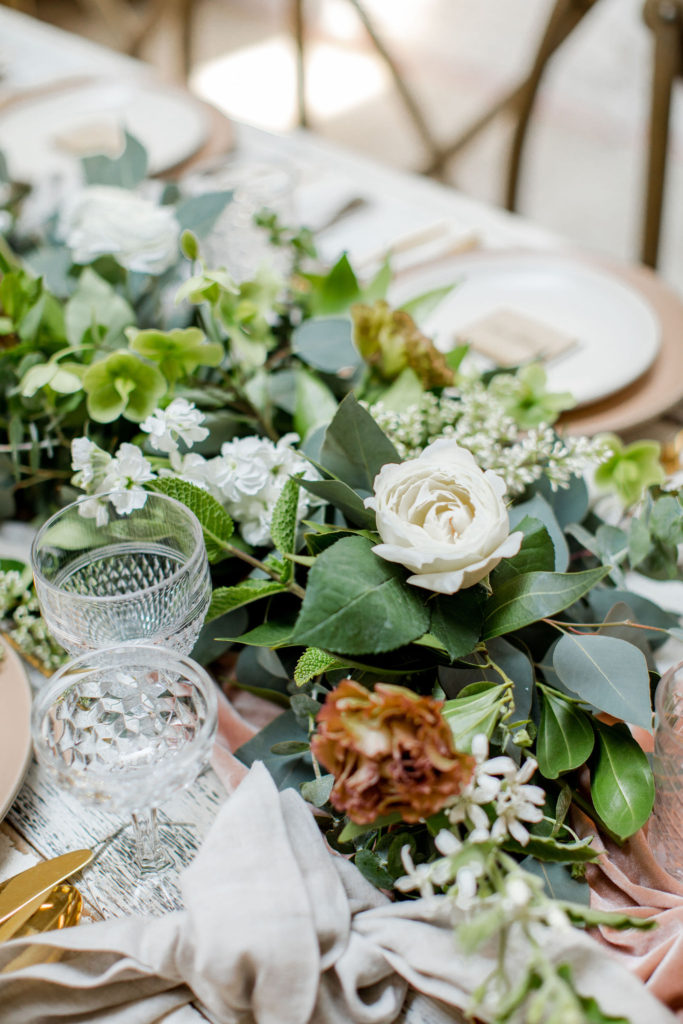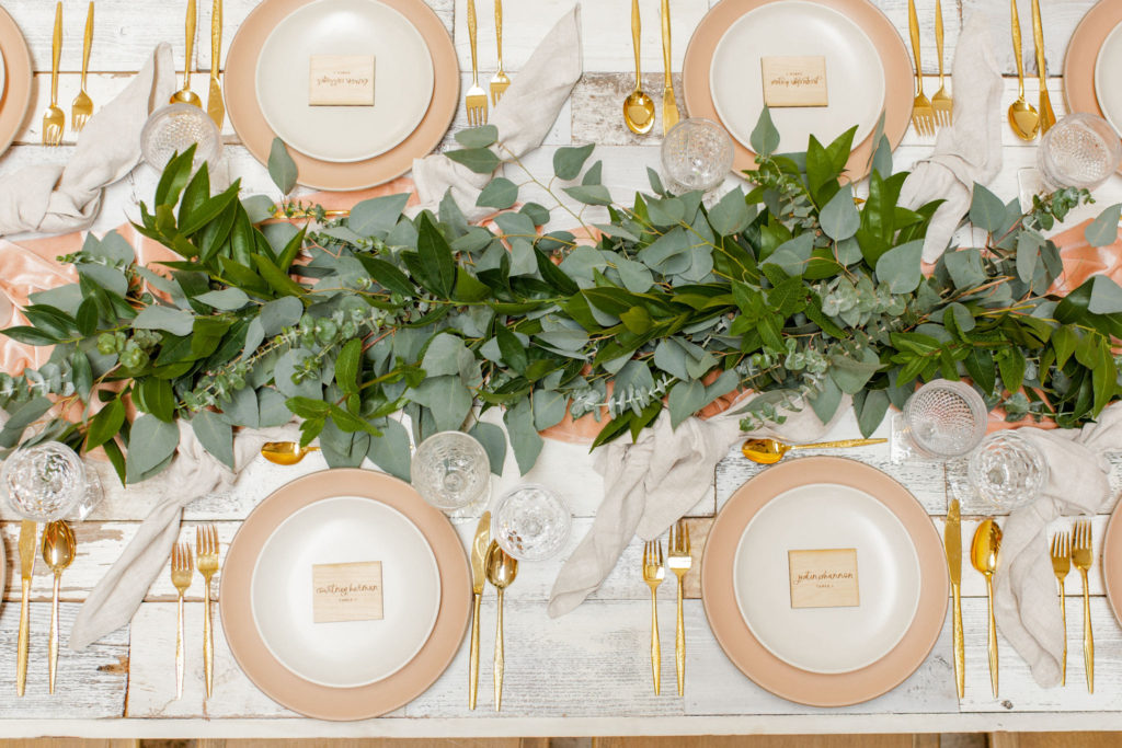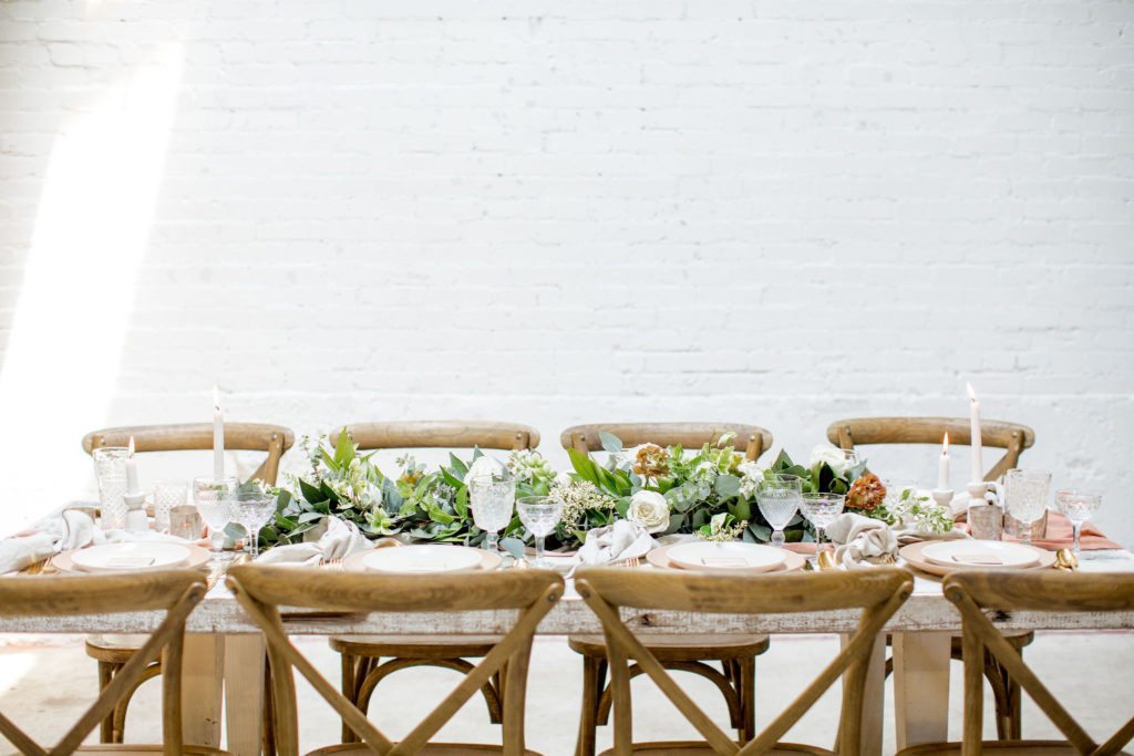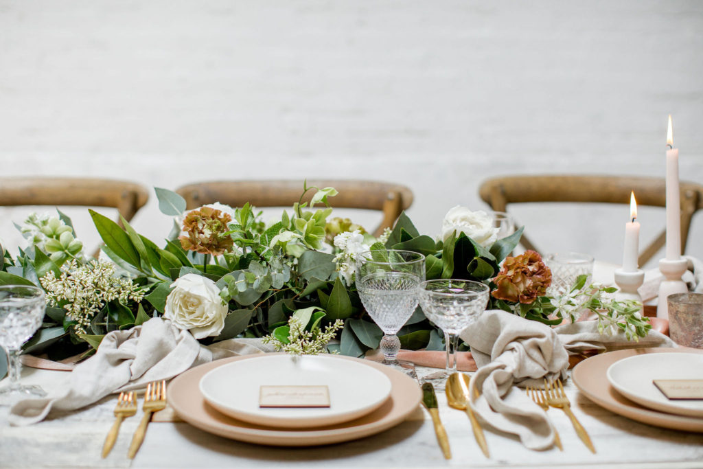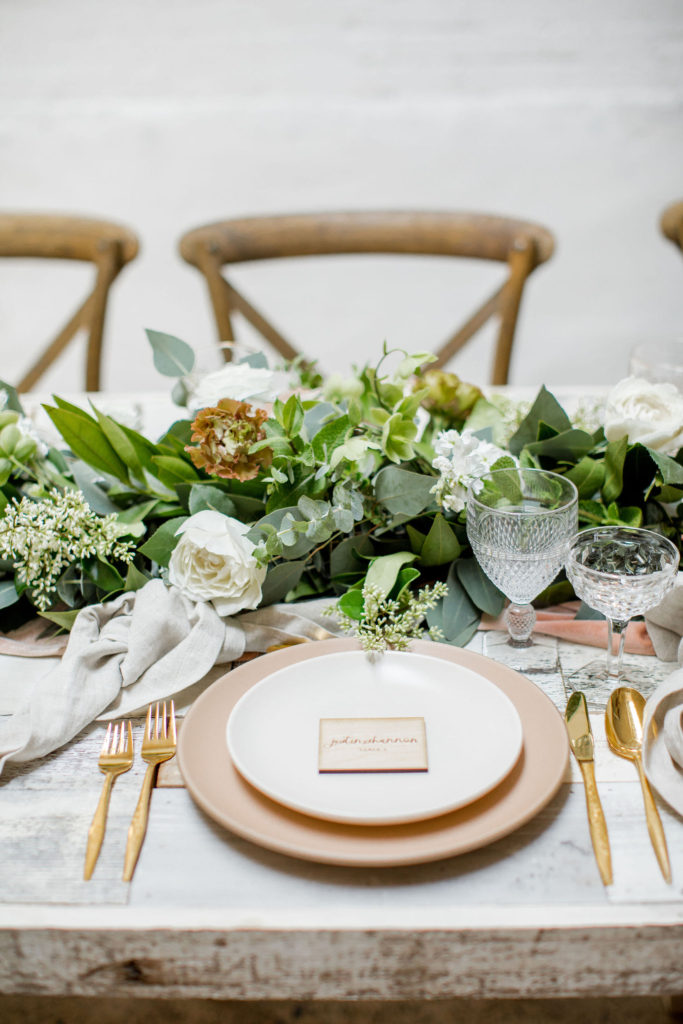 Our third table set up is using greenery, here is a little more from Alex… “Garlands are a classic, neutral look that never goes out of style. You can create a garland to blend well with any type of design or theme your wedding might have. Whether it’s boho, rustic, classic, tropical etc – a garland will work! I like mixing 2 or 3 different types of greenery in my garlands to add some dimension and texture.