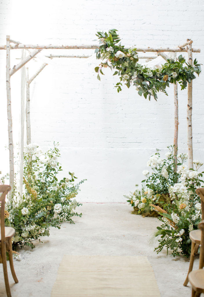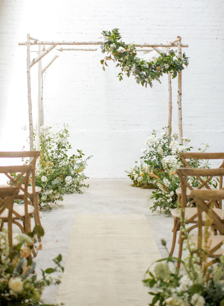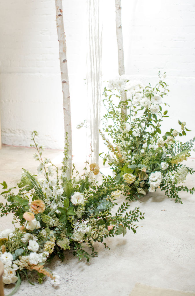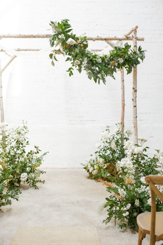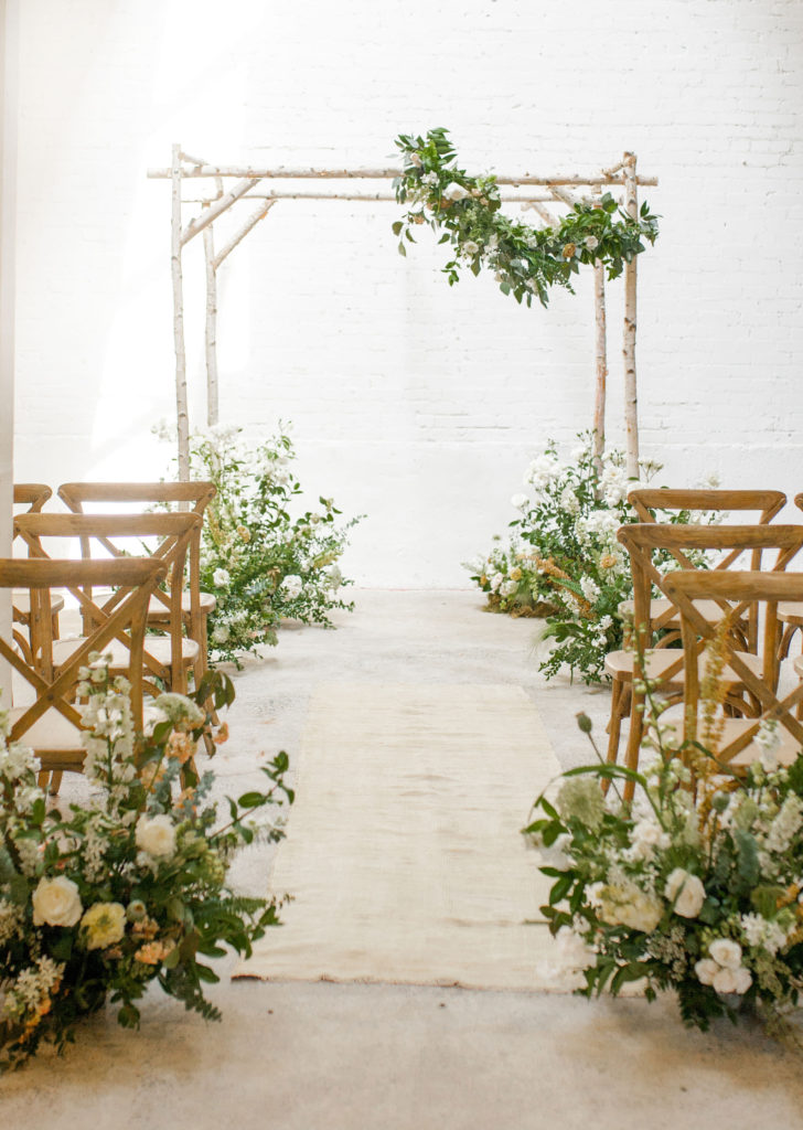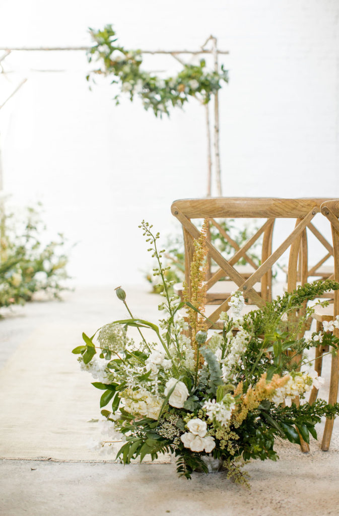 Back to more floral set ups… Let’s talk ceremony! Here, Alex did lots of beautiful floor arrangements for the aisle and decked out the arbor with them as well. She also added our pretty garland to the top of the arbor! Such a lovely detail and I love how it’s asymmetrical. I also love how she repurposed it… Which we will talk about more in just a bit…