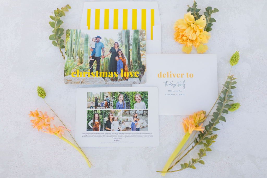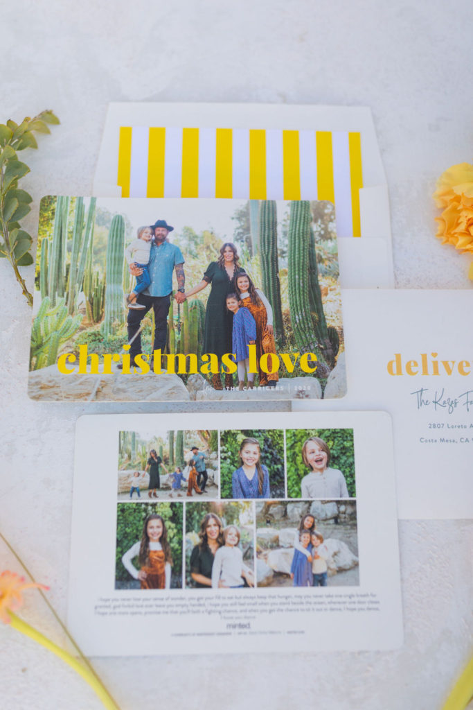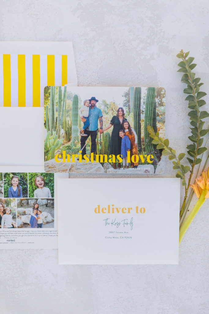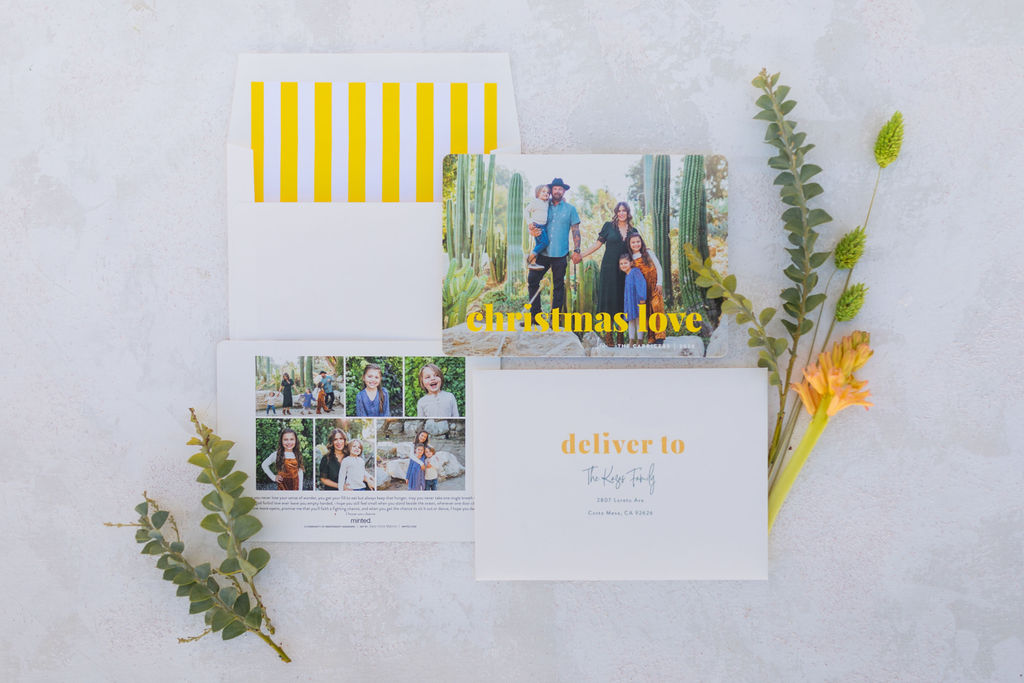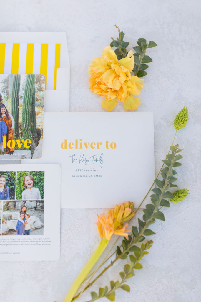 Leah went merry and BRIGHT with her card!! This is the kind of mail you know will put a smile on the recipient’s face!! Jessica Lynn Photo shot Leah’s cute little fam in a park with tons of amazing cacti and succulents. I love how the bright yellow goes with that desert atmosphere! And I really love the envelope liner to top it off!