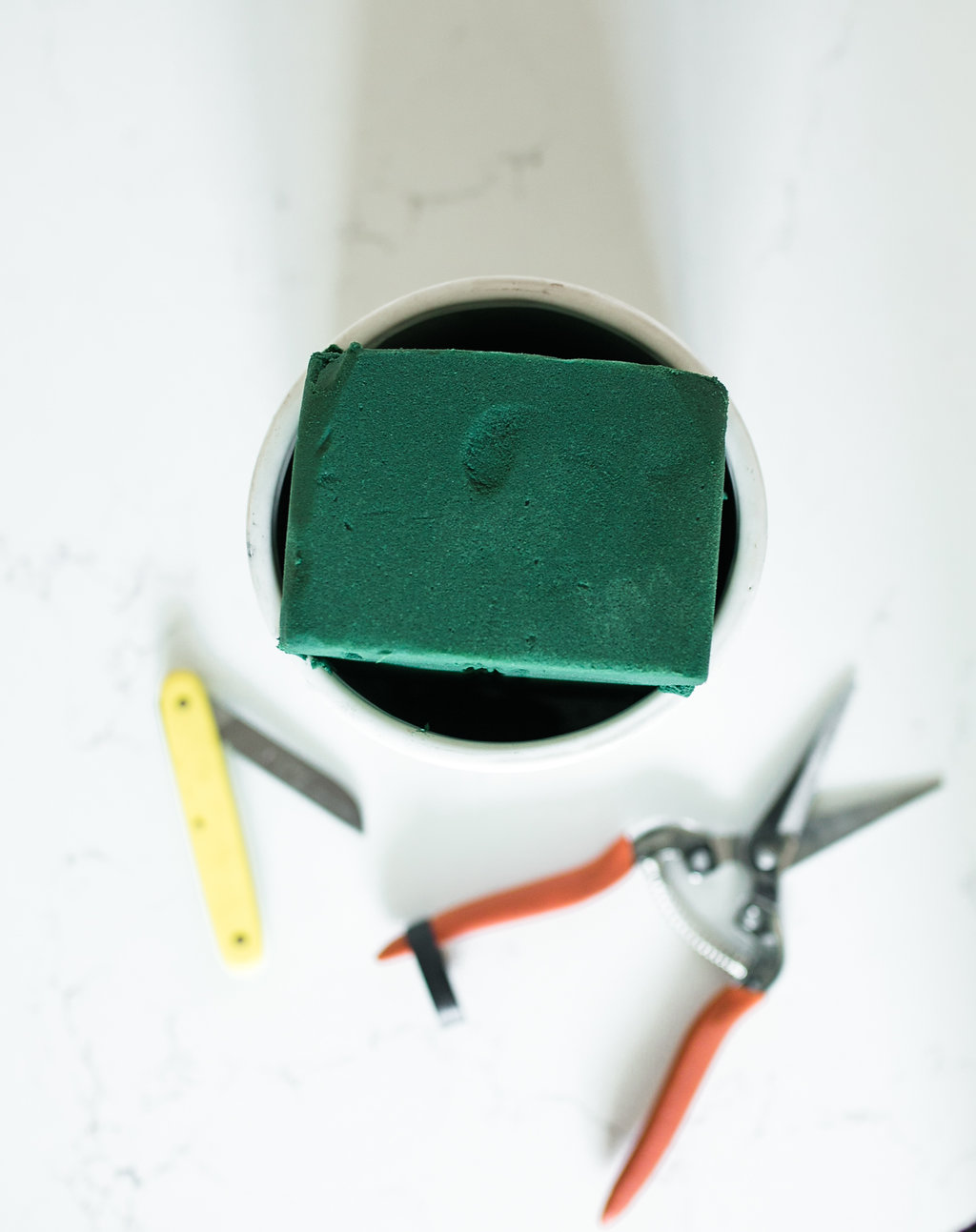 She also uses oasis (that’s that foam green stuff), a vase of your choice, scissors and her handy dandy pocket knife!