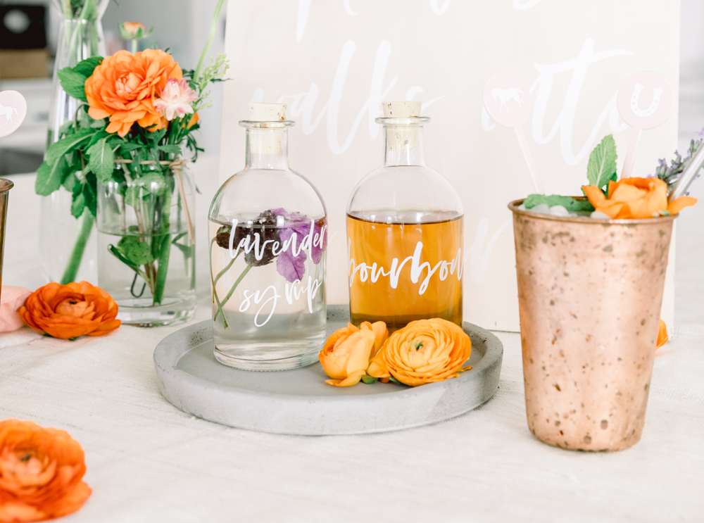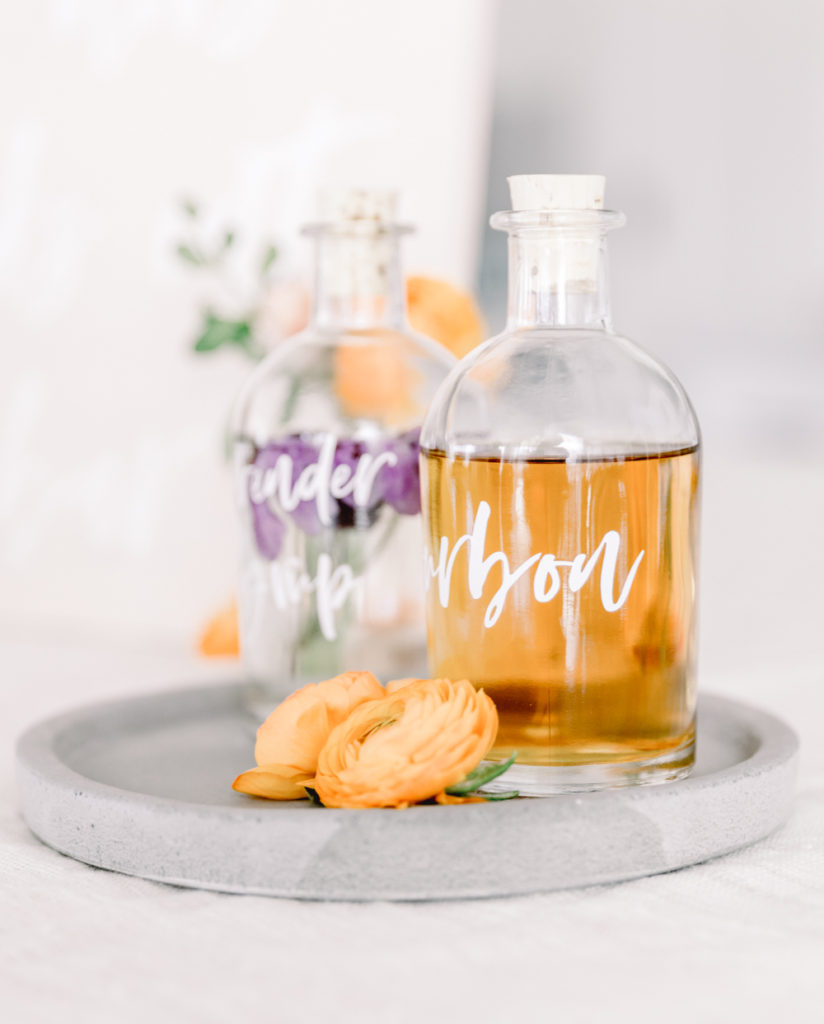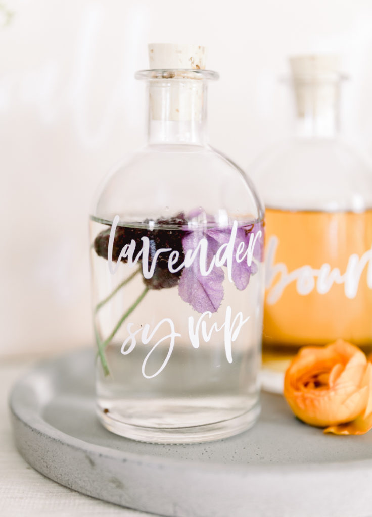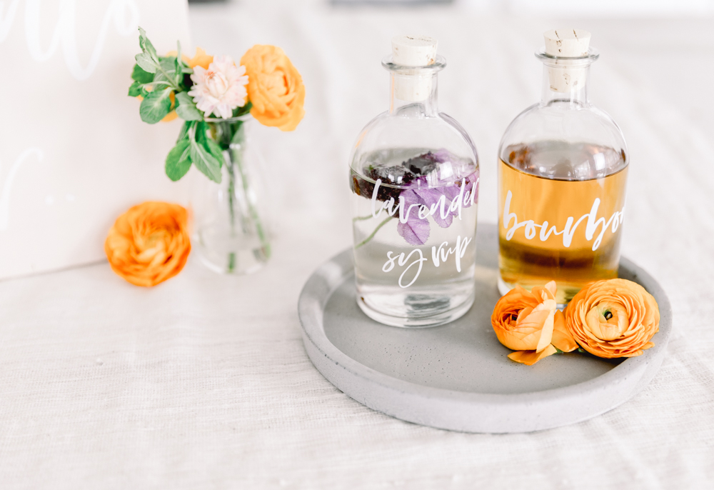 Start by making your lavender infused simple syrup. Place 3 tbsp lavender flowers (fresh or dried), 2 cups sugar, and 1 cup water into a saucepan. Boil until sugar is dissolved, and set aside to cool. Once cooled, pour into a clear glass bottle. You can even add a label like I did or write it on! Do this idea as well for your bourbon.