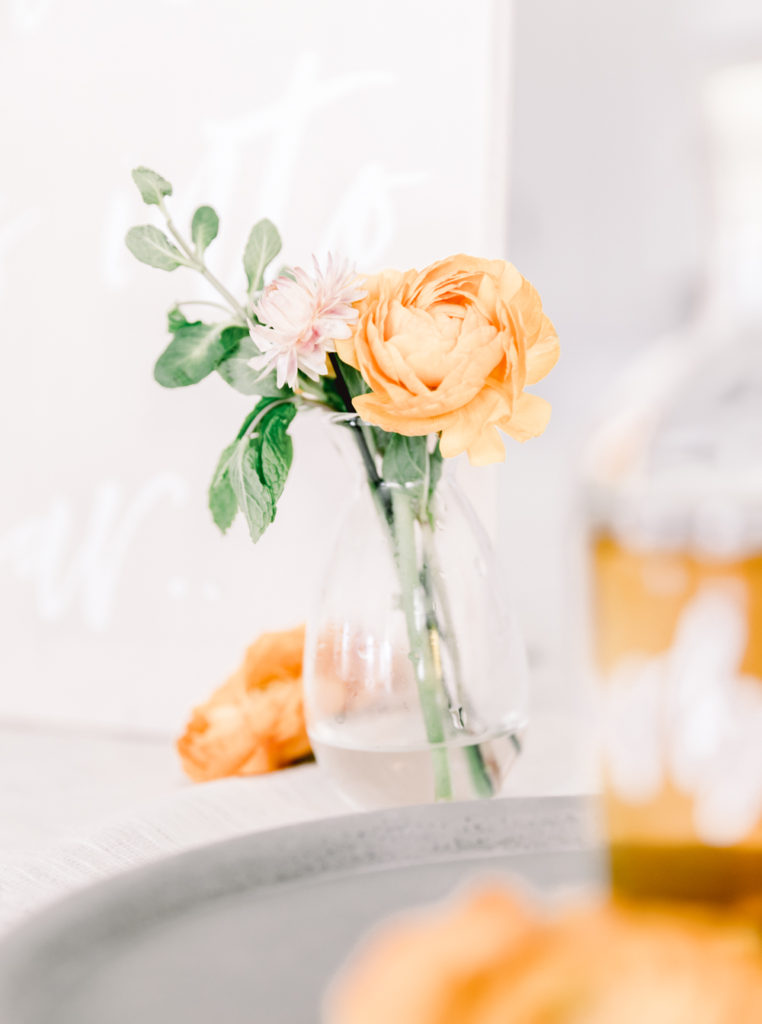Next, you need some flowers and fun glassware! The morning of or even better the previous day grab yourself some pretty flowers. I got mine from Whole Foods. Getting flowers the day before, not only saves you time but allows the flower buds to open up a bit. Put them into simple vases, and set aside. I also added mint into the arrangments so you have it handy for your cocktails and it adds an herbal detail to the flowers.