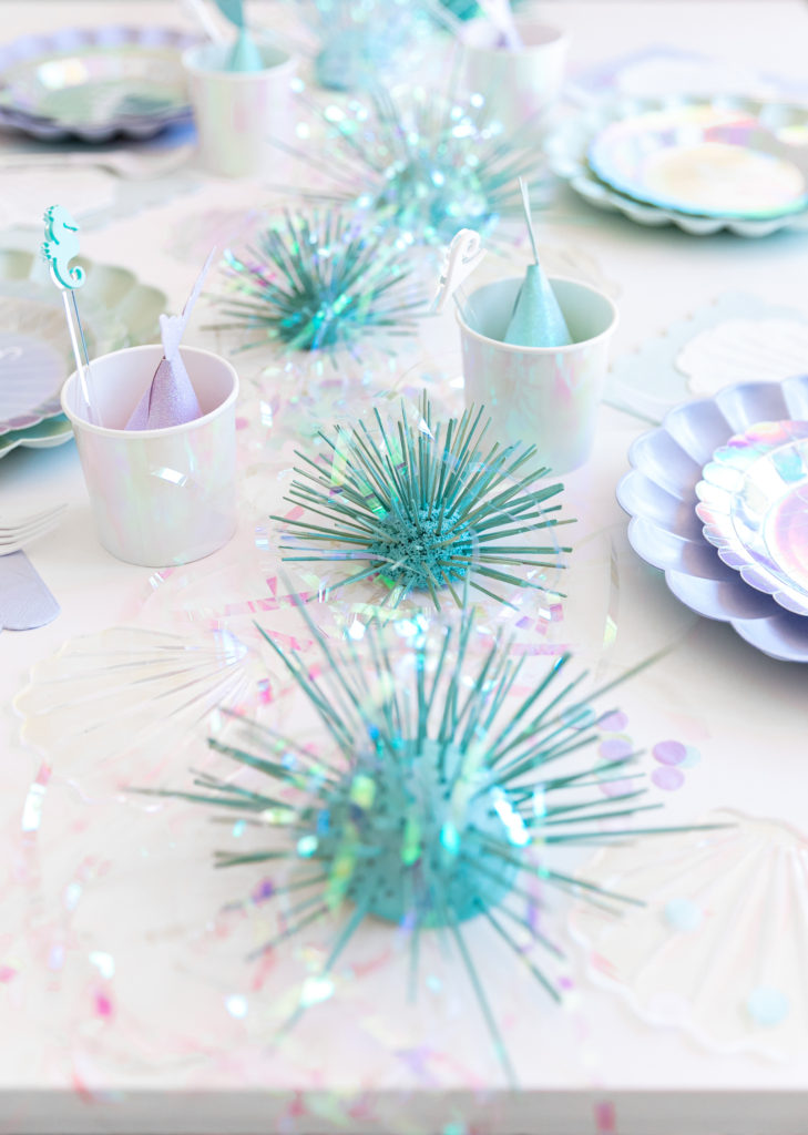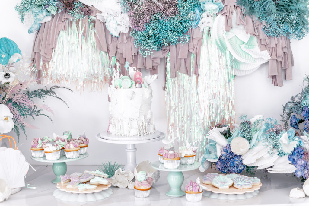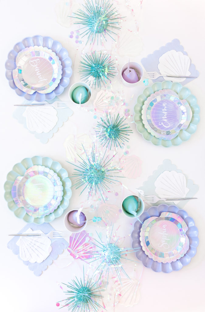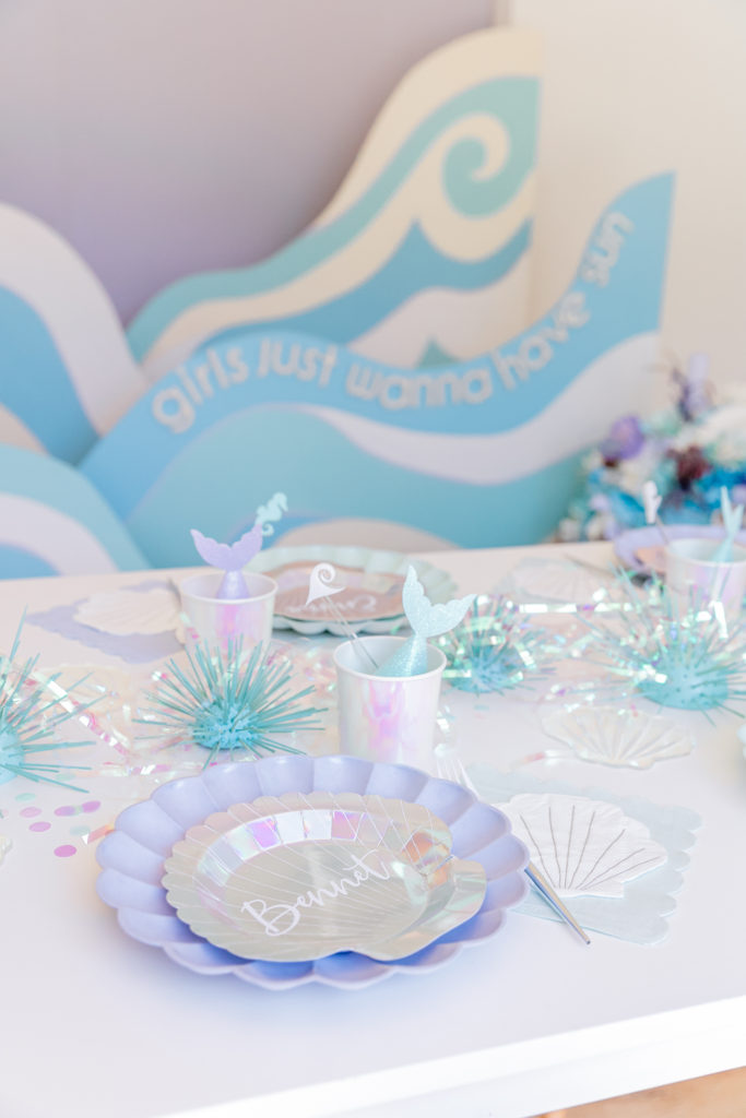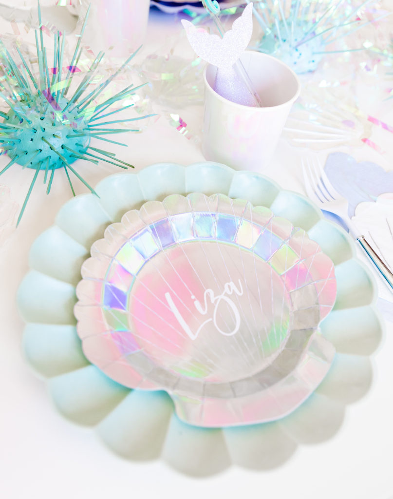 Royale chose all of the tabletop items, all by Meri Meri in fact, and I came to style them! We used their new eco friendly tabletop collection along with their mermaid collection and it fit so well together. In addition to the Meri Meri we added other items picked up from Bonjour Fete plus little sea urchins made by Alexis and details by Creative Amme. Guest’s names were on their little seashell plates and seahorse and wave stir sticks were in their cups! And of course iridescent streamers and sea shells were strung along the length of the table. Don’t you just love it?!