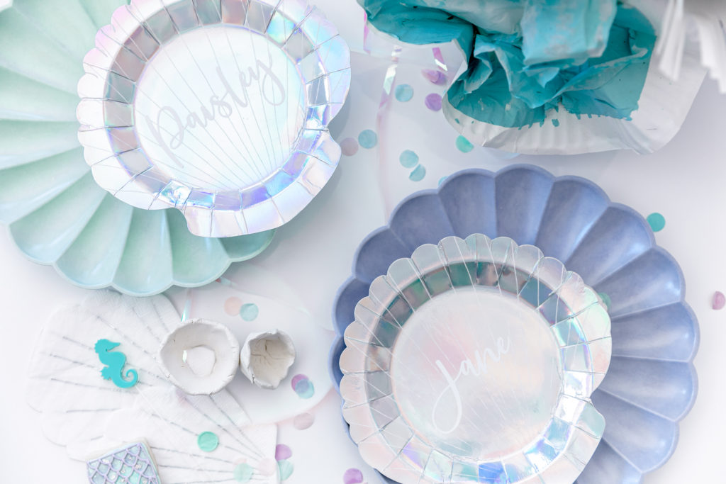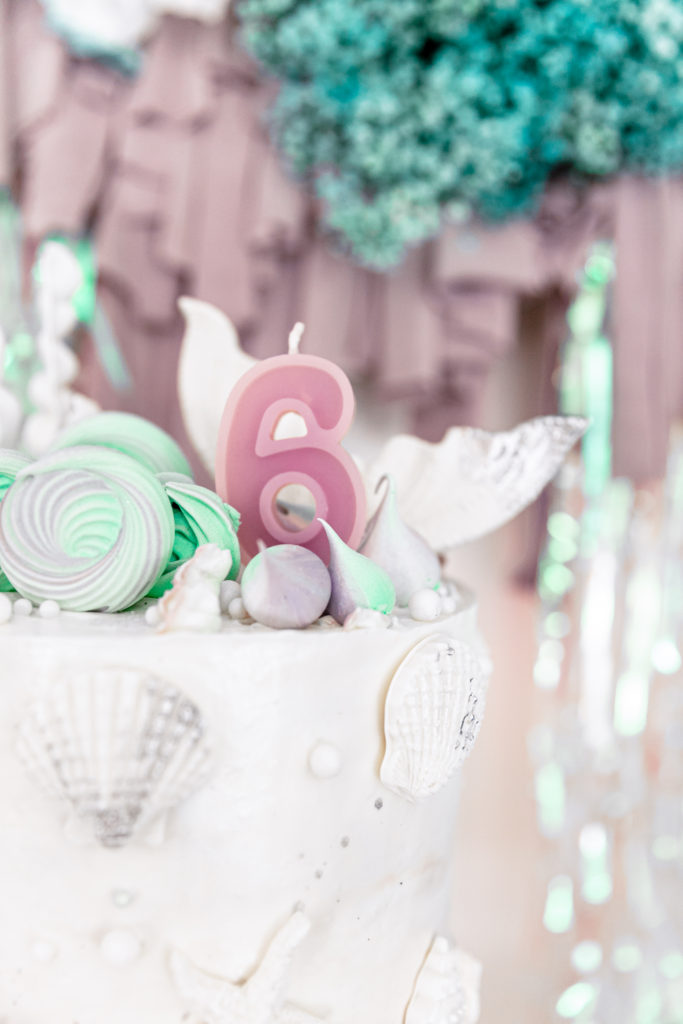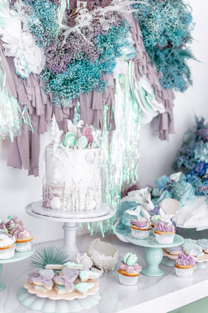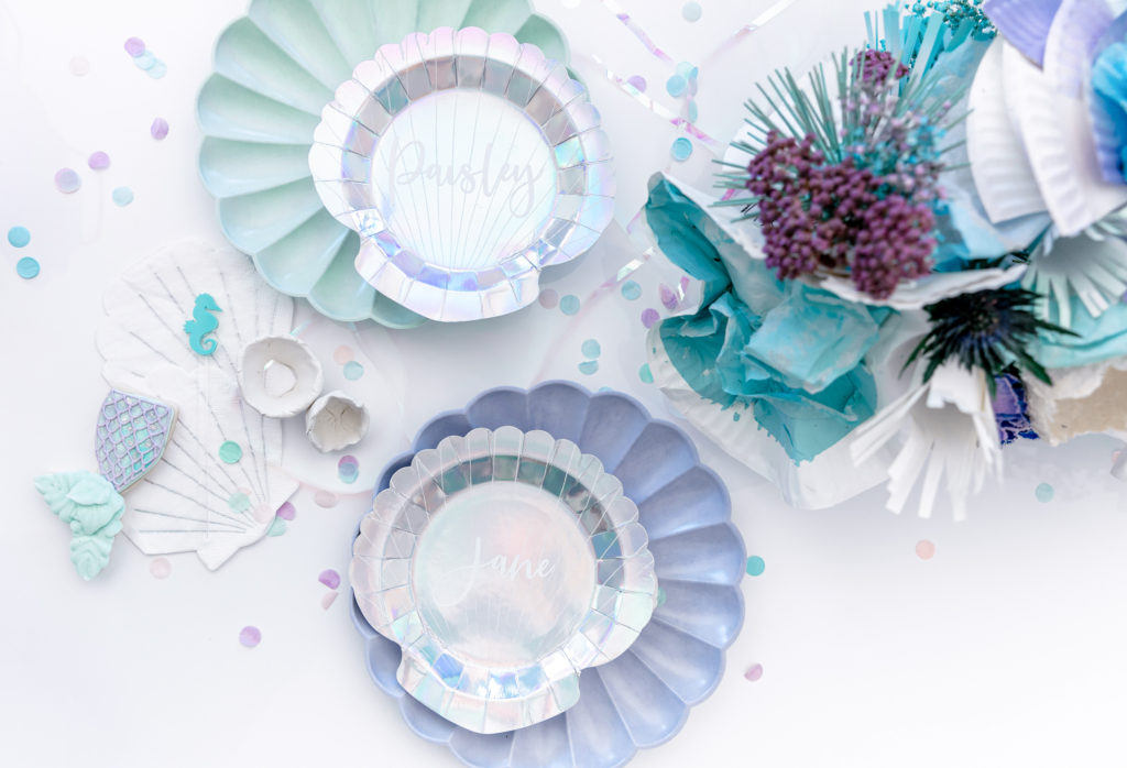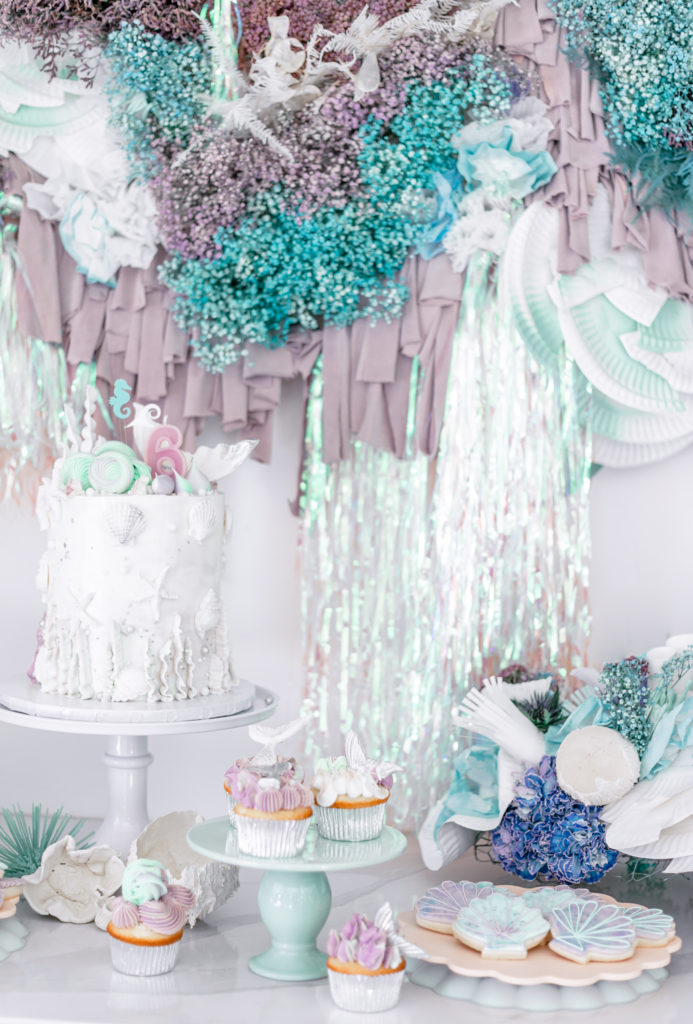 Royale chose all of the tabletop items, all by Meri Meri in fact, and I came to style them! We used their new eco friendly tabletop collection along with their mermaid collection and it fit so well together. In addition to the Meri Meri we added other items picked up from Bonjour Fete plus little sea urchins made by Alexis and details by Creative Amme. Guest’s names were on their little seashell plates and seahorse and wave stir sticks were in their cups! And of course iridescent streamers and sea shells were strung along the length of the table. Don’t you just love it?!