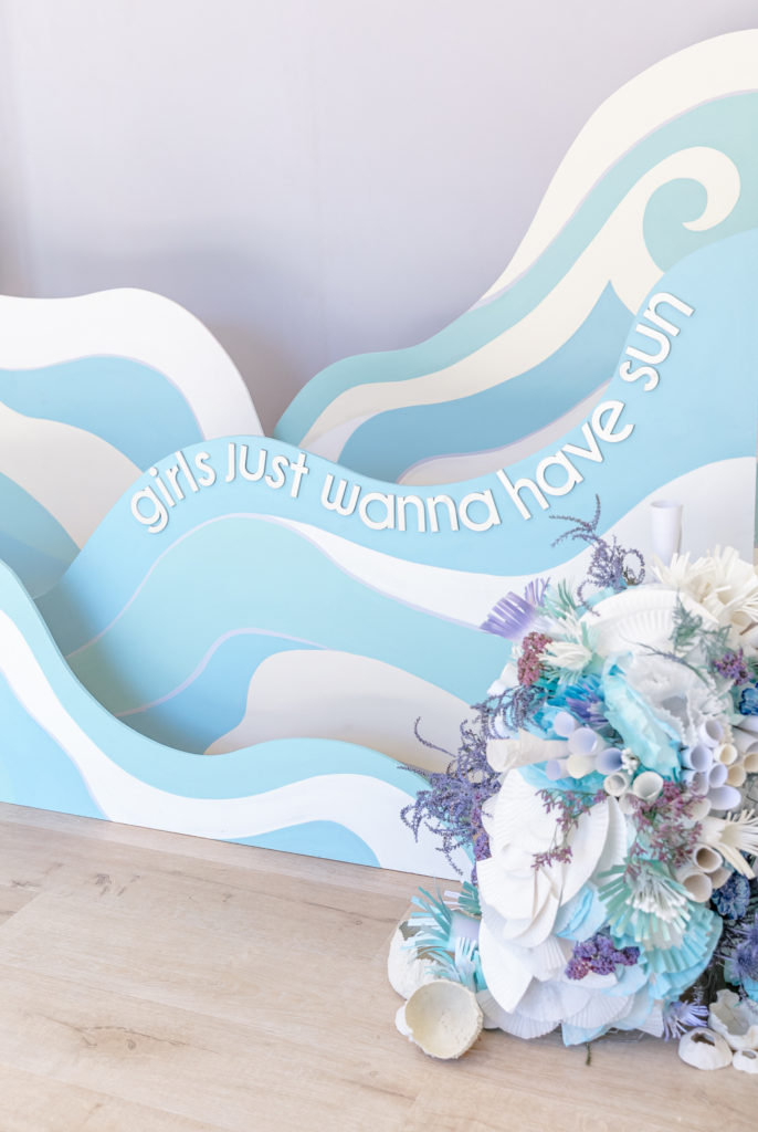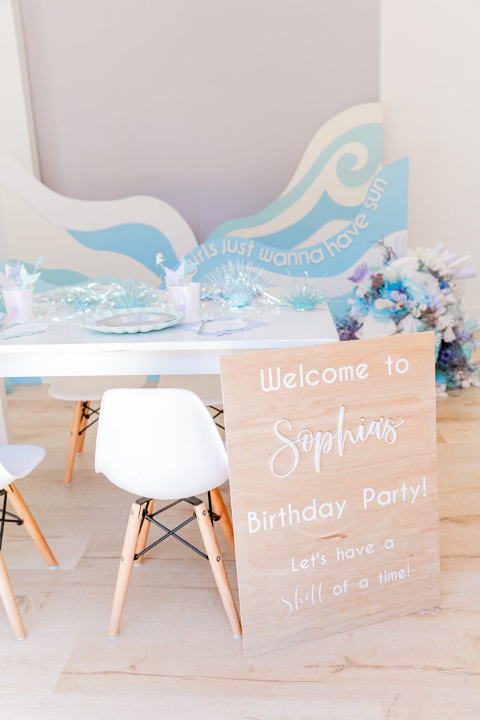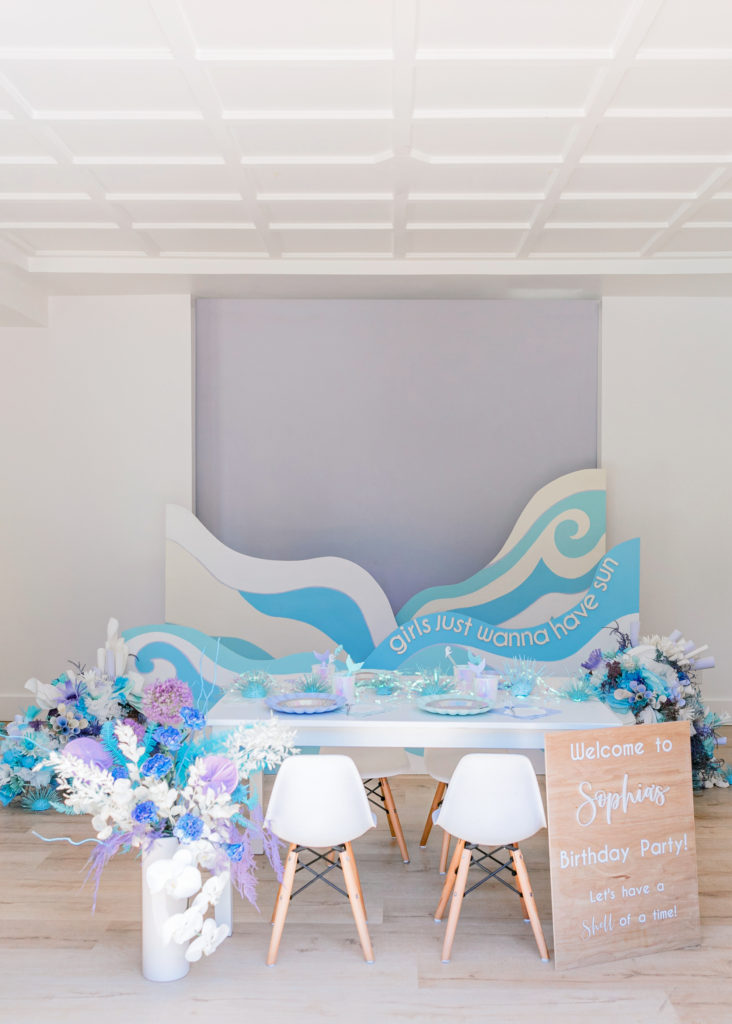 We placed the kid’s table in front of the waves and added flowers by Mustard Seed Florals. Speaking of talent, she really amazed me with hers!! Just wait till you see the beautiful arrangements she put together. We also added signage by Creative Amme in front of the table. She helped with all of the incredible details you’ll see through-out the party!