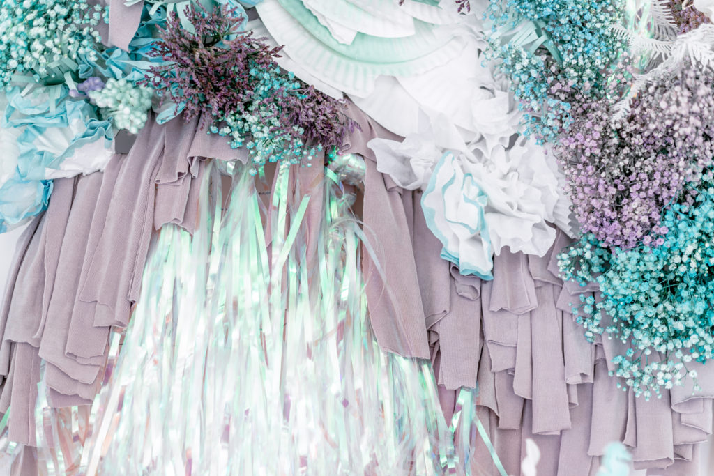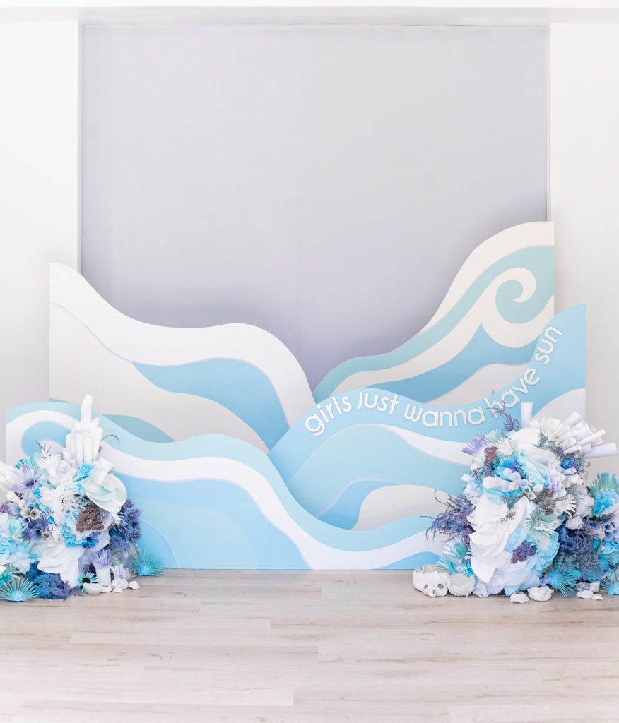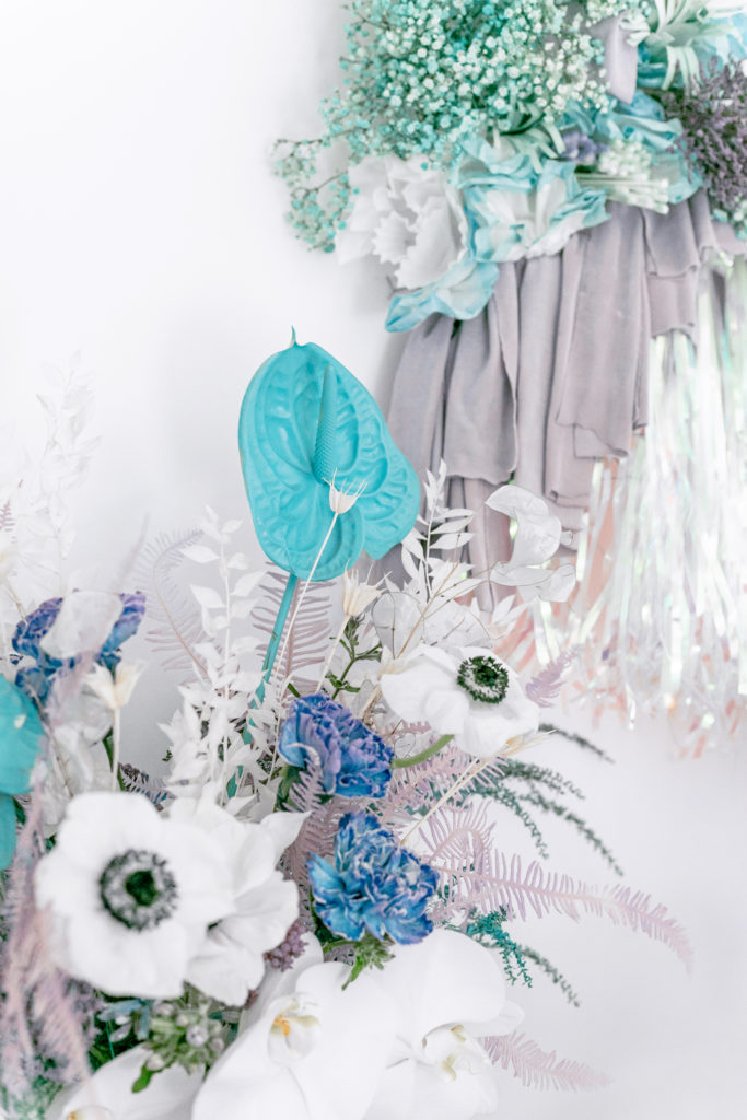 Like I said, taking that mermaid thing and truly making it her own!! Alexis created not one, but multiple amazing installs for this party. She is known for her creative and outside the box installations and this time she truly outdid herself! This one below was a wave installation that was layered and guests could stand in it making them look like they were in the waves of the ocean! She used shades of blue and purple along with iridescents for this take on mermaid fun which I loved, a step away from pink.