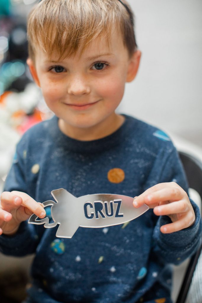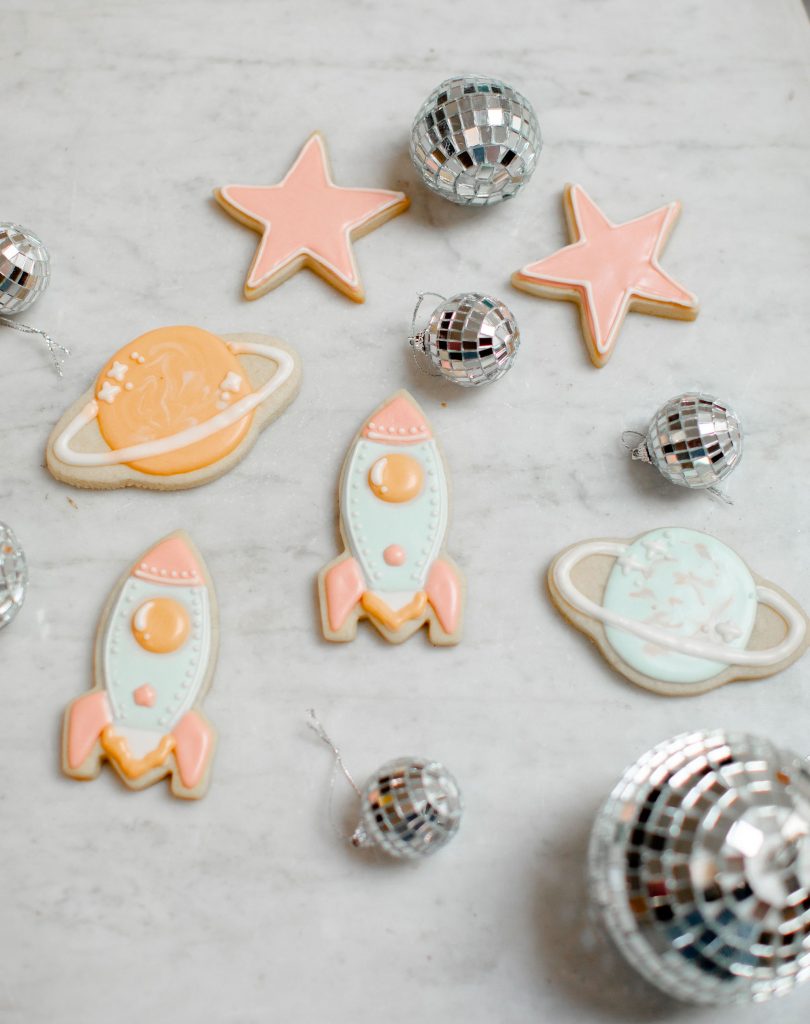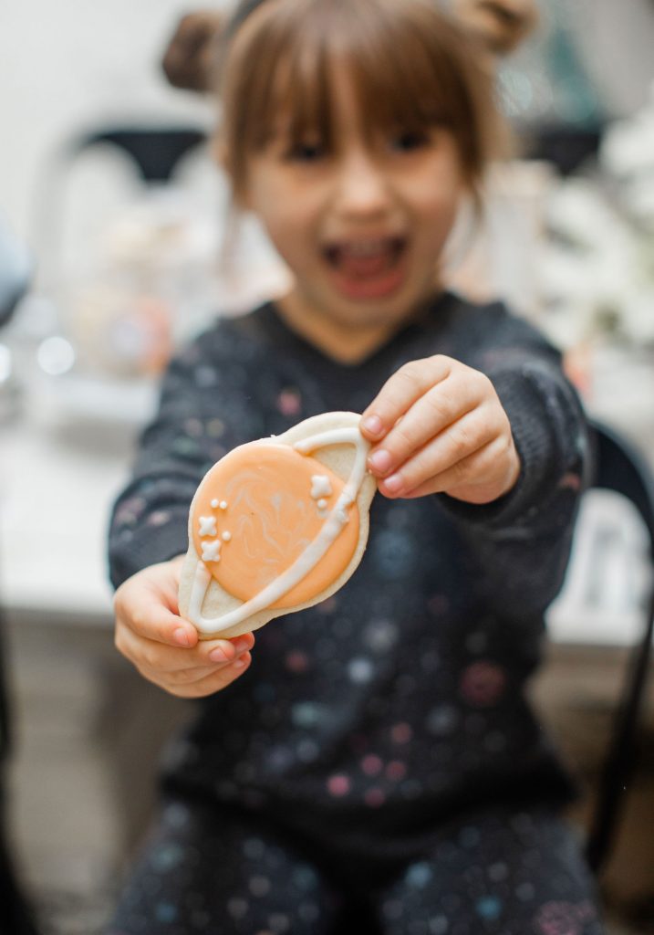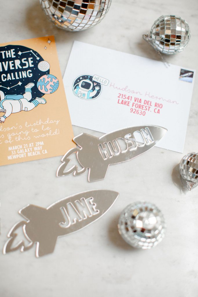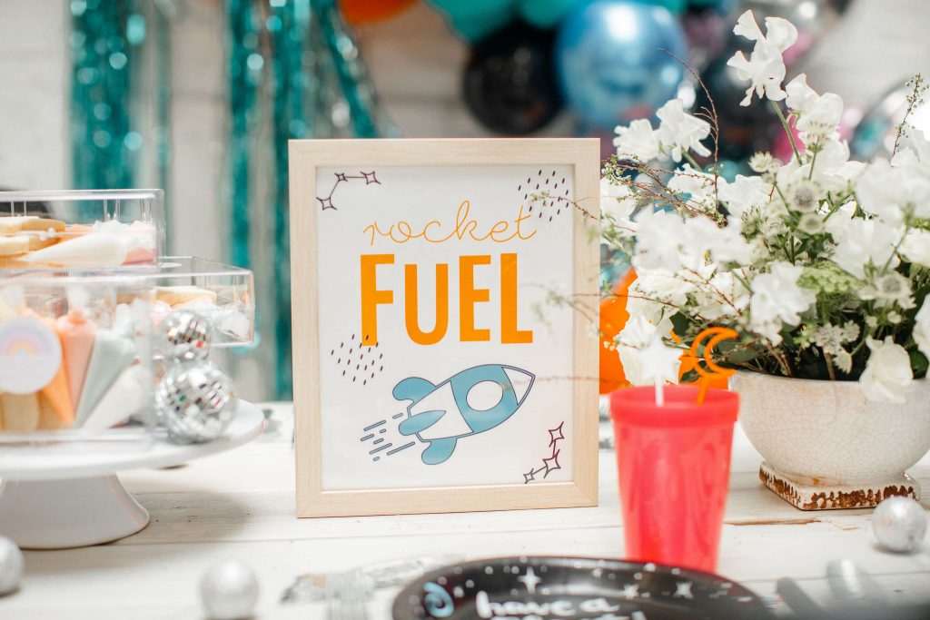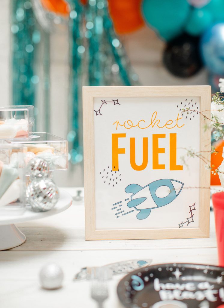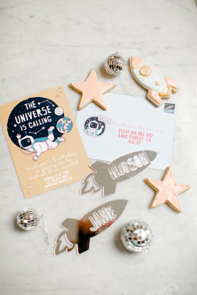Always gotta start a good party with a good invitation!! This one by Poppy Jack Shop is available to download off of her site! Like we told you, we did our best to make this party accessible and easy for you to throw at home! Poppy Jack Shop also handled all the adorable details like these cute rocket ship place cards, more on the cookies by Really Cute Sweets later…