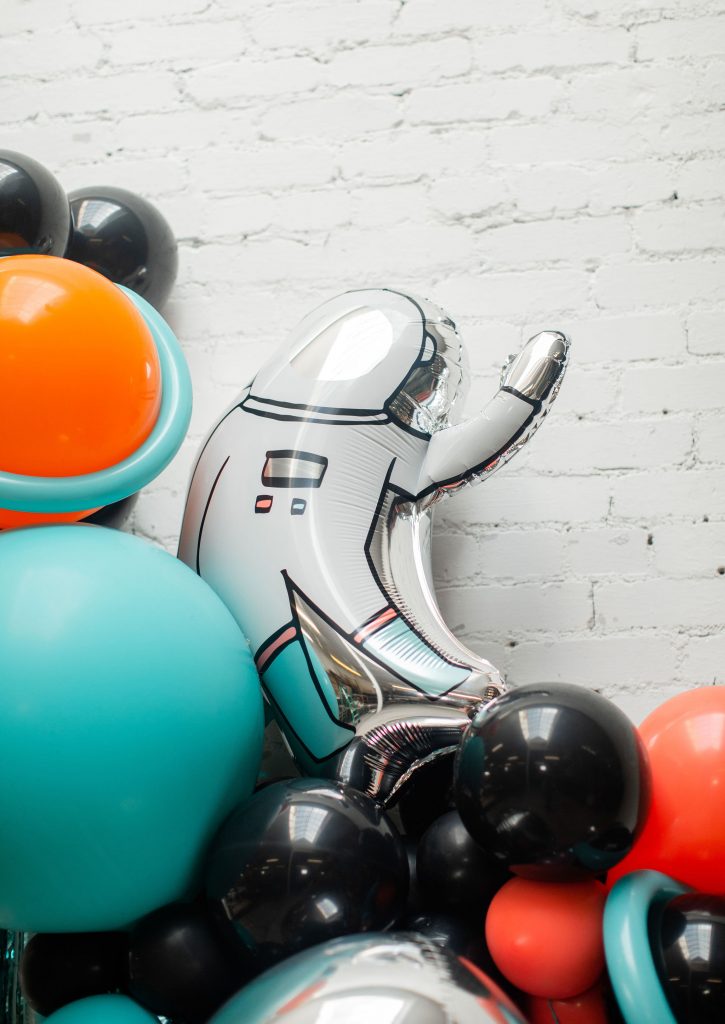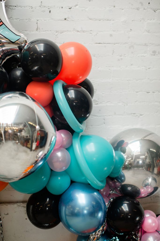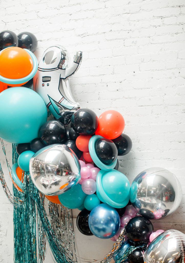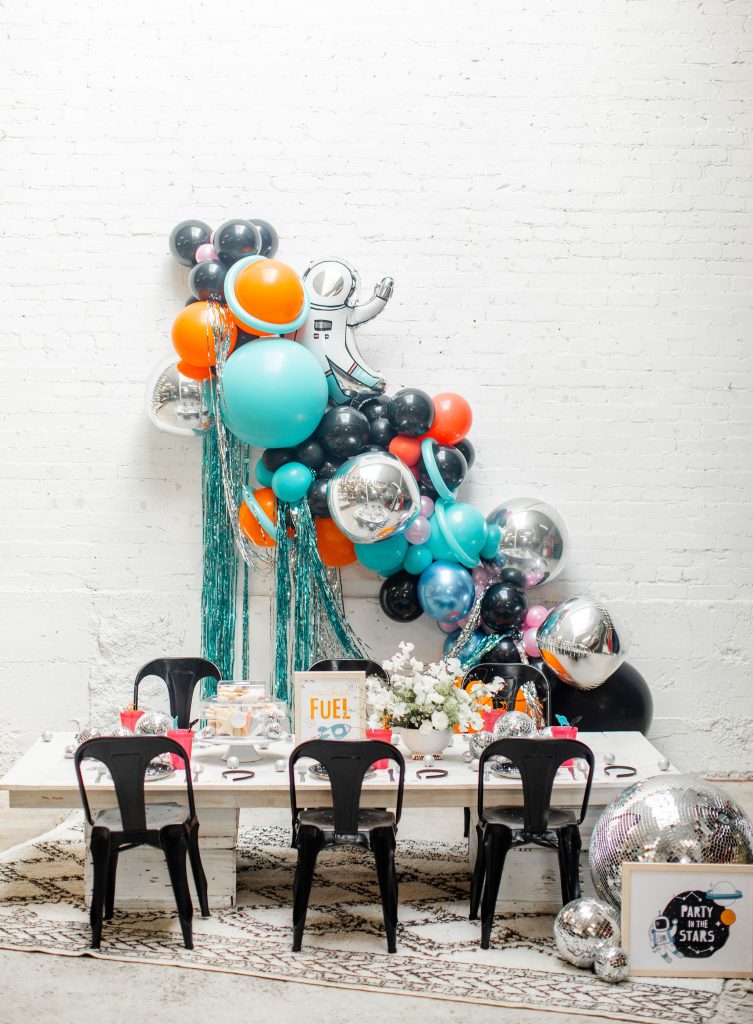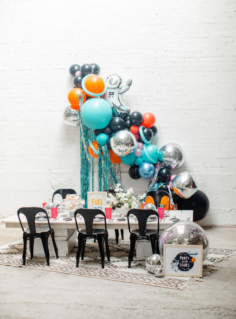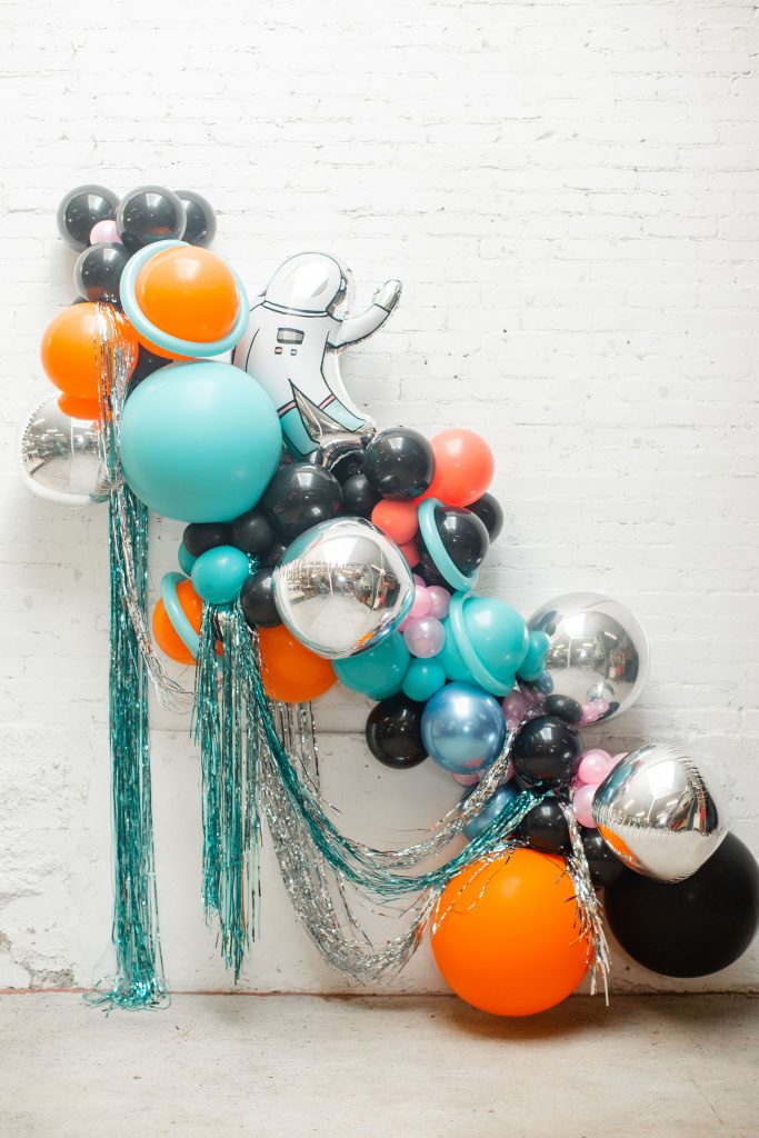 For the balloons, Ellen used her own and added in this cute astronaut dude from Target, along with silver and turquoise fringe, both from Target as well! My favorite is the metallic touches and how she made Saturns out of a few balloons!