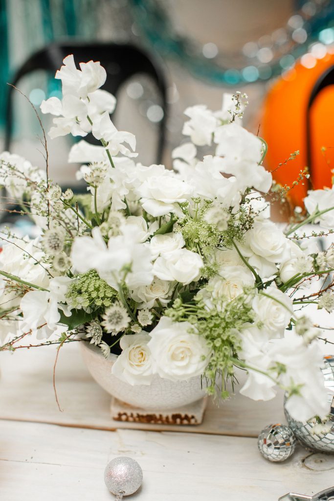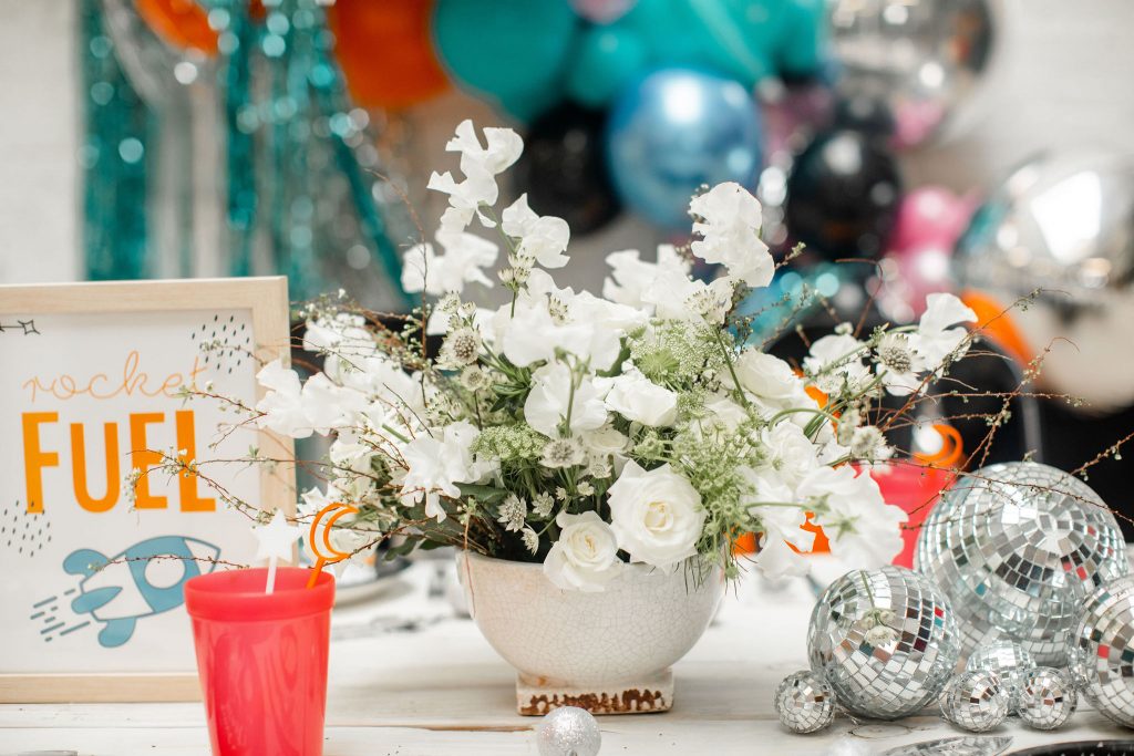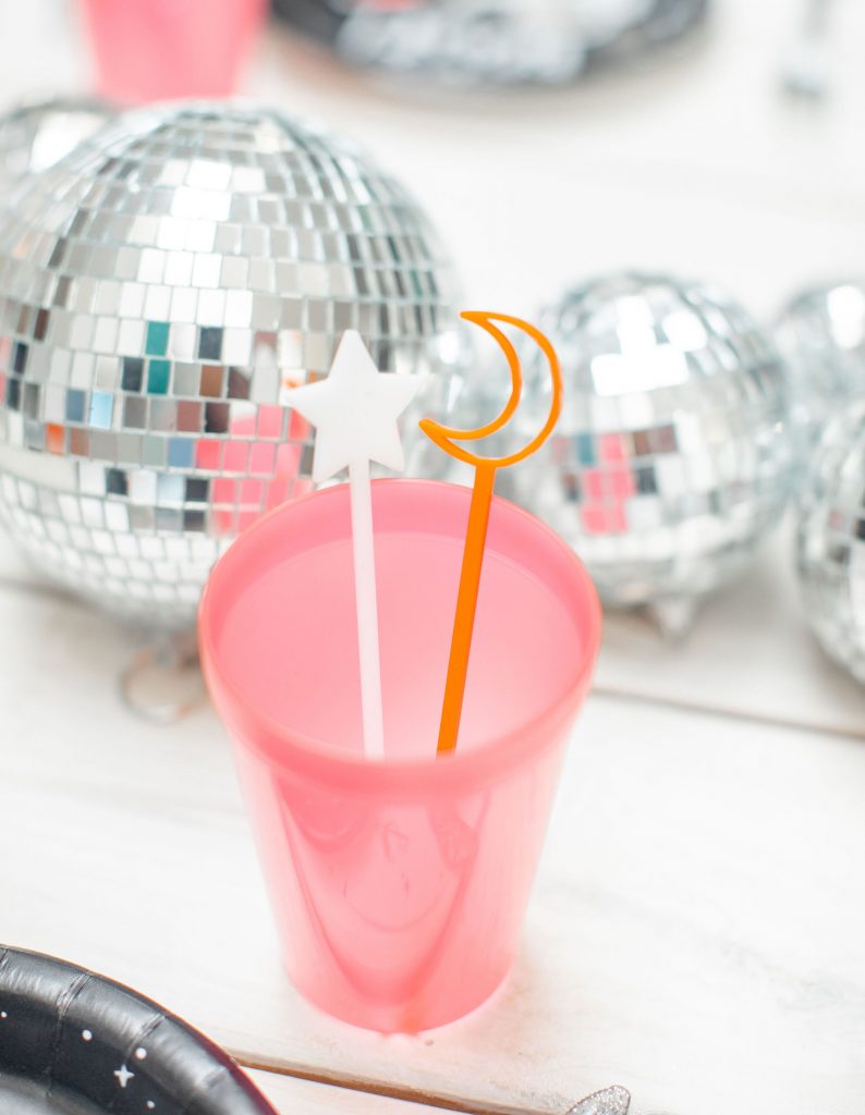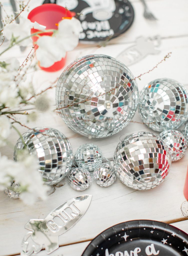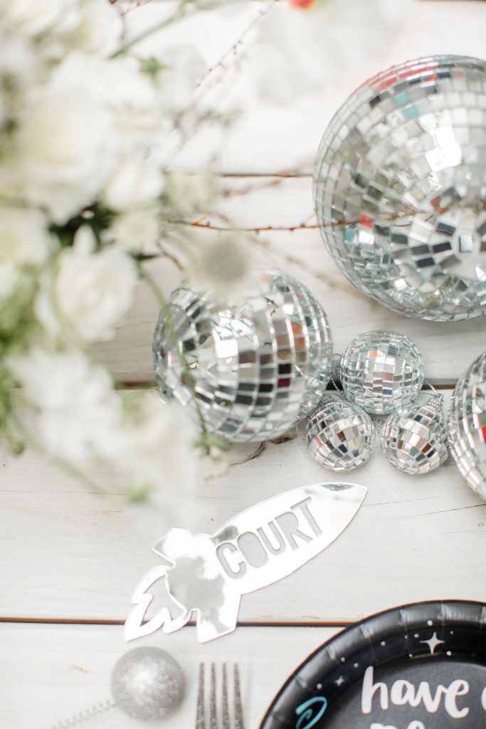 You may have noticed all of the fun disco balls at this cute party! Trying to find other ways to adorn the table without flowers I thought of these bad boys! Disco balls are fun and eye-catching and make quite the impact, without needing too many! You could also do fun glitter or a table runner, but either way, adding something else along the length of your table besides florals is all about using your imagination!
