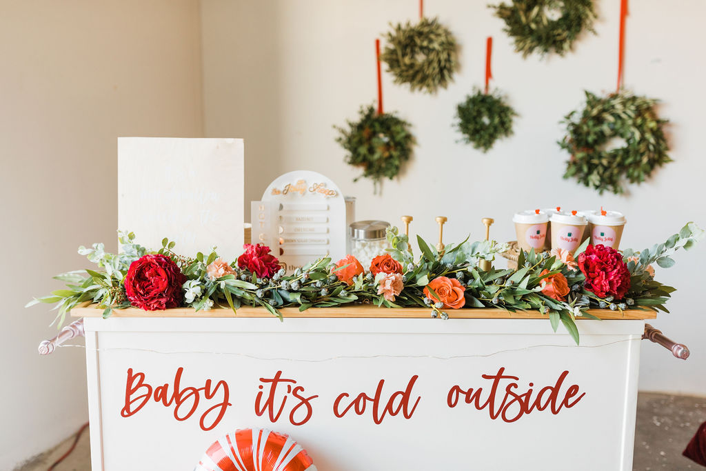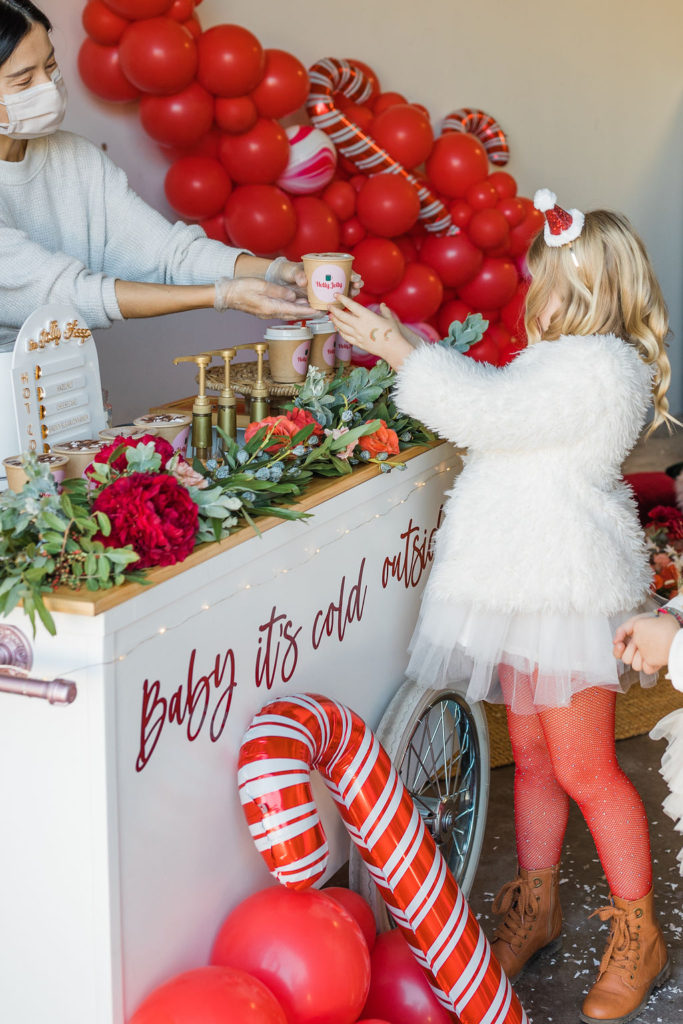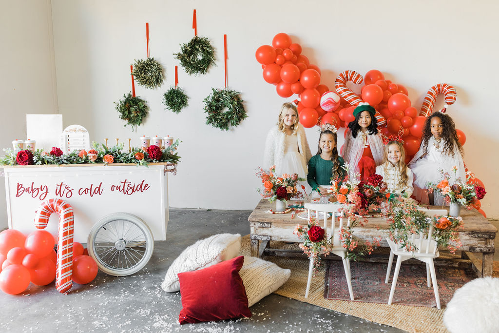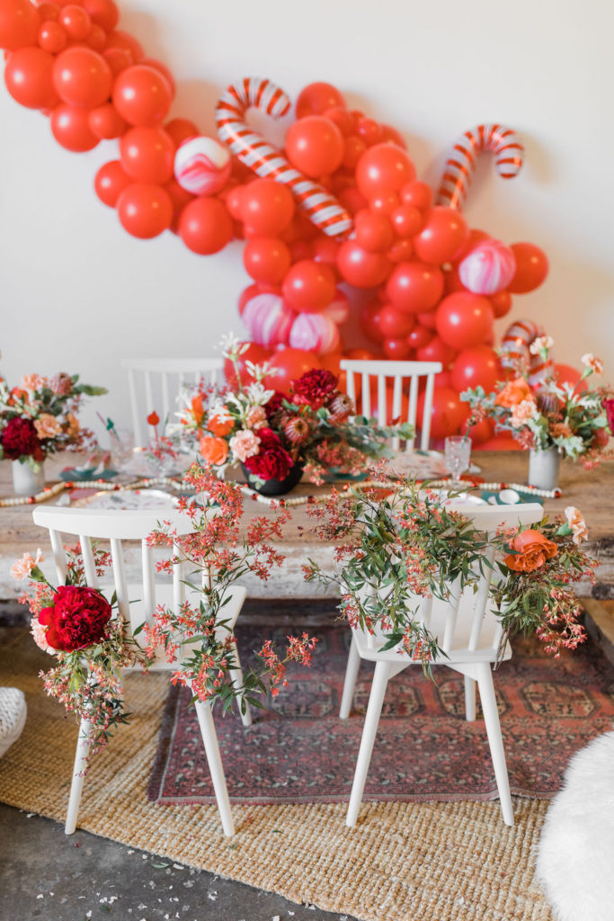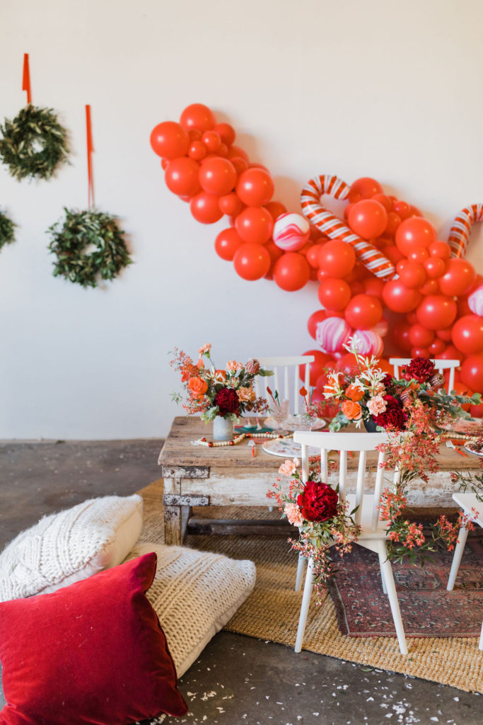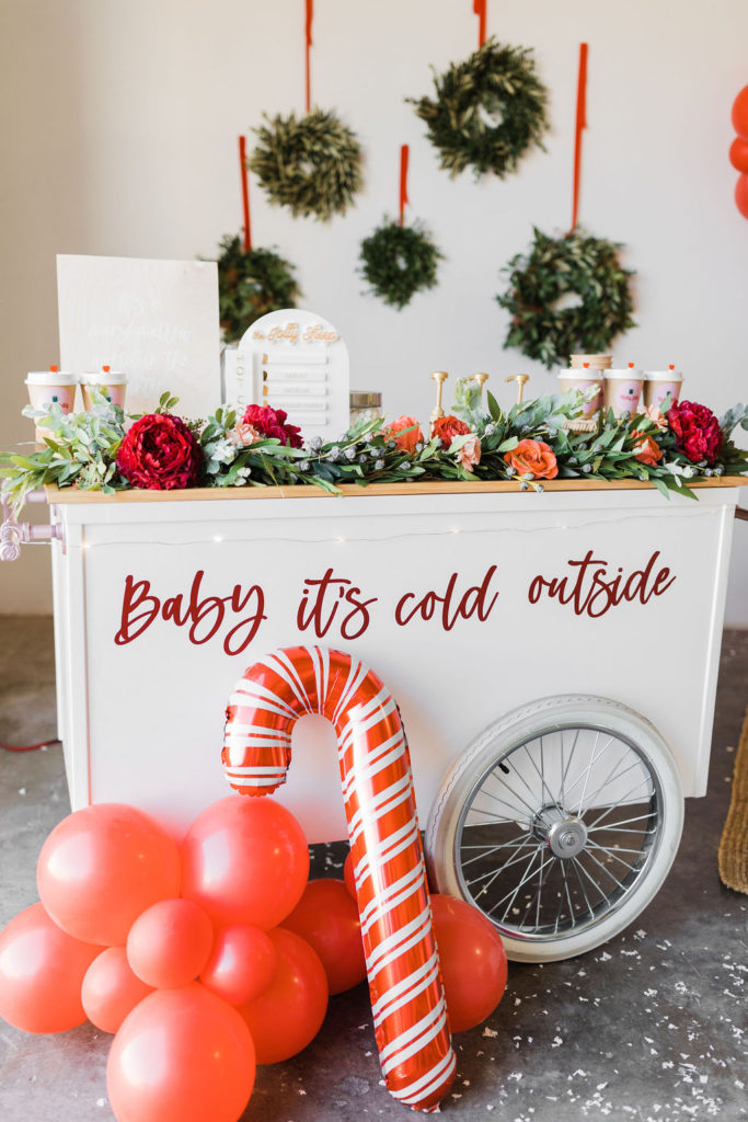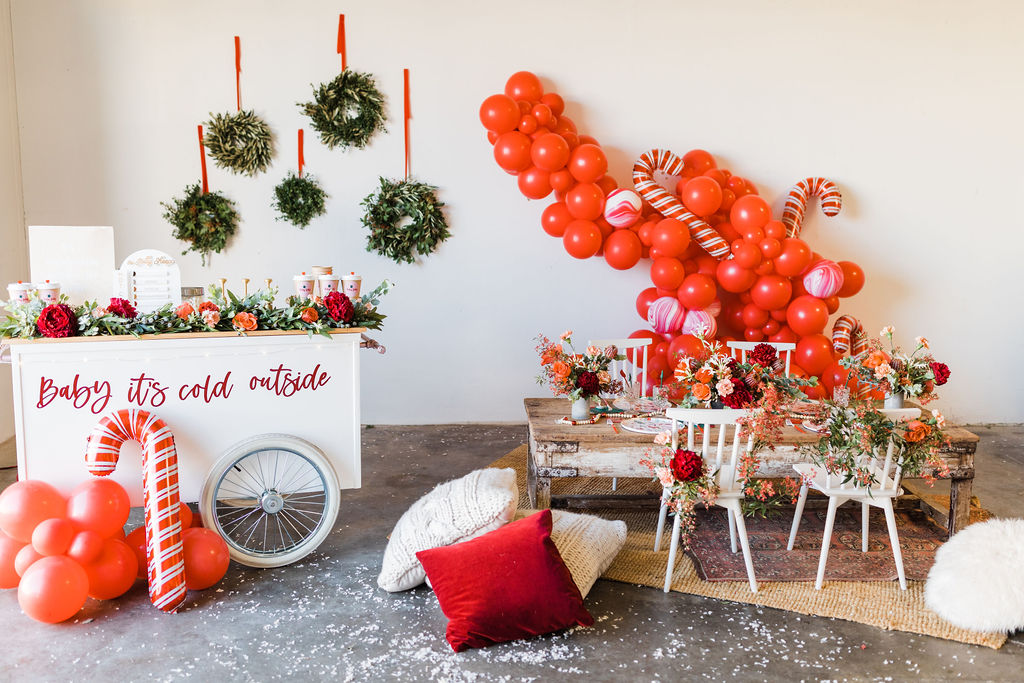 This setup is pretty epic!! A Christmas dreamland, are we in Santa’s workshop?! The prettiest balloon garland complete with Candy Canes by The Pop Shop, check! An adorable Hot Cocoa cart from The Jolly Sheep, check! Beautiful holiday wreaths and florals by Wild Darling Floral, check! And the coziest table & chair set up from Sweet Salvage Rentals, check!!