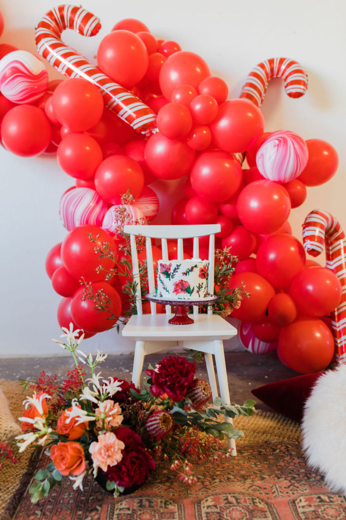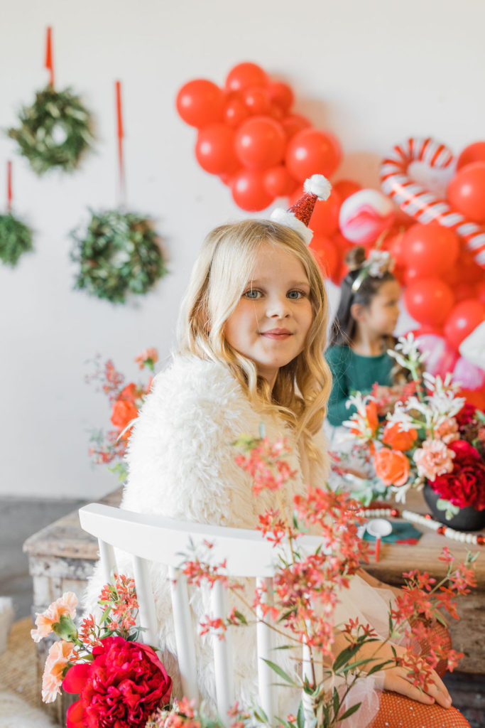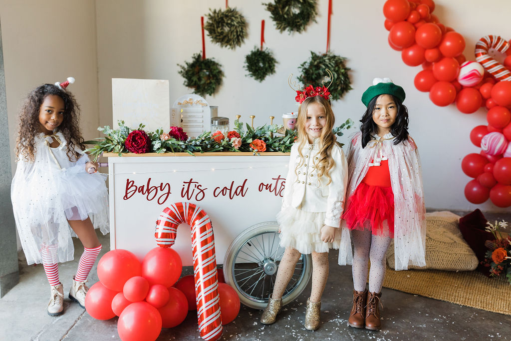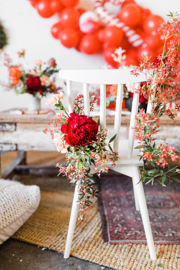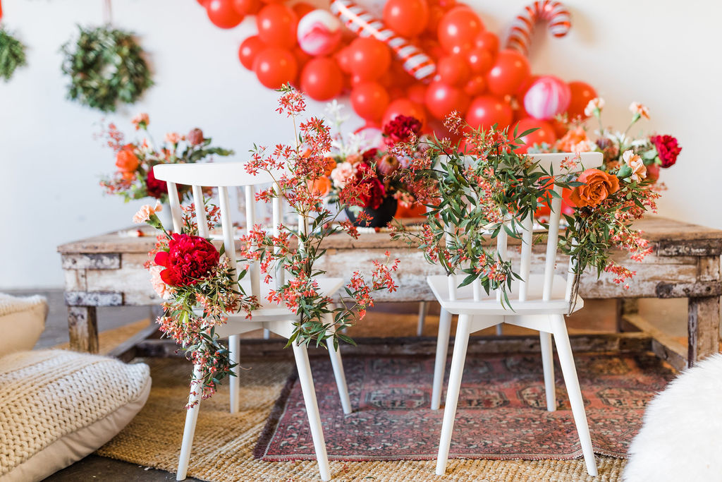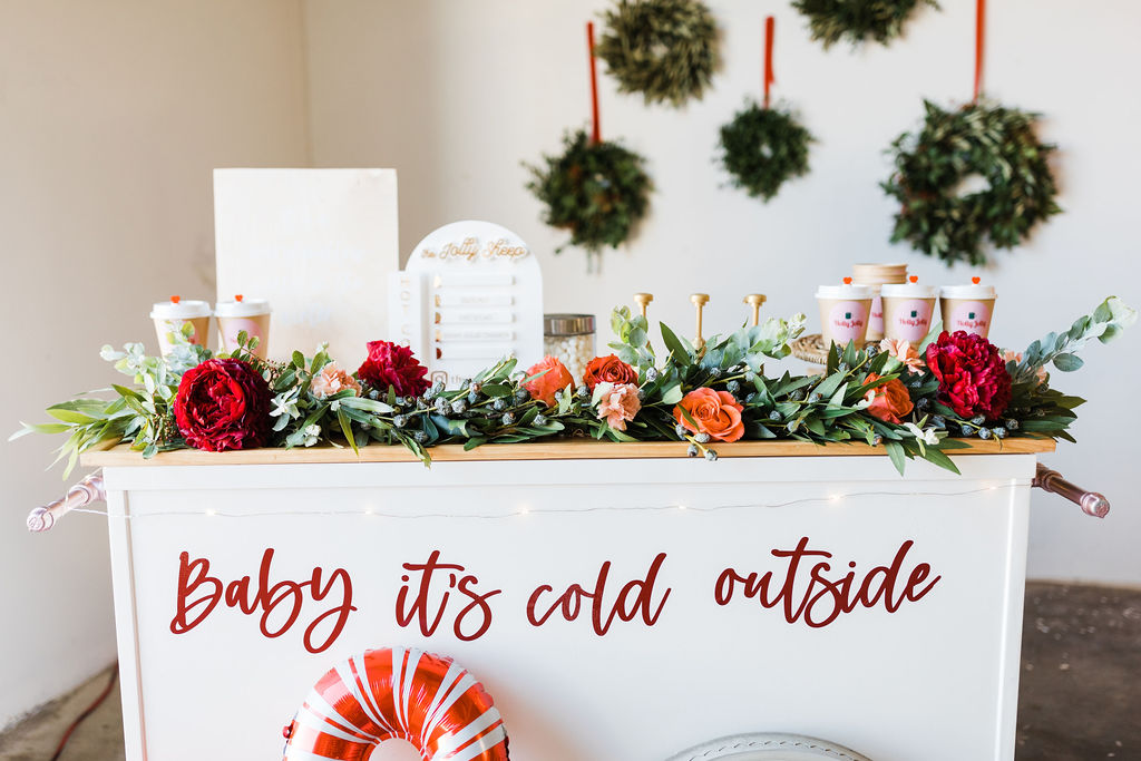 This setup is pretty epic!! A Christmas dreamland, are we in Santa’s workshop?! The prettiest balloon garland complete with Candy Canes by The Pop Shop, check! An adorable Hot Cocoa cart from The Jolly Sheep, check! Beautiful holiday wreaths and florals by Wild Darling Floral, check! And the coziest table & chair set up from Sweet Salvage Rentals, check!!