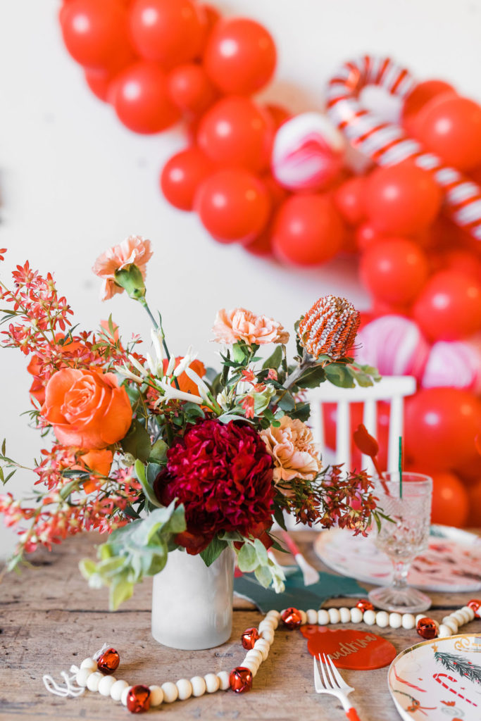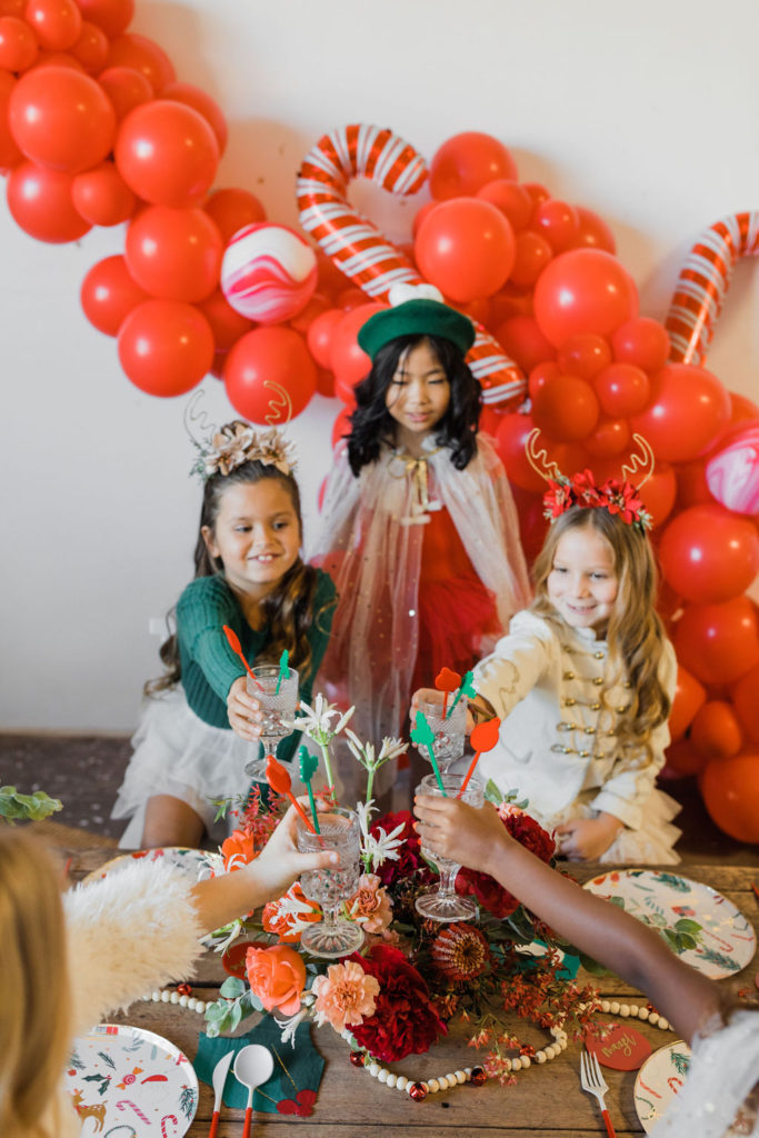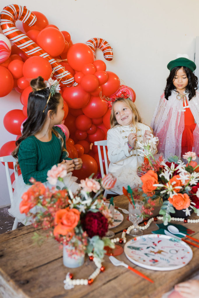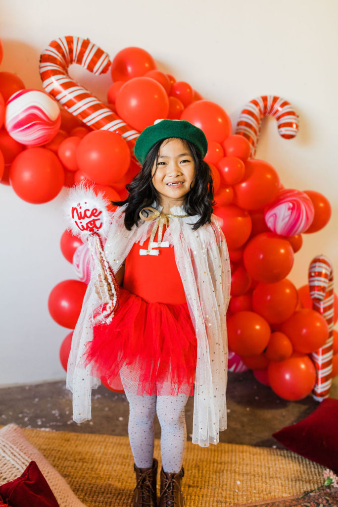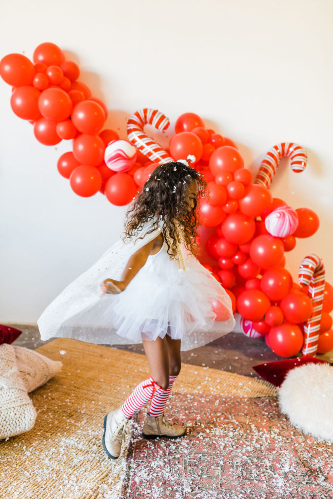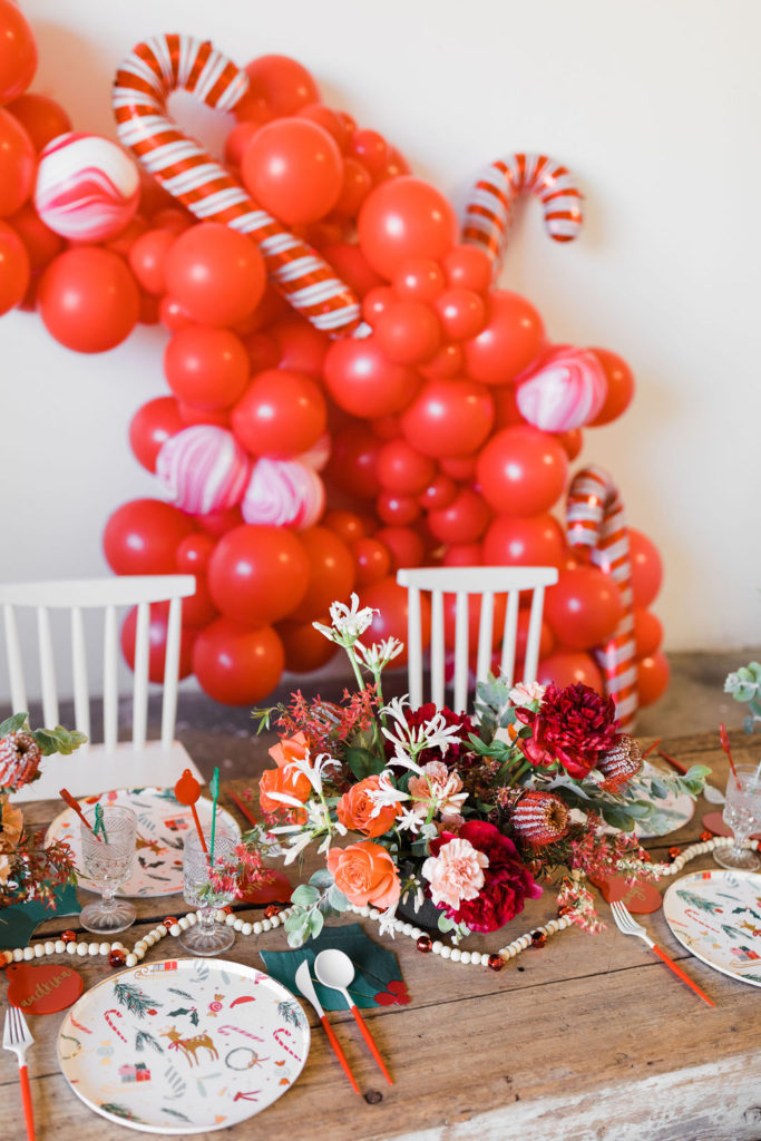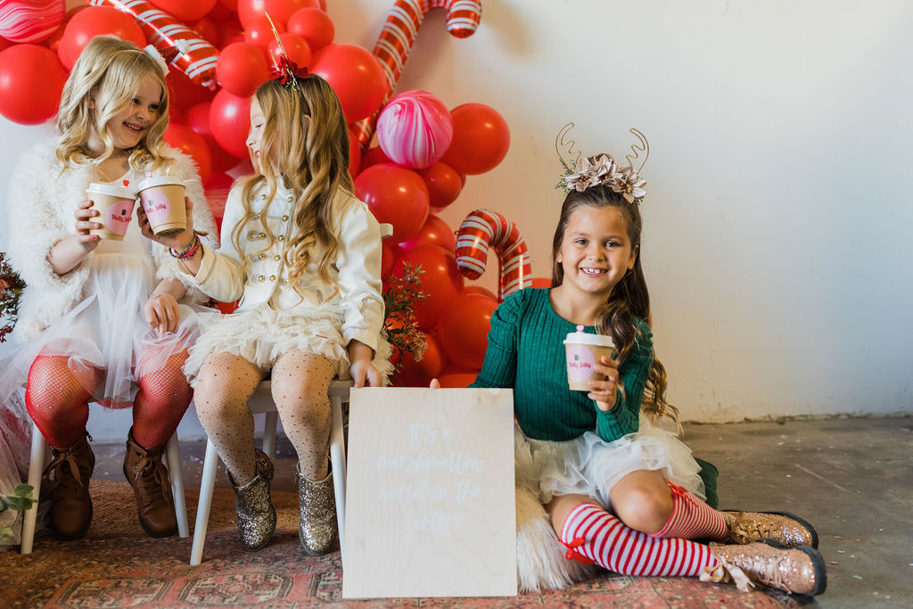 This setup is pretty epic!! A Christmas dreamland, are we in Santa’s workshop?! The prettiest balloon garland complete with Candy Canes by The Pop Shop, check! An adorable Hot Cocoa cart from The Jolly Sheep, check! Beautiful holiday wreaths and florals by Wild Darling Floral, check! And the coziest table & chair set up from Sweet Salvage Rentals, check!!