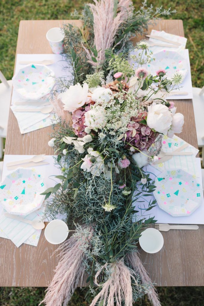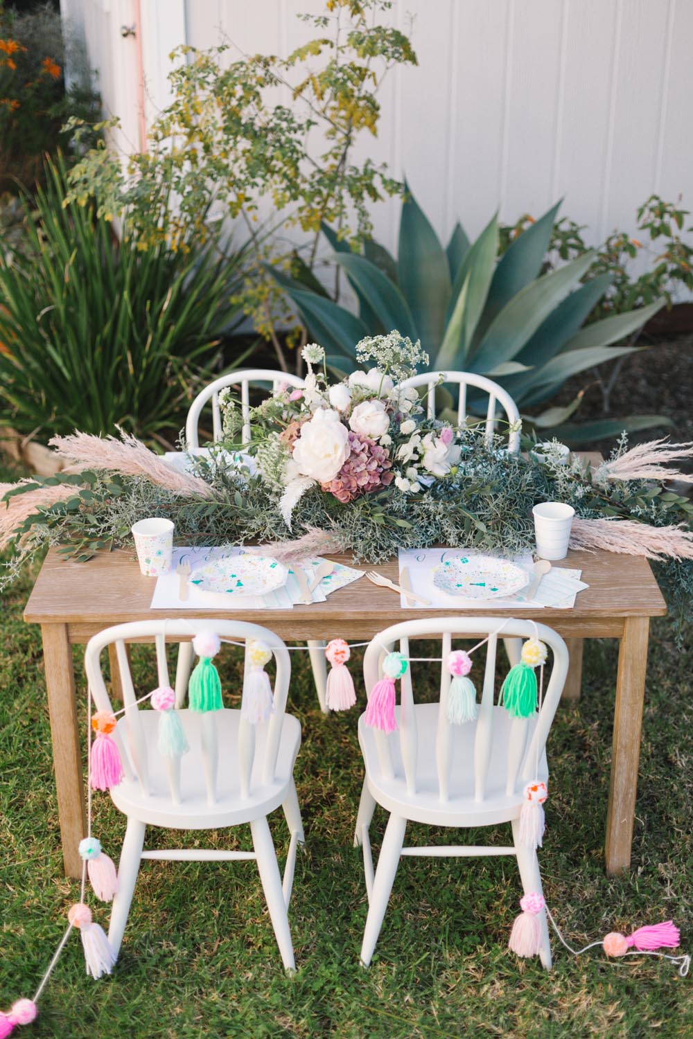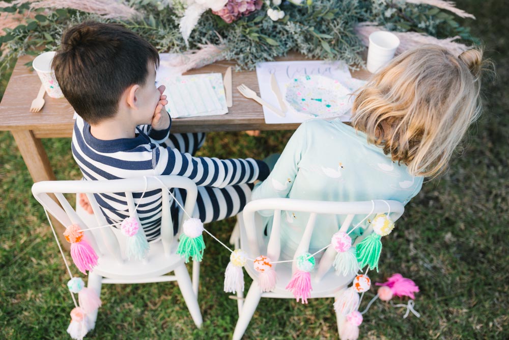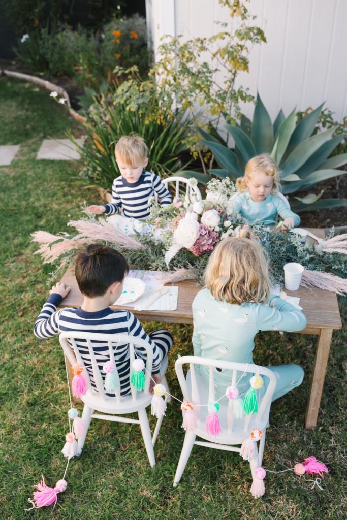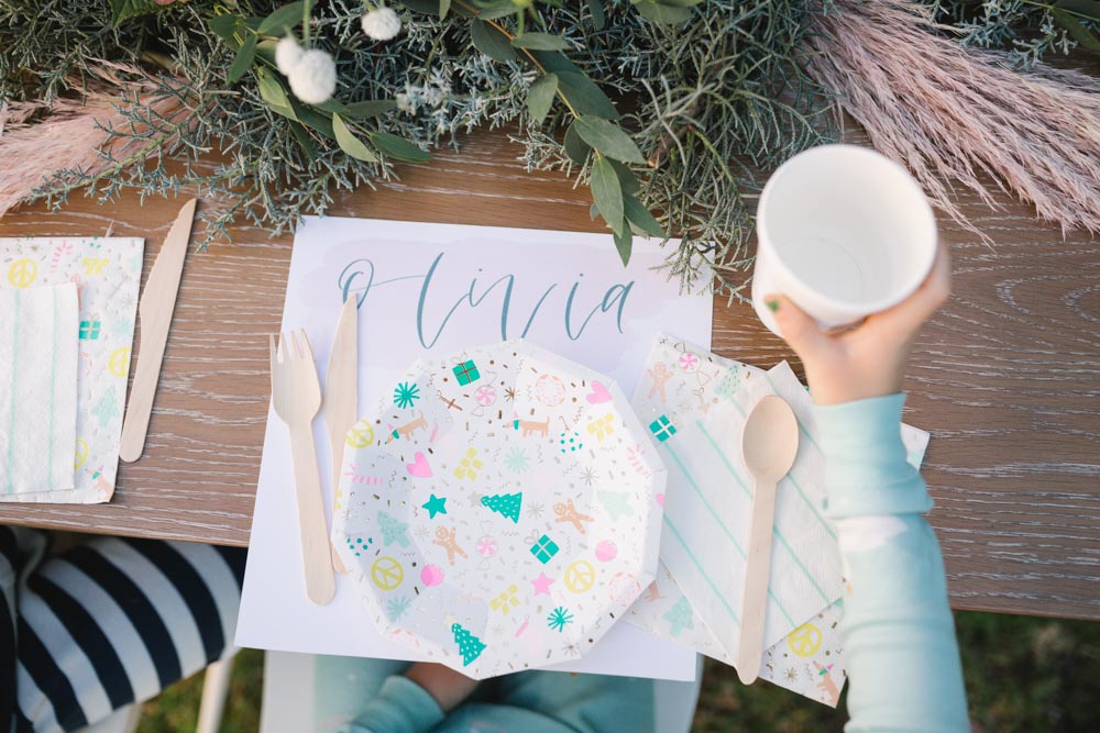 MV Florals did the prettiest winter floral arrangement and garland to adorn our table. A mixture of Christmas greens, cotton and dusty pinks was the perfect touch. Our table was set with the cutest holiday party ware from Daydream Society. I always love what they come up with for each holiday!! We even used their Pom Pom garland in collaboration with Julie from Shop Leo Kids on our chairs and table from Pottery Barn Kids!