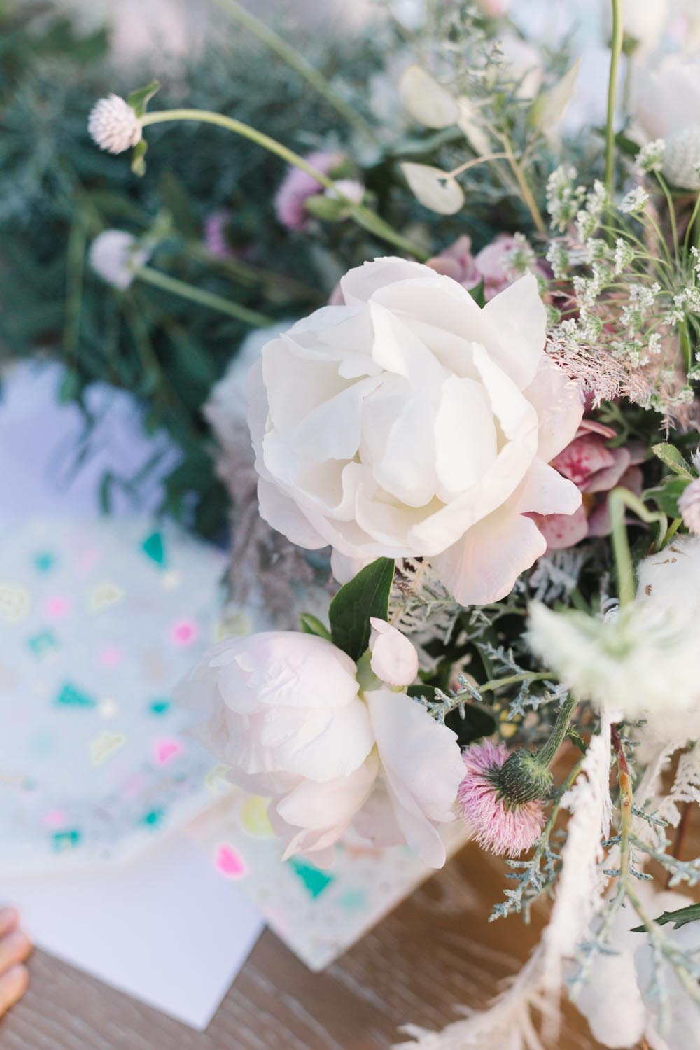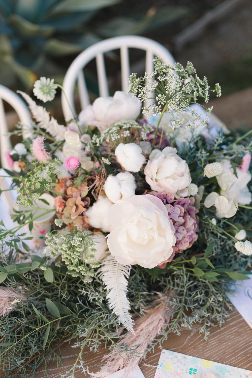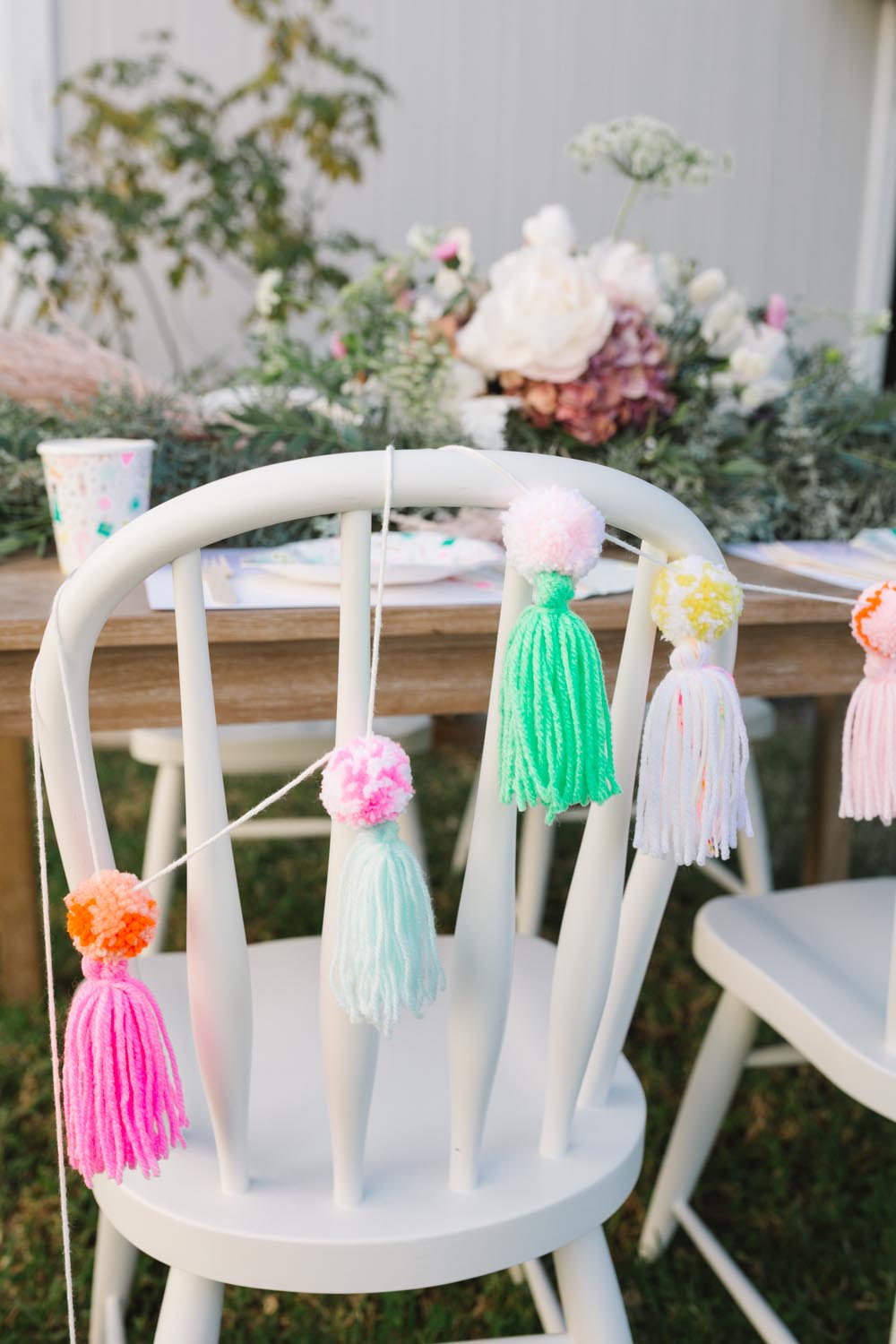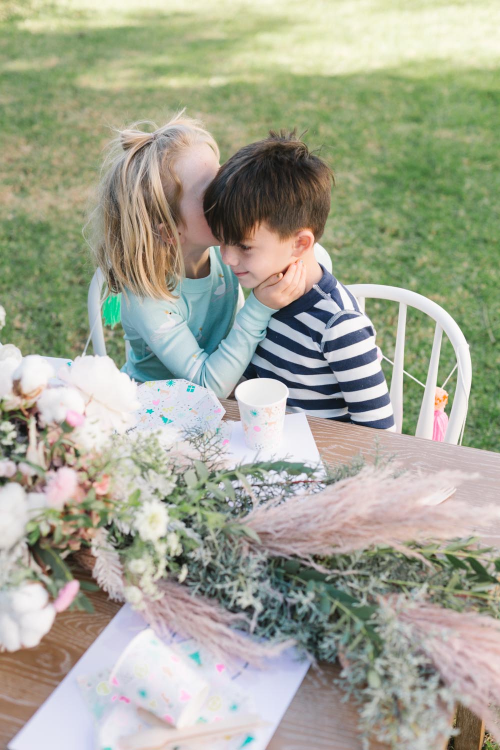 MV Florals did the prettiest winter floral arrangement and garland to adorn our table. A mixture of Christmas greens, cotton and dusty pinks was the perfect touch. Our table was set with the cutest holiday party ware from Daydream Society. I always love what they come up with for each holiday!! We even used their Pom Pom garland in collaboration with Julie from Shop Leo Kids on our chairs and table from Pottery Barn Kids!