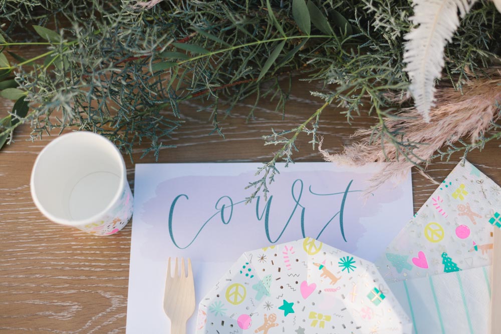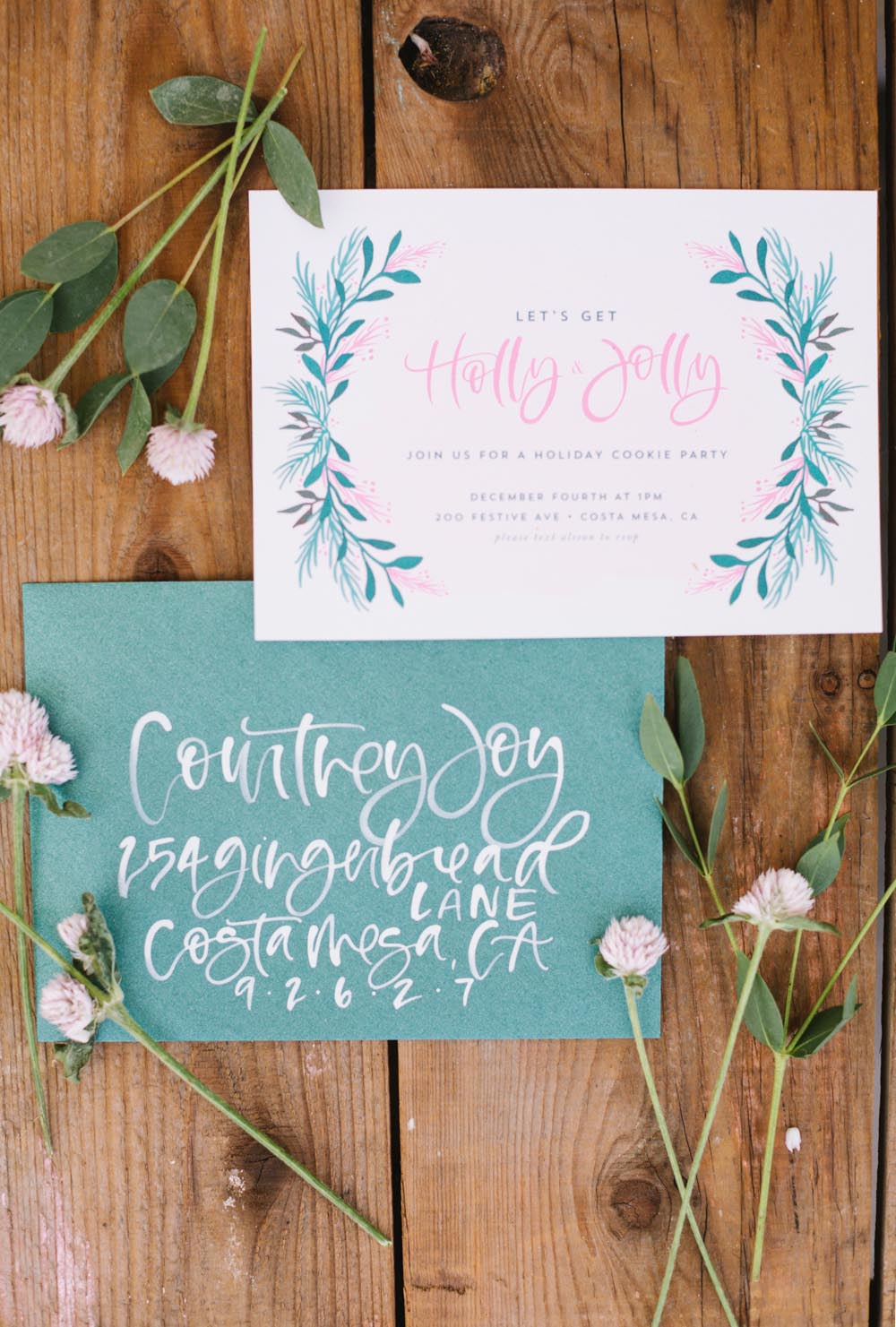 Bare Ink Co created this festive invite. At Beijos we tend to try and steer away from so much red, so we are all about that PINK & GREEN!! Isn’t her hand lettering on the envelope so pretty?! Now let’s get Holly & Jolly!!!