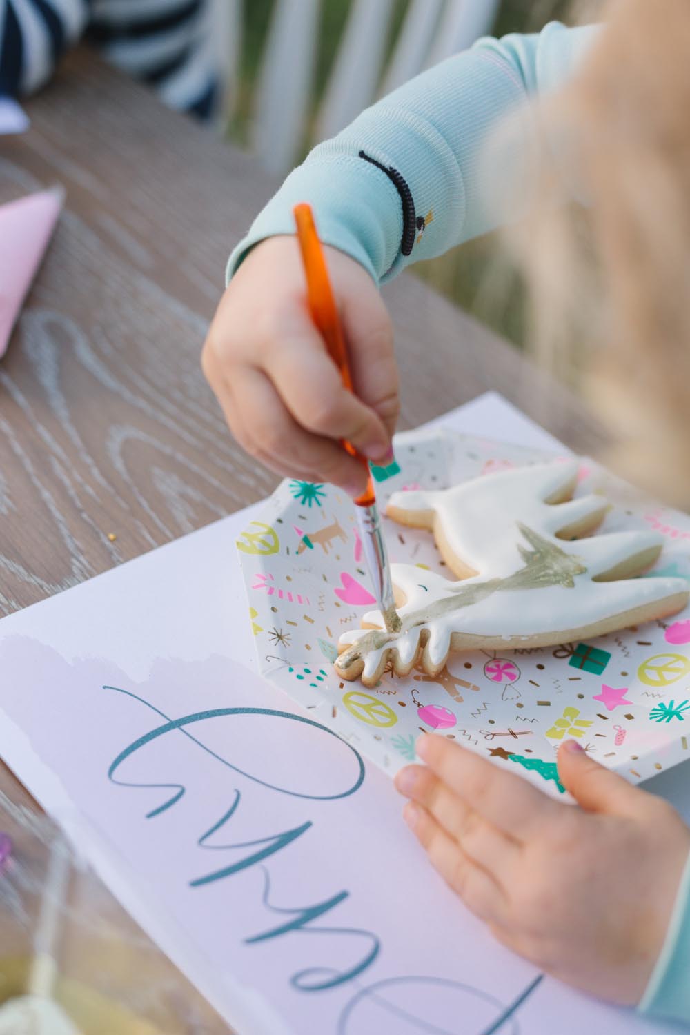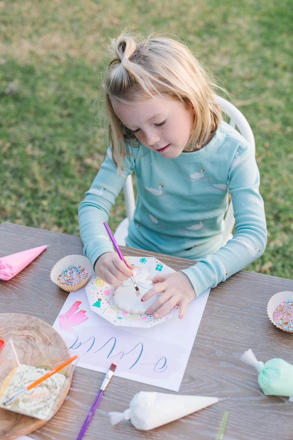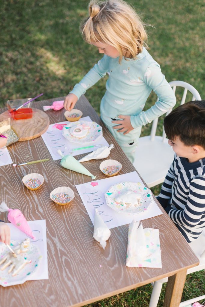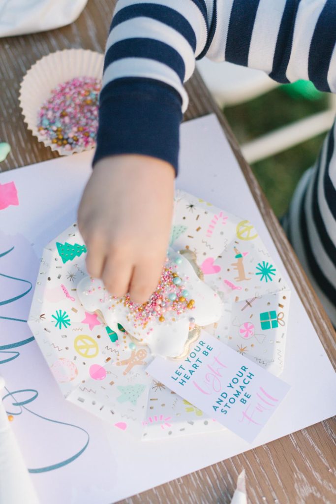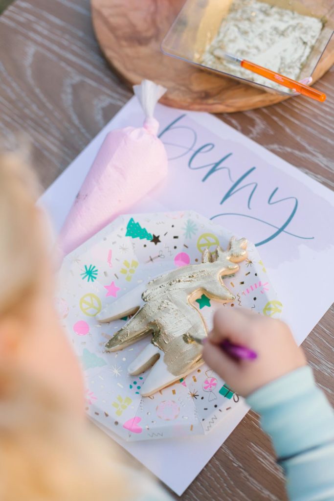The table was set outside – and let me tell you why… When you live in Southern California and it’s 75 degrees, you take advantage of it! Haha! Cookie decorating can get messy, so an outside mess is always better than an inside mess, can I get an amen from all my other mommies out there?!