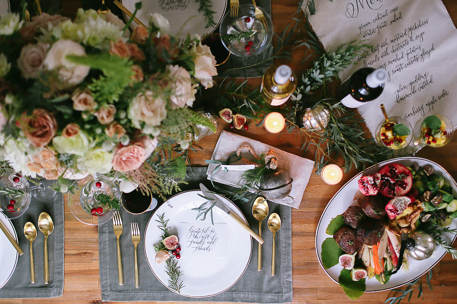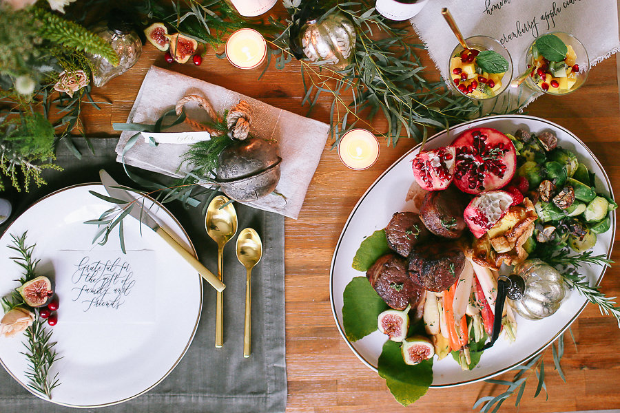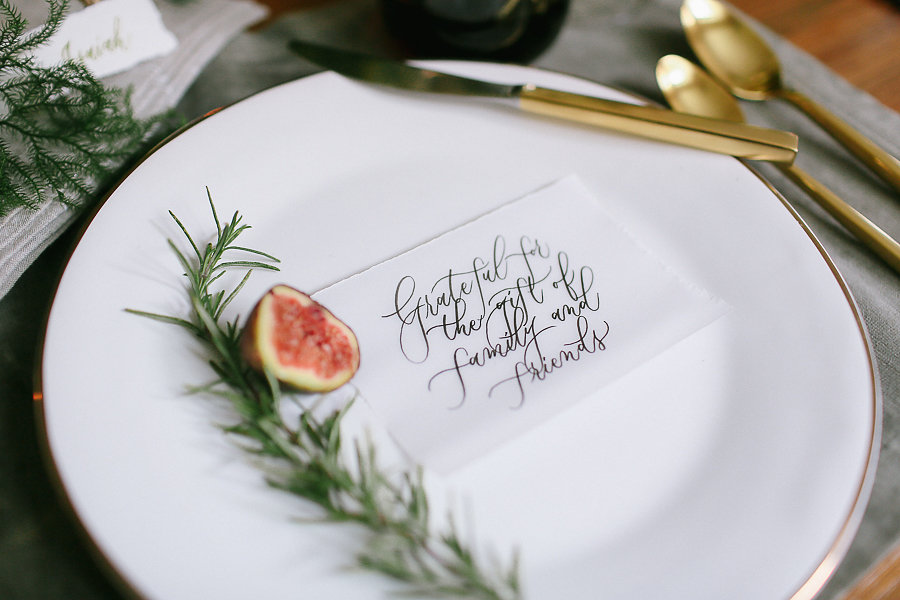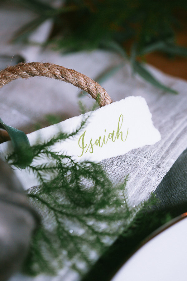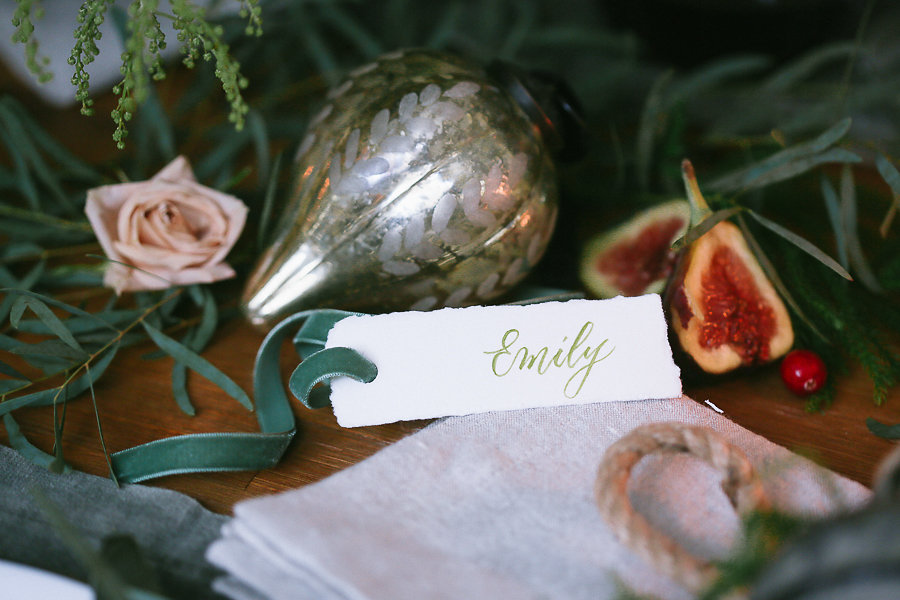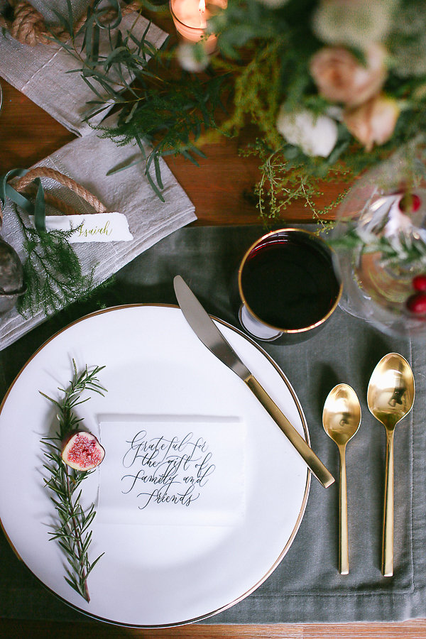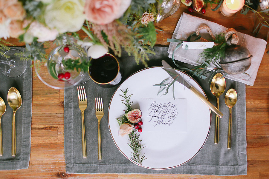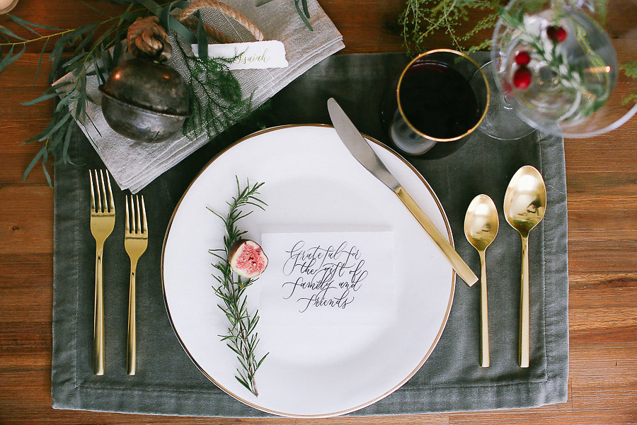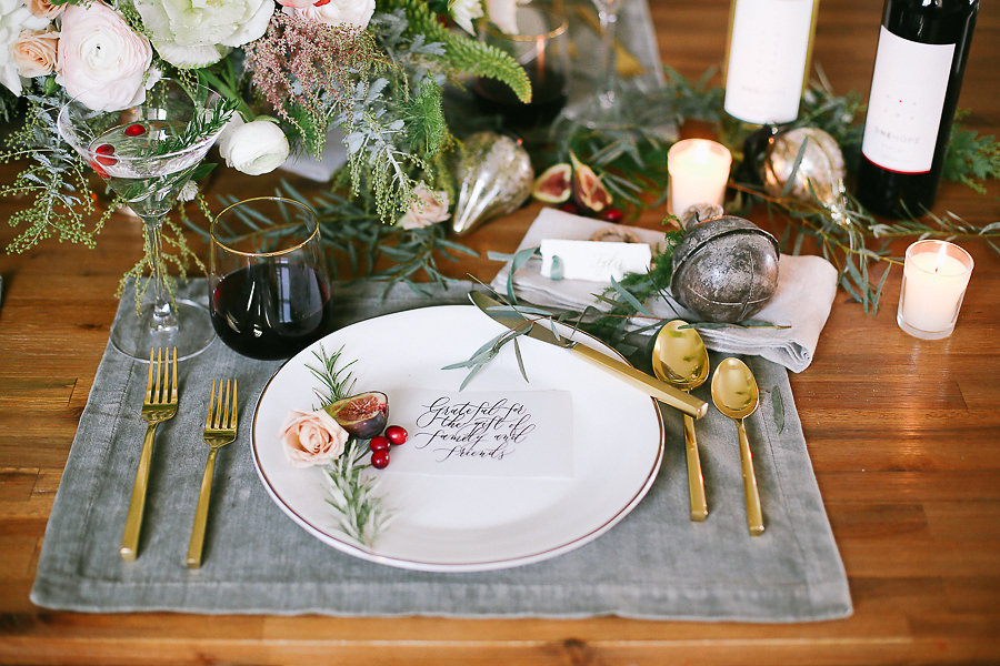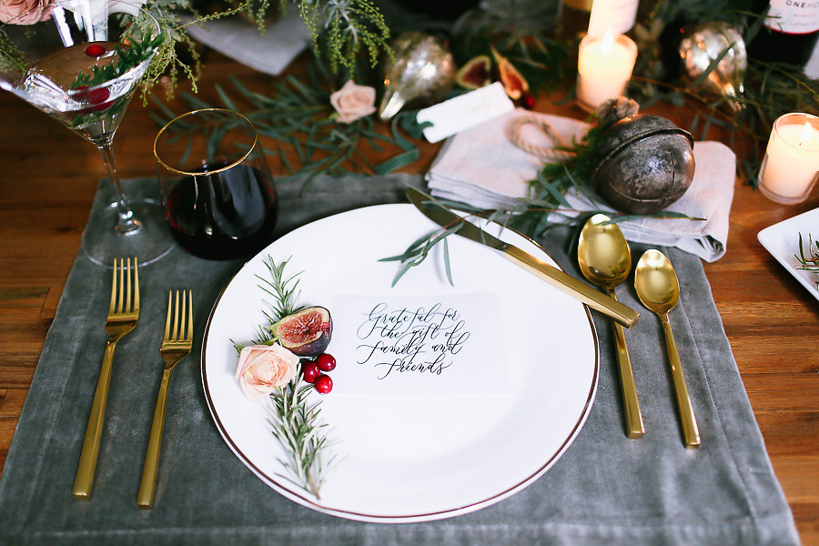 No holiday place setting isn’t complete without some jingle bells. We took the Antique Bell Ornament and set them at each place setting for our guest as a favor. Tia Joy Kim also did a name card that was beautifully calligraphed in olive green. As well as a special note to the guests letting them know how grateful we are to have them in our lives.