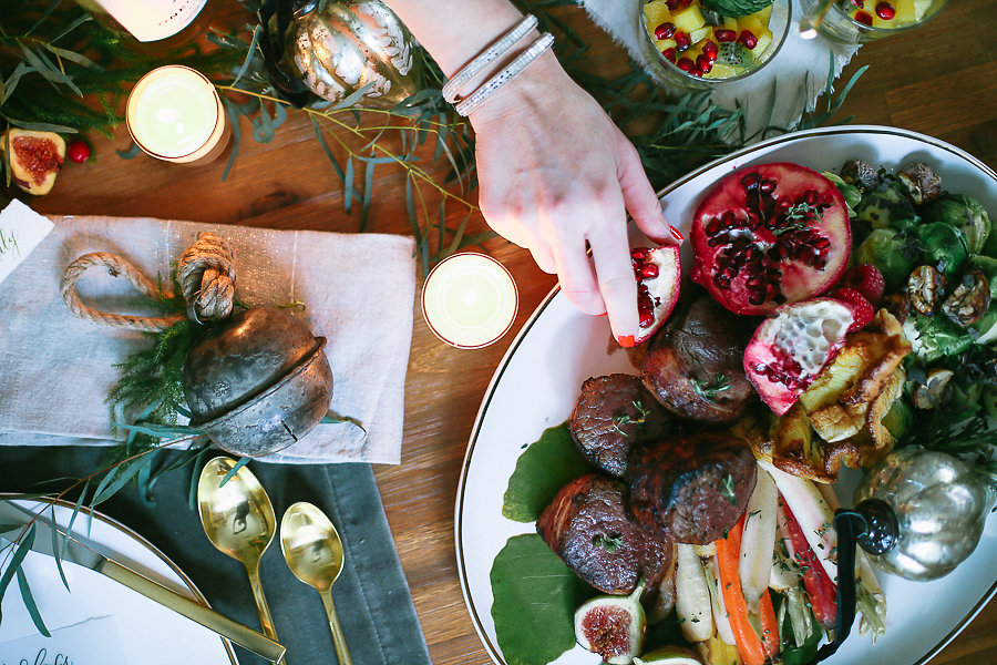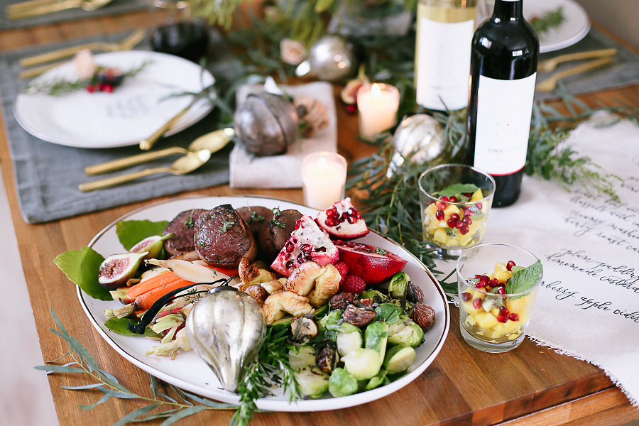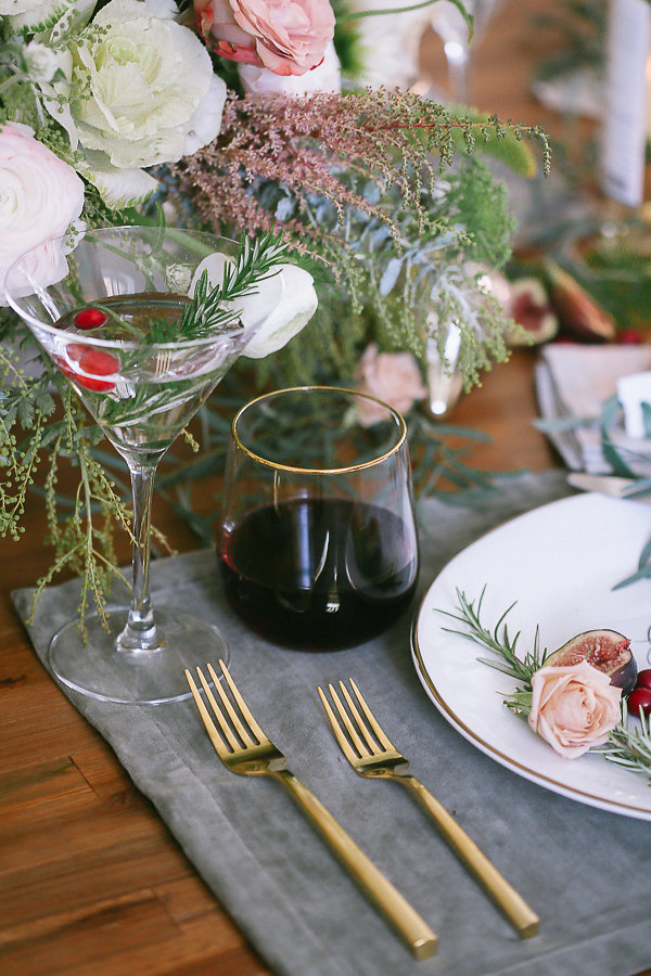 Adding rosemary, flowers, figs, and cranberries to the plates give a festive pop and color to the table.