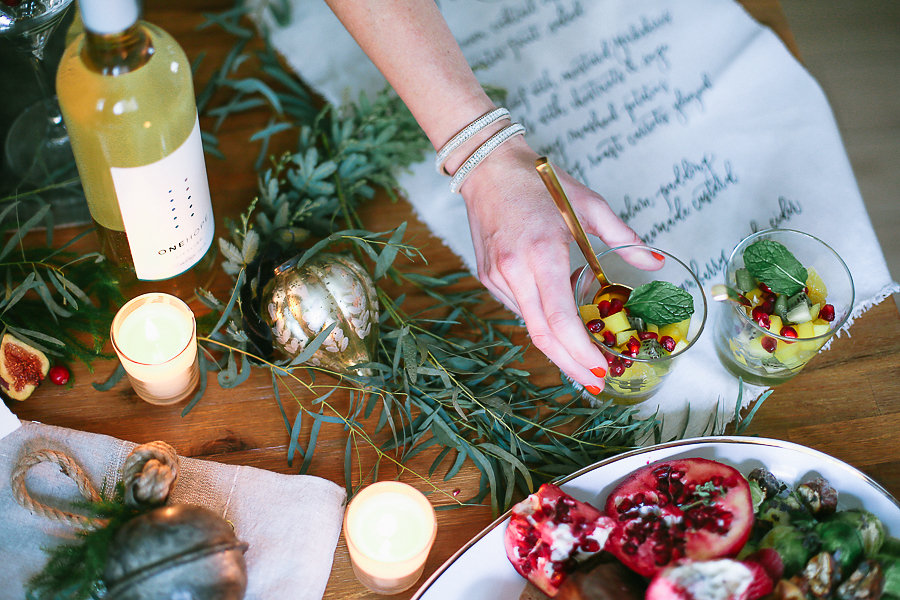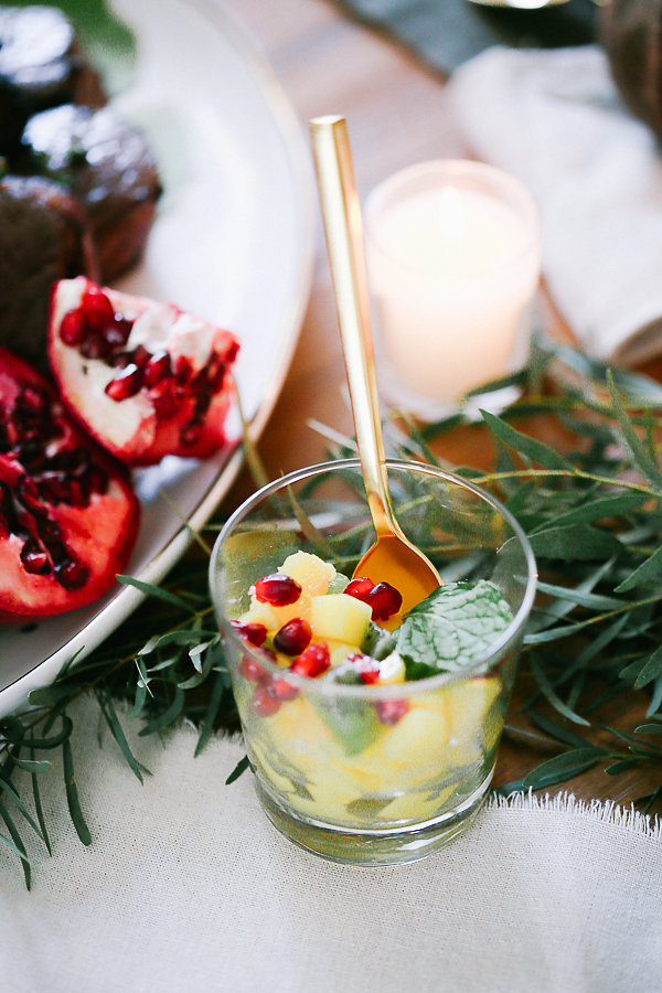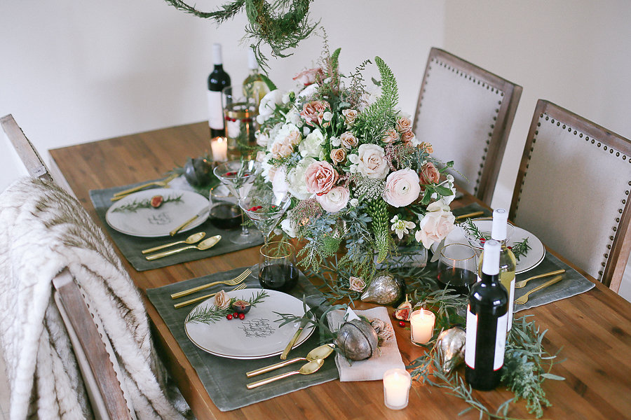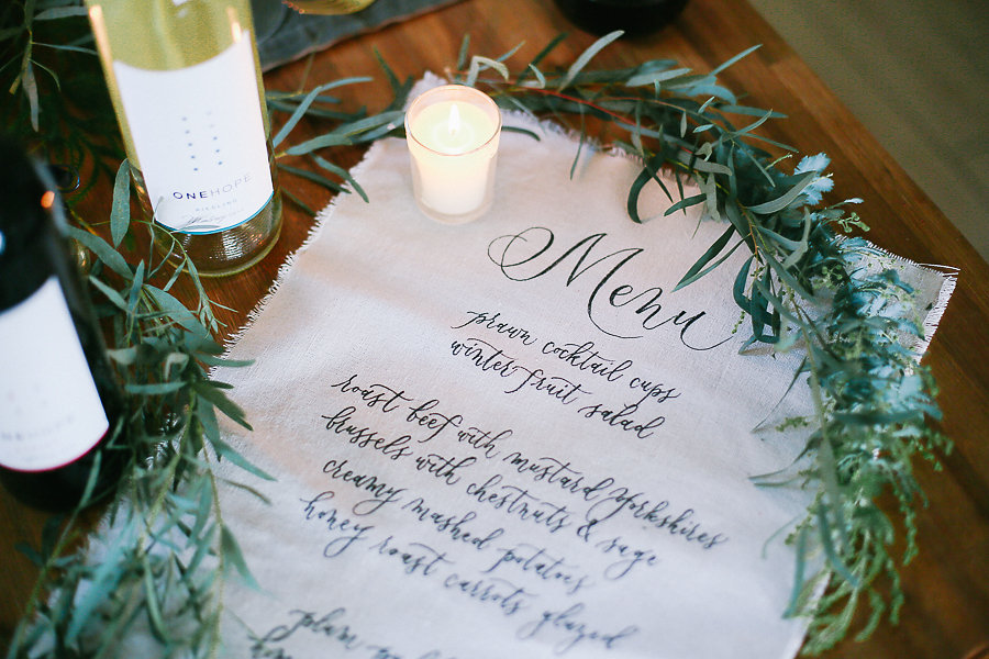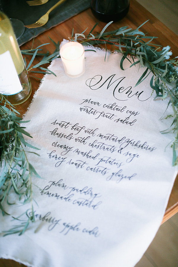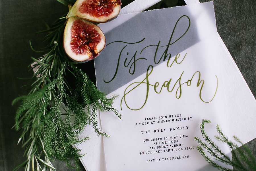 Every dinner party starts with an invitation. Tia Joy Kim created a vellum and olive green velvet invitation. It doesn’t get more festive and elegant than this. Your family and friends will know they are in for a treat just by receiving this.