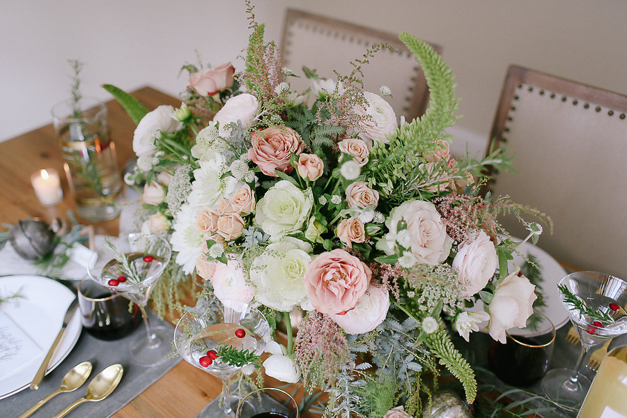 Now, every table needs a beautiful and bountiful flower arrangement. Jen from Busy Bees Florals did just that with her version of a natural and delicate arrangement. We went for a look that didn’t scream Christmas, and we are in love with the results. The light pastel garden roses mixed with white cabbage leaves and greenery make a statement but in a delicate way. With the tablescape being made up of gold, olive greens, reds, and greens it makes the flowers pop and stands out from the rest. But they also don’t outshine the tablescape as well. If you are thinking to yourself, there is no way I can make that… then just simply use some greenery that you can find at your local flower mart to give height to your table. Also, add greenery around the arrangement on each side of the table.