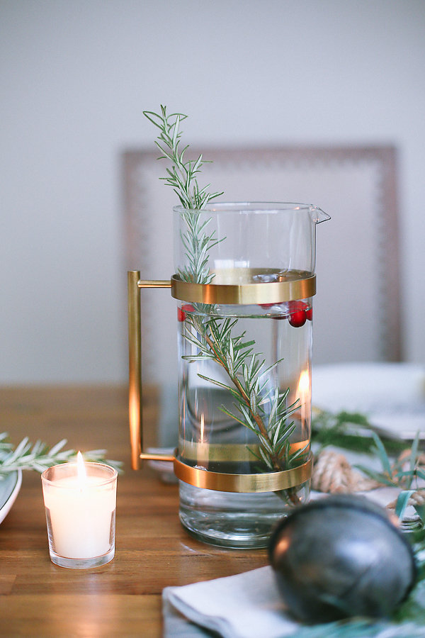 Among the greenery on the table for added detail, we placed silver mercury glass ornaments. Adding embellishments like an ornament to a holiday table brings back happy memories of my childhood as my grandmother use to do this. By doing this, I know that my family will cherish that detail.
