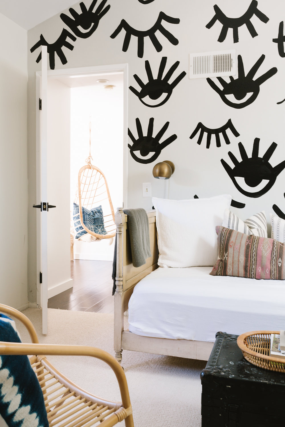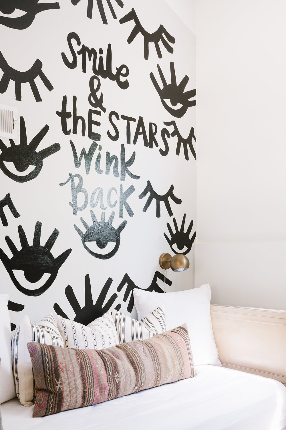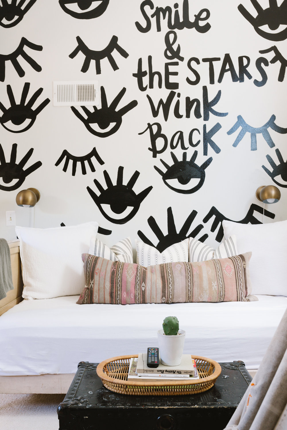 It’s so fun, right? I’m totally scared of wallpaper since removing it from my first house. So I commissioned my artist friend Ali from @loveincludeseveryone to paint a mural. We chose evil eyes since I’m obsessed with them and came up with a cute quote. If I get sick of it, no removing just paint over. Cheaper and easier ✔️✔️
