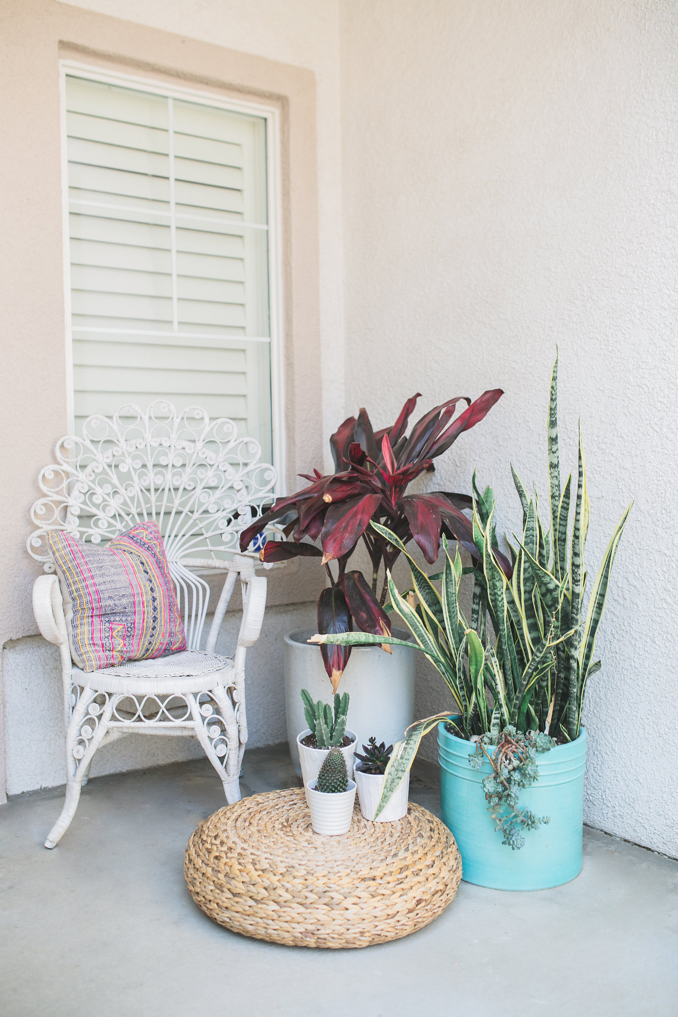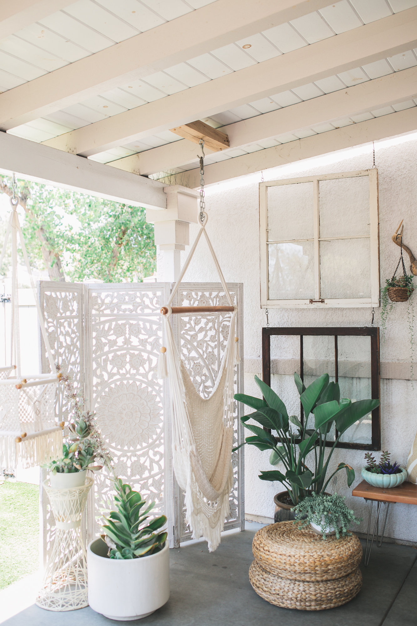 Thank you! It is one of my favorite places in my house next to my jewelry room. Me and Everly love to sit out there and just swing in the hammocks during the day. Plus it’s always nice to have something pretty to look at when we are sitting at our dining room table. When I go in to style a particular area in my home I always want it to look eclectic with a modern touch. I recently added that amazing carved screen from World Market to our patio and it really helps complete the look with my amazing Hammocks from Gunn and Swain. The hanging windows are from my wedding that I thrifted from the Long Beach Flea market. I didn’t know what to do with them after our wedding so my sister and dad suggested that we hang them in our backyard to cover up that big empty wall and I’m so glad I did. I have a thing for antlers and macrame which can be seen all over my house so naturally they made their way outside too. And last but certainly not least….plants! They make everything better! Plants give life to your space and that pop of greenery will always make your space feel lived in.
