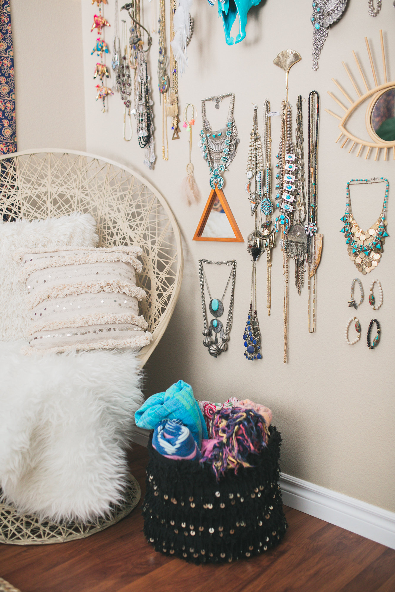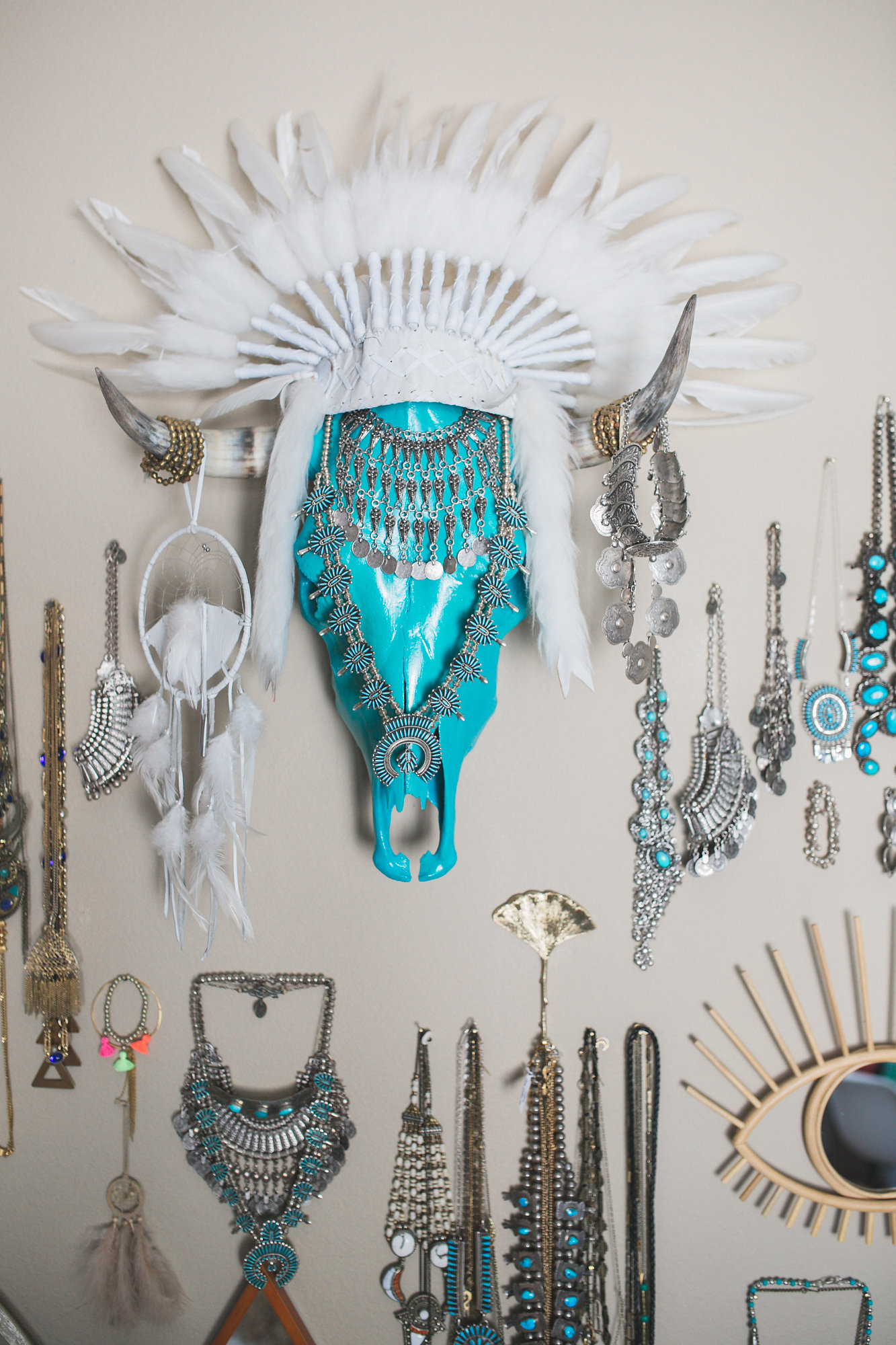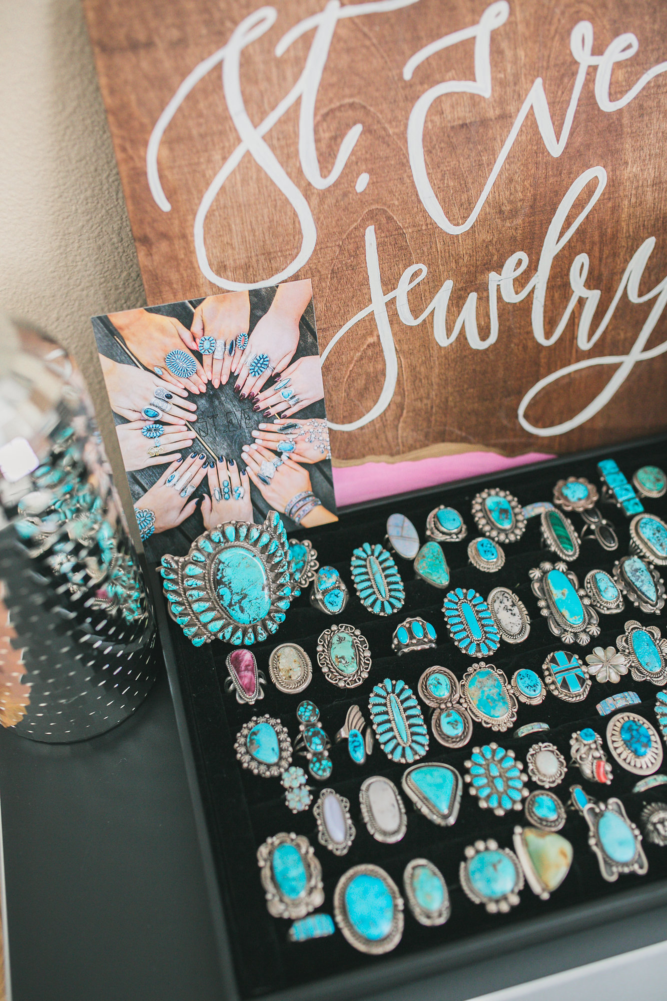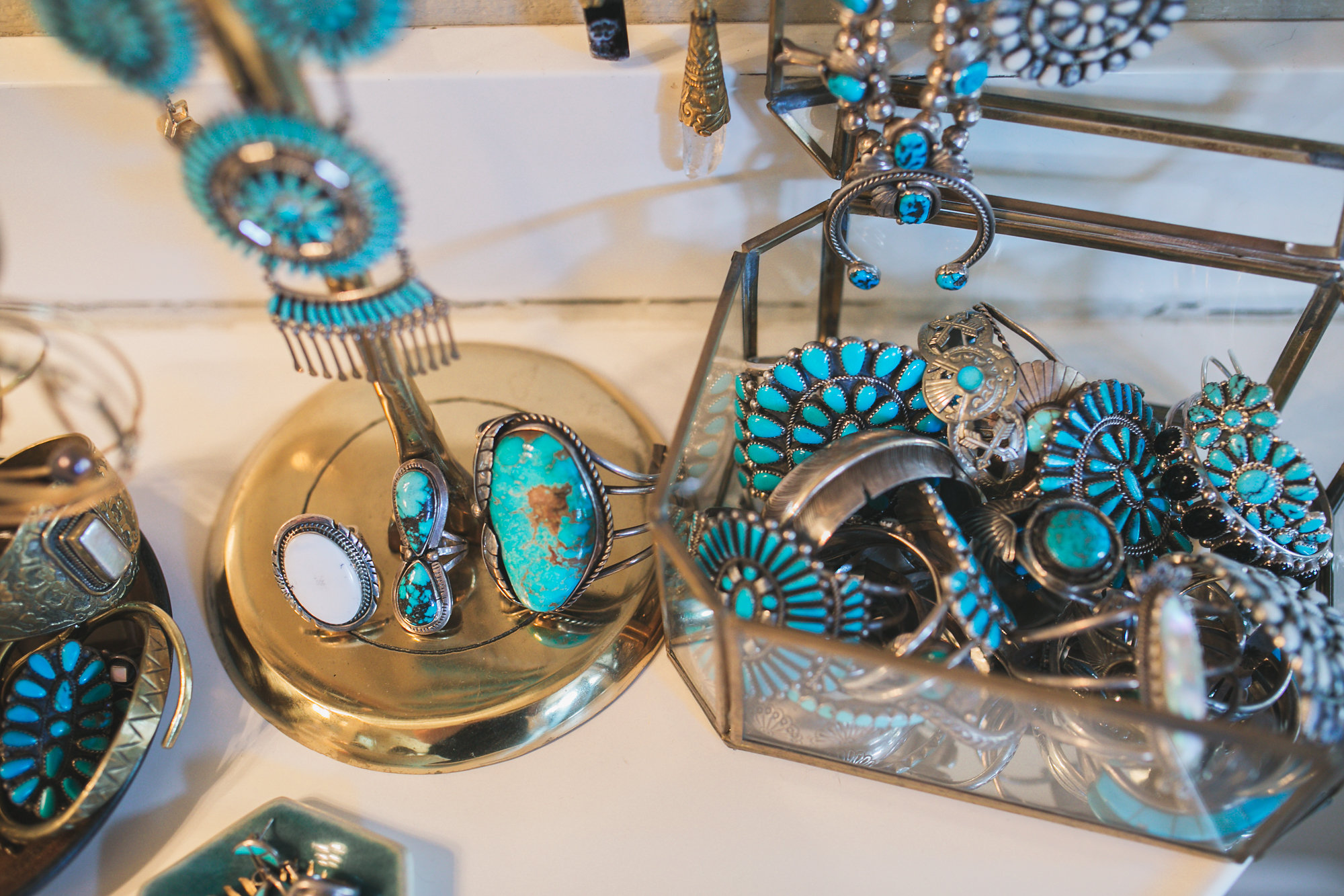 My jewelry room is my pride and joy…besides miss Everly of course. It is my happy place. I see our journey of our small business right there on that wall. It’s pretty cool to see how much the style has changed and what pieces used to be our best sellers. Trends have come and gone but my love for jewelry is timeless. To be honest, I own so many pieces of jewelry that I have lost count. But if i had to guess I would say at least 500 pieces. That sounds like a lot but it’s true! My must have pieces are my turquoise squash blossoms and turquoise cuffs and rings. I have always loved turquoise before I started selling it and I still think it’s the best jewelry out there.
