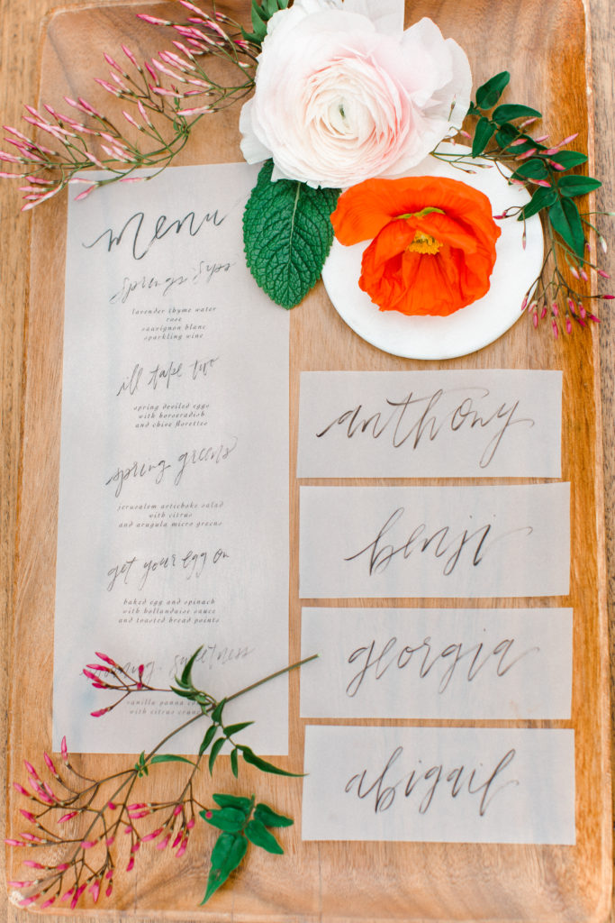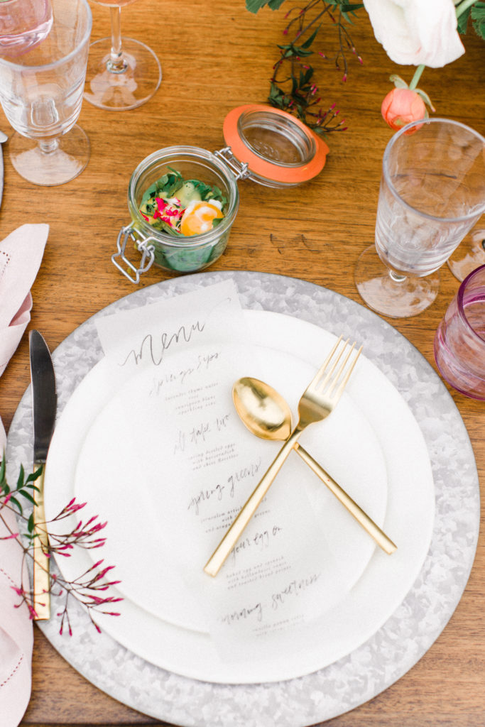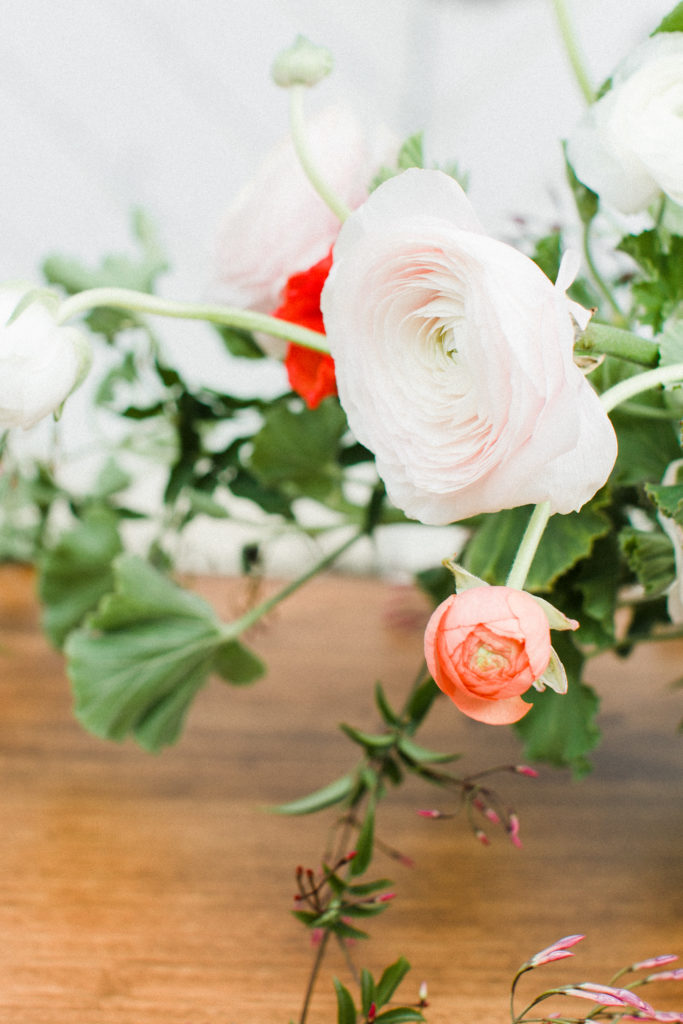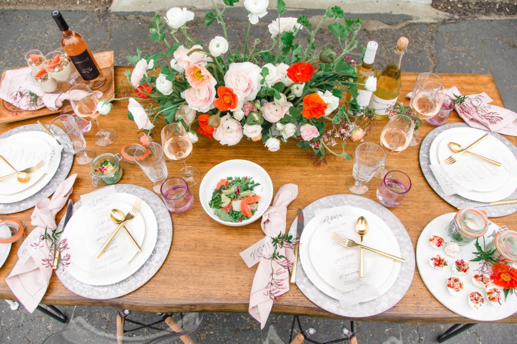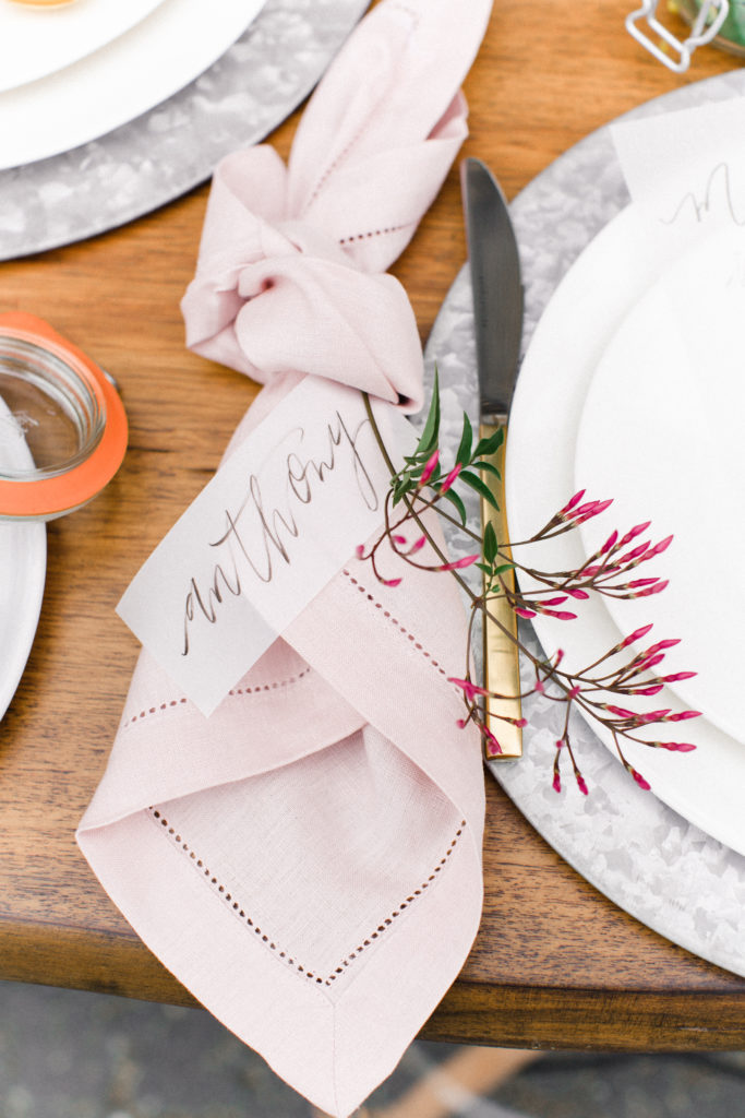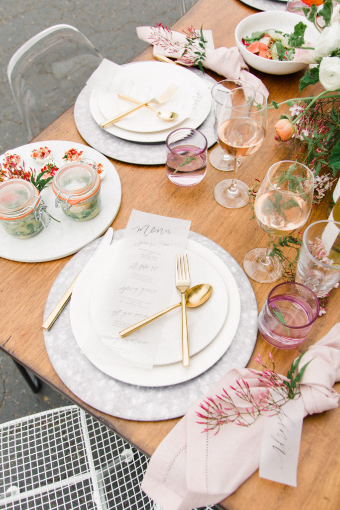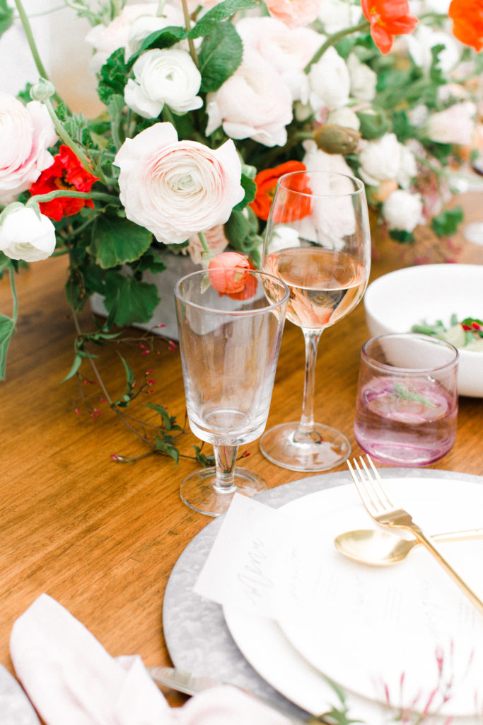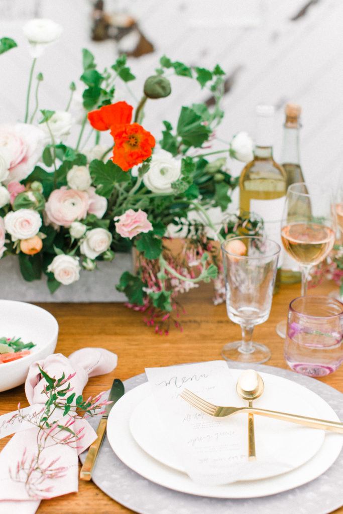 Now, one of the most important parts of the table. The flowers! This is where all your spring and pastel dreams come true. Have fun with it! Natasha Kolenko created a beautiful spring arrangement that consisted of out of this world huge ranunculus, poppies, fragrant pink jasmine, and mint. Nothing better than having an arrangement that smells as good as it looks.