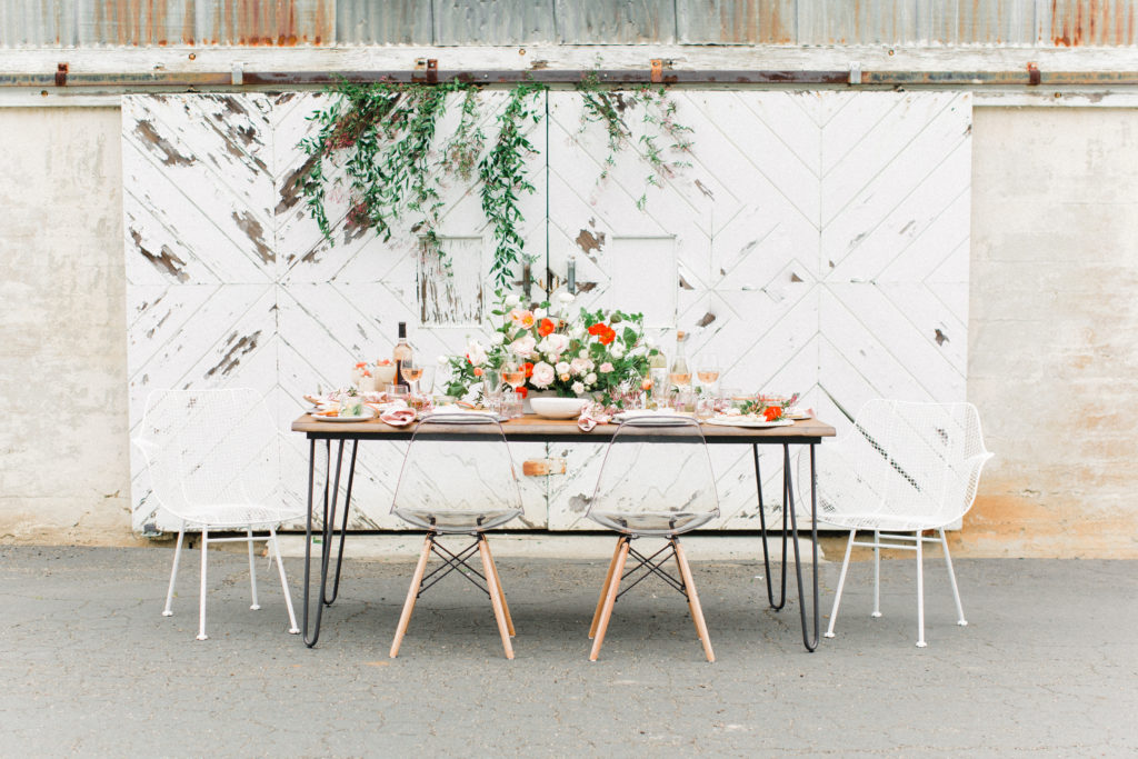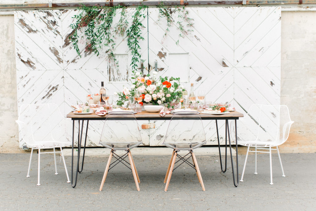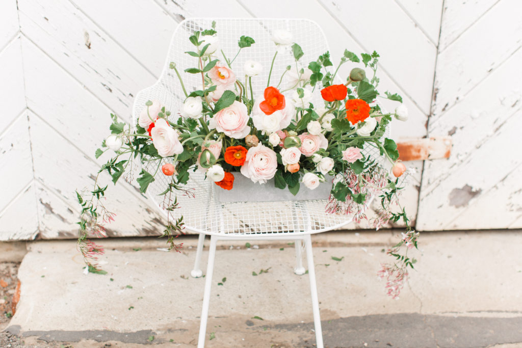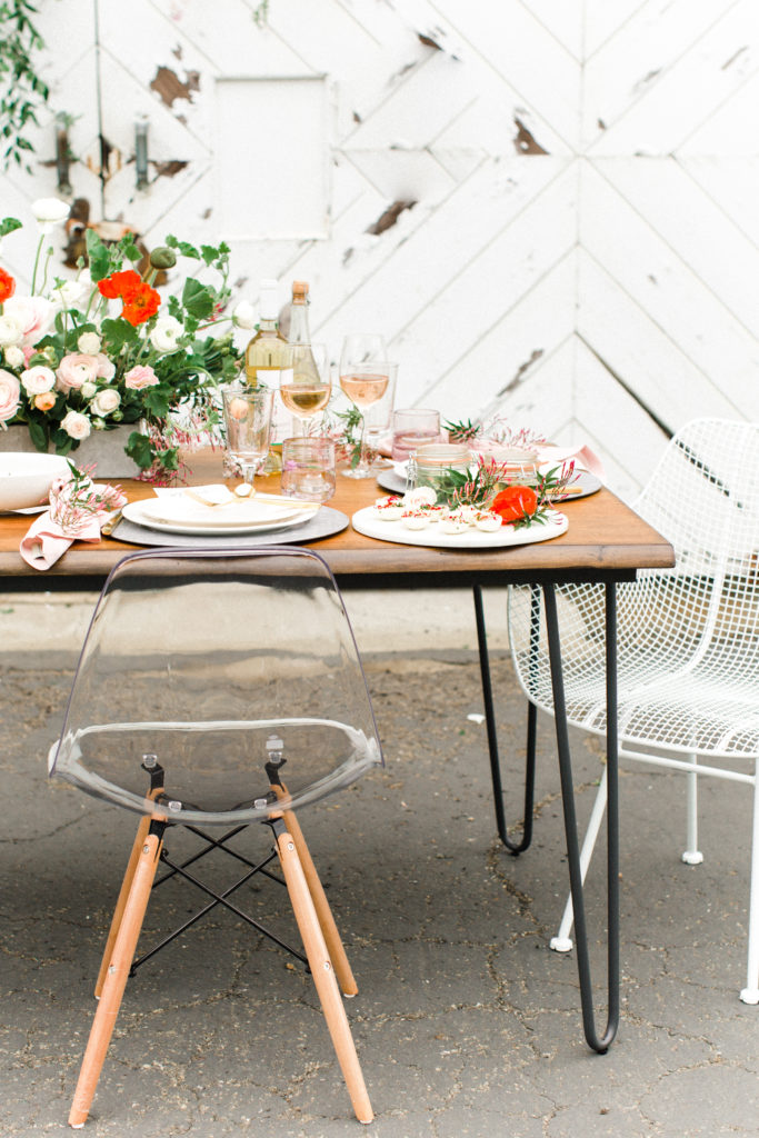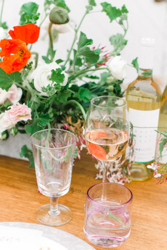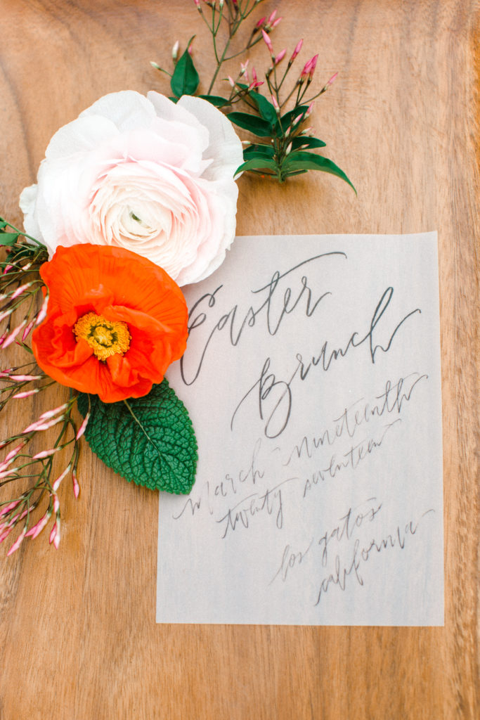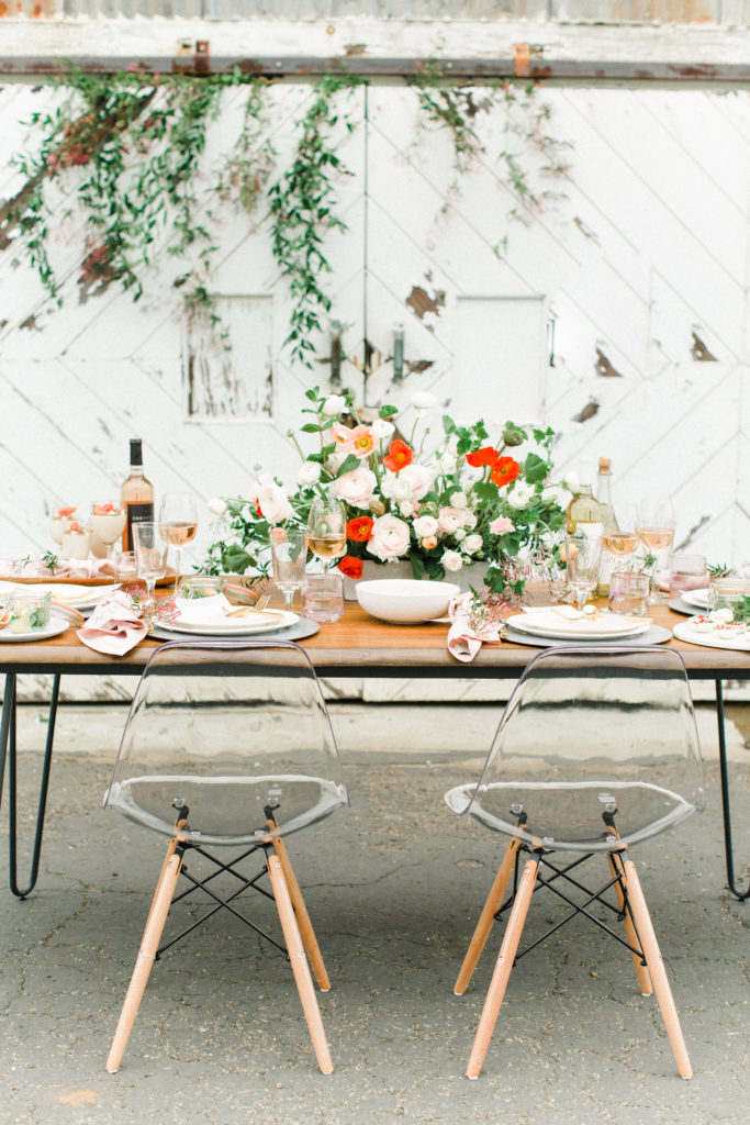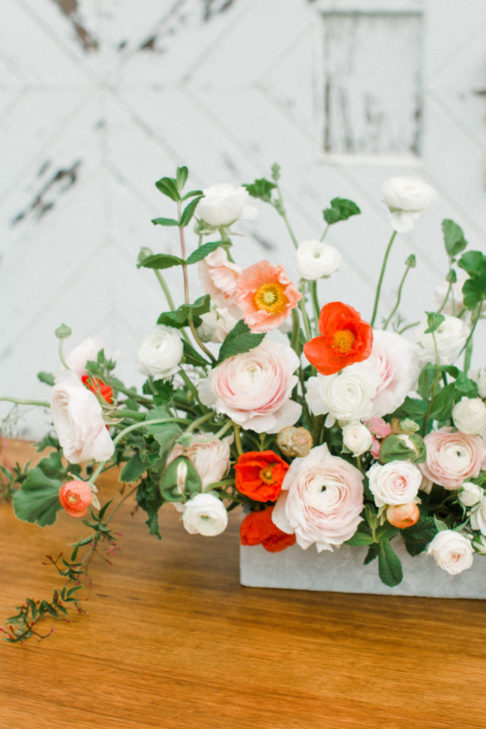 Now, one of the most important parts of the table. The flowers! This is where all your spring and pastel dreams come true. Have fun with it! Natasha Kolenko created a beautiful spring arrangement that consisted of out of this world huge ranunculus, poppies, fragrant pink jasmine, and mint. Nothing better than having an arrangement that smells as good as it looks.