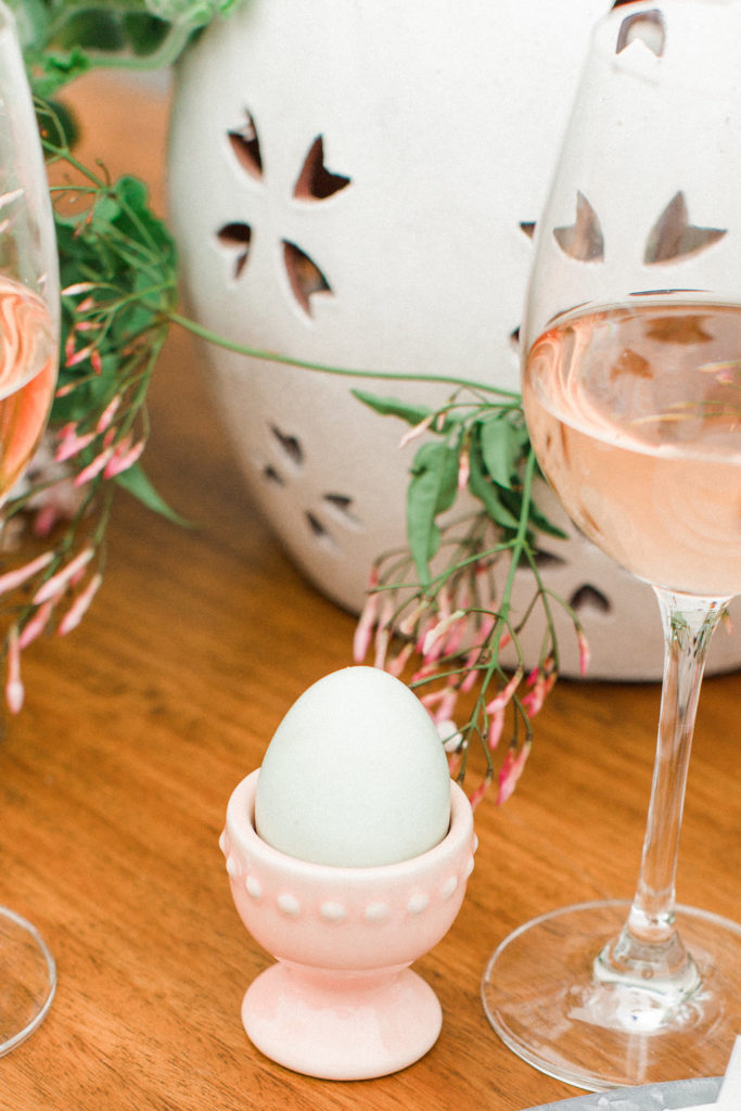 Creating a tablescape can be daunting for some people, in particular for a holiday occasion. You feel the need to go out and get all new things to wow your guest. But you don’t have to! Pottery Barn has beautiful everyday items that you can use for your festive decor. When adding festive decor to your table, you want to be limited on the amount. I know it’s exciting and everything is super cute but too much of a good thing and it can start to look crowded. You want pops of Easter throughout the table. I used The Emma Egg Cup which comes in a mixed set of seasonal pastel colors at each place setting. I placed fresh farmers market eggs into each cup. Another easter element among this pretty table is the pierced ceramic egg that was placed right beside the floral arrangement.