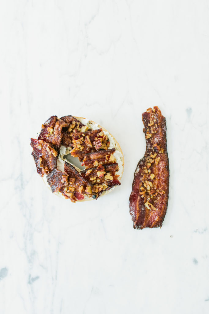 Bacon with maple syrup, chopped toasted pecans, black pepper / made in oven