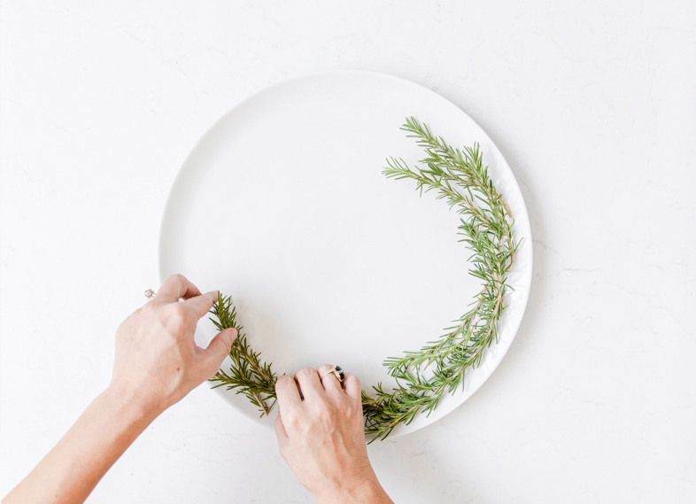 2. Start with the base of any wreath, the greenery. I used rosemary. Rosemary is lovely to use as it will bend for you a little bit. Sage is also great, but sadly it was not in the stores yet when I went. You can also do a mix of herbs too! You can create a full circle or do an asymmetrical look as I did. I think it gives it a more updated modern look. Save some rosemary for later to add in more “greenery” details at the end.