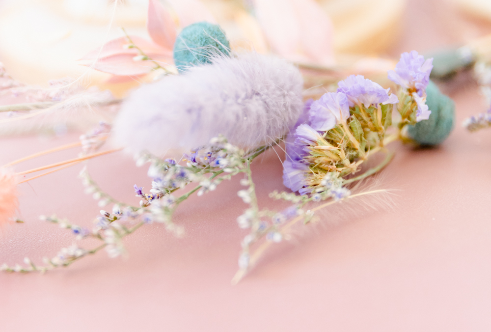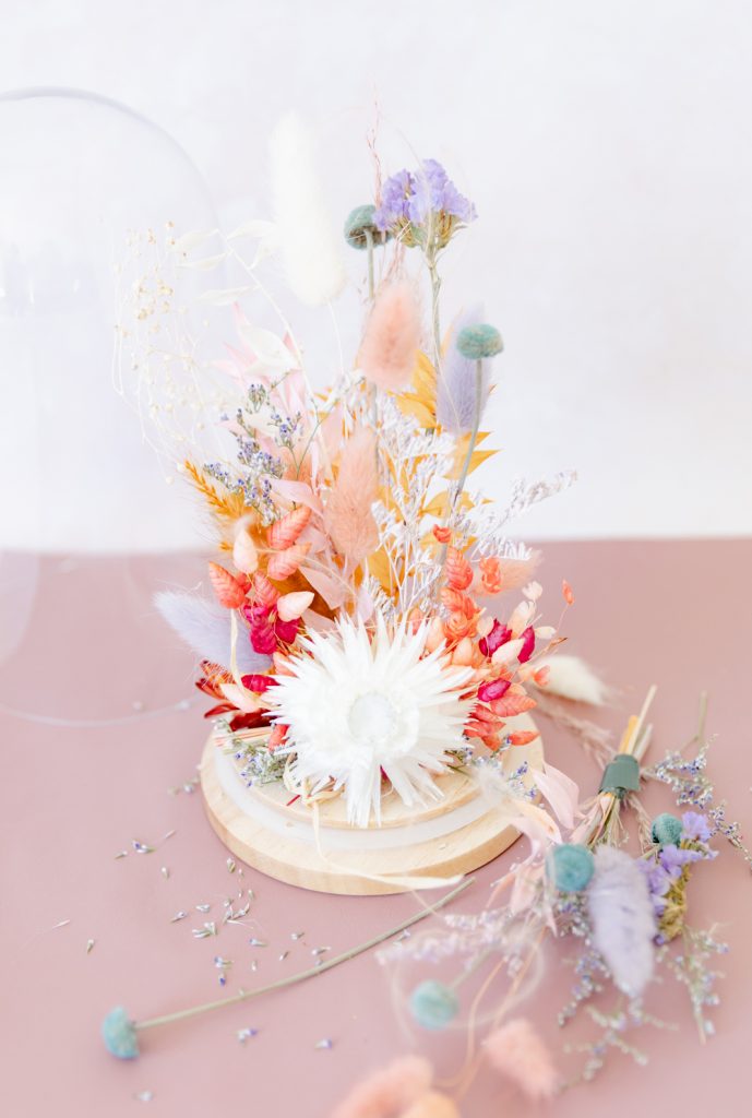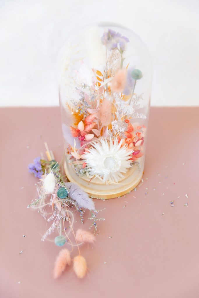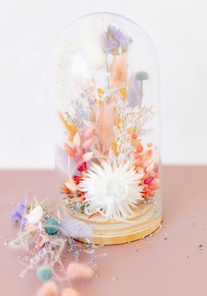 Gather all your flowers, heat your glue gun, and let’s get to it! I like this kind of DIY cause there is no wrong way to create. It’s your creation, your style. So these are simply guidelines. I used a glue gun cause some of the dried flowers are have fragile stems, so I wanted to make sure they would stay in place. I started by adhering the floral frog to the base of the terrarium. Then I started creating this little lady. I started from the back and just built towards the front. Think of it as adding layers in front of each other, much like making an actual flower arrangement. To cover the floral frog, glue florals around it; this hides it. One good tip is to put the top on a couple of times thru the process to make sure you have the right height. Once you have the base, then add in florals where you have empty spots. It’s a super easy and relaxing activity. You can fill it all up, or you can even do a simple look with a few flowers, totally up to you! Have fun!