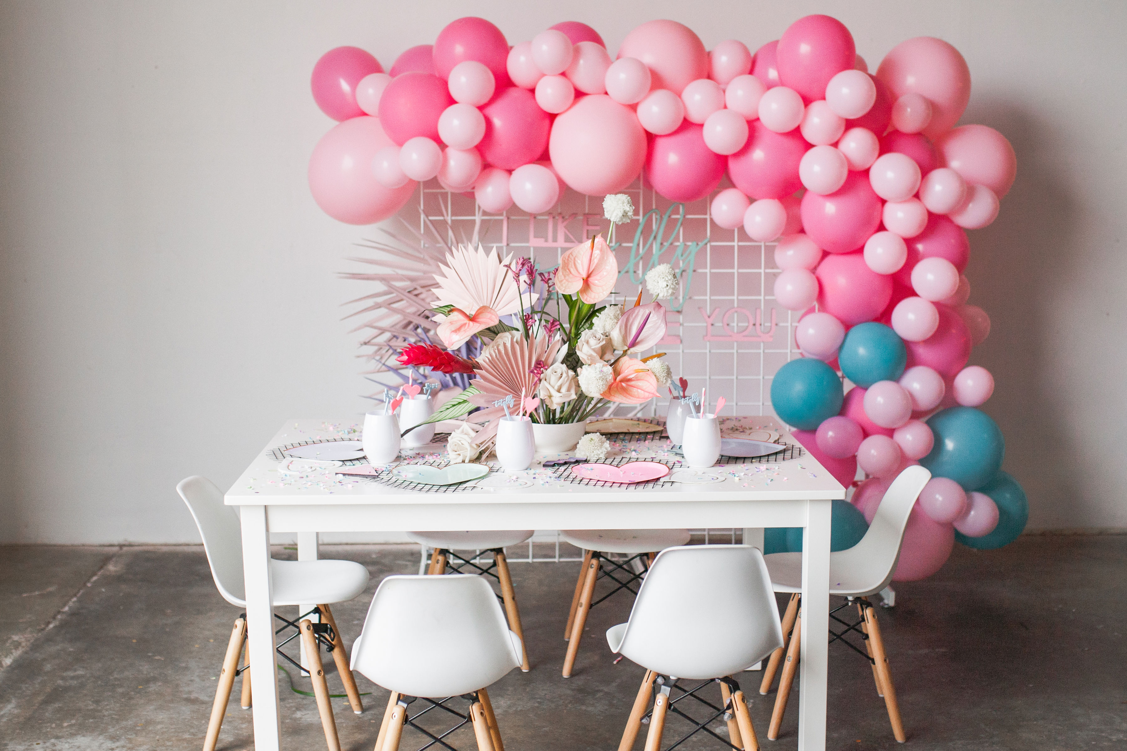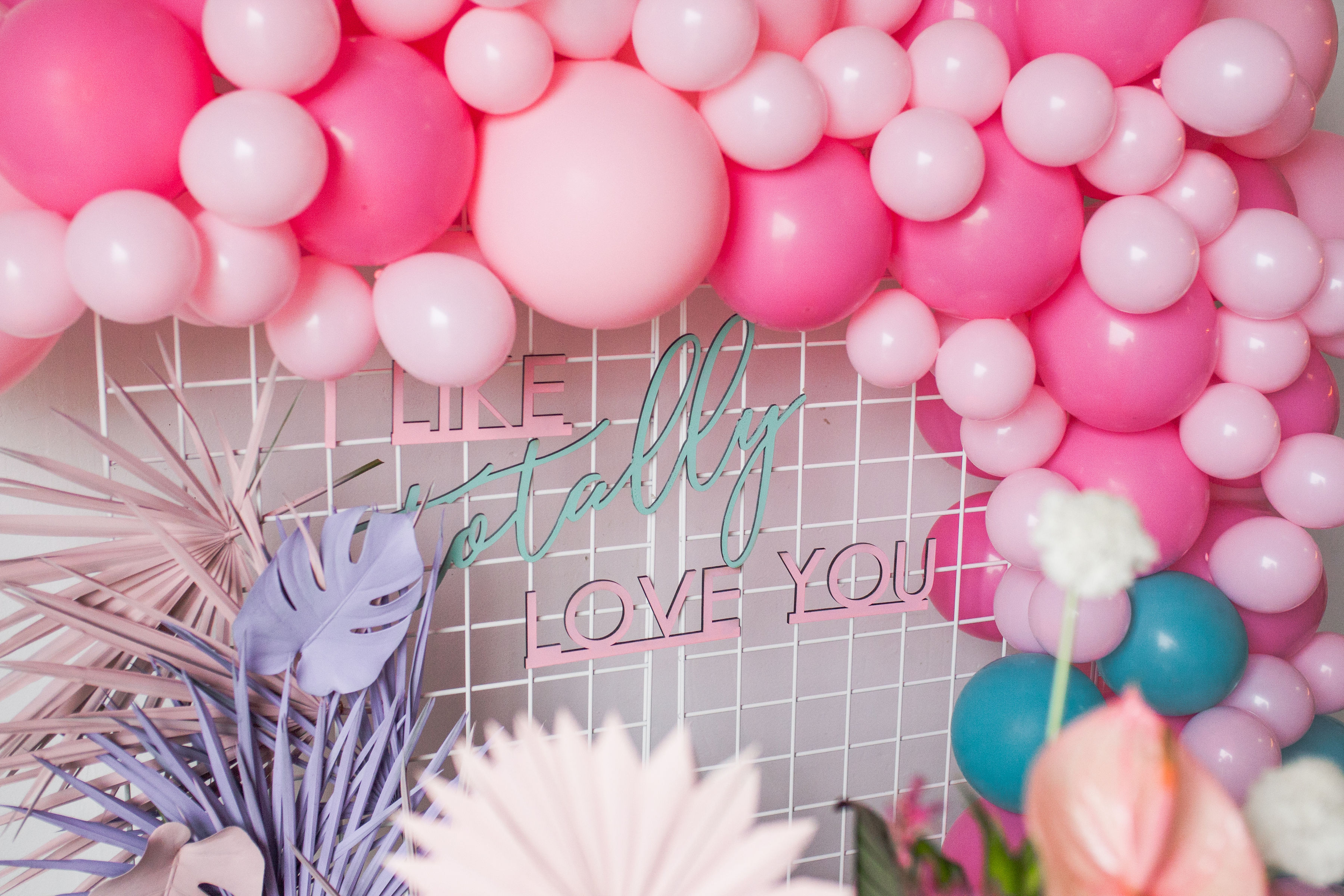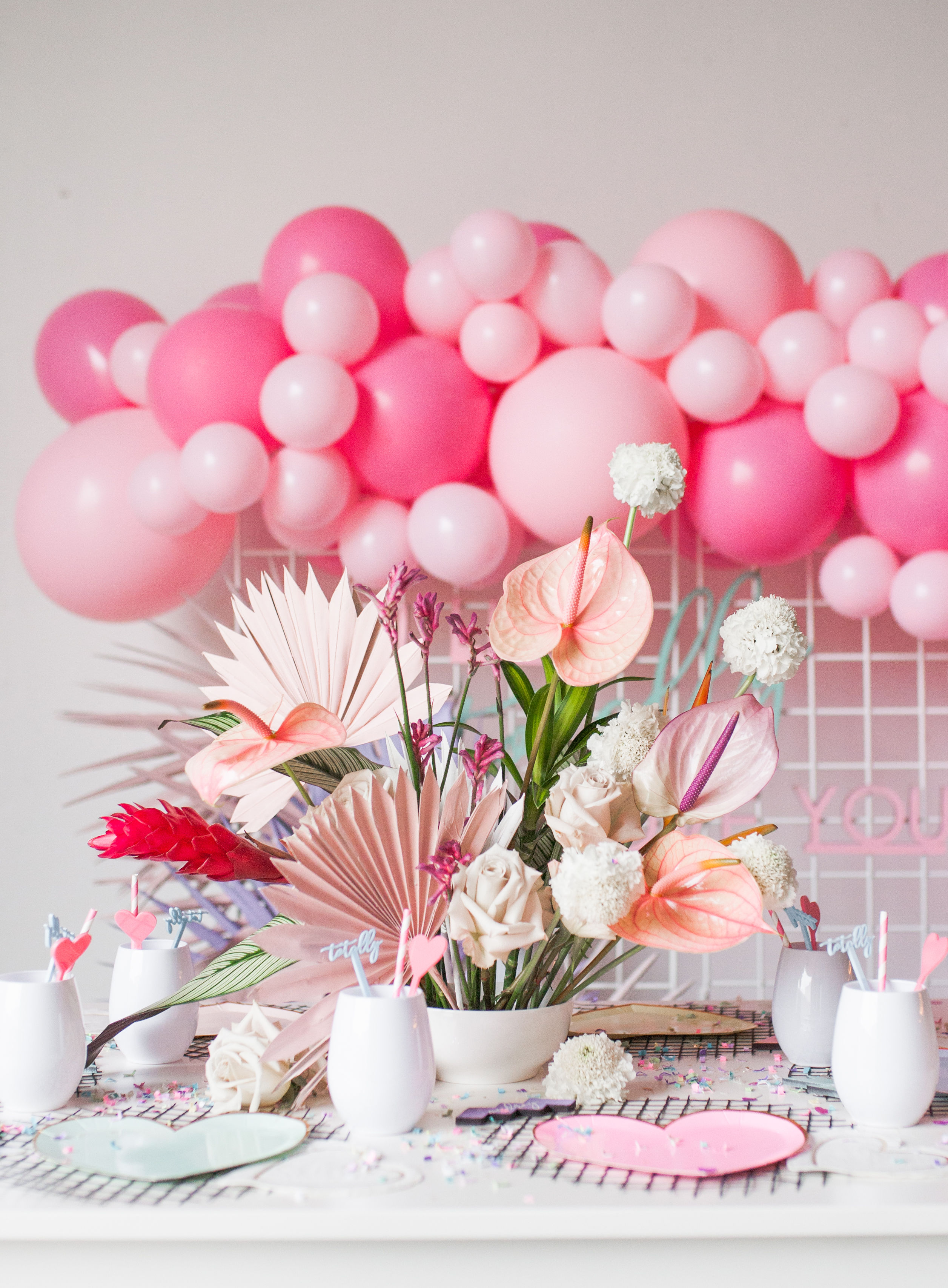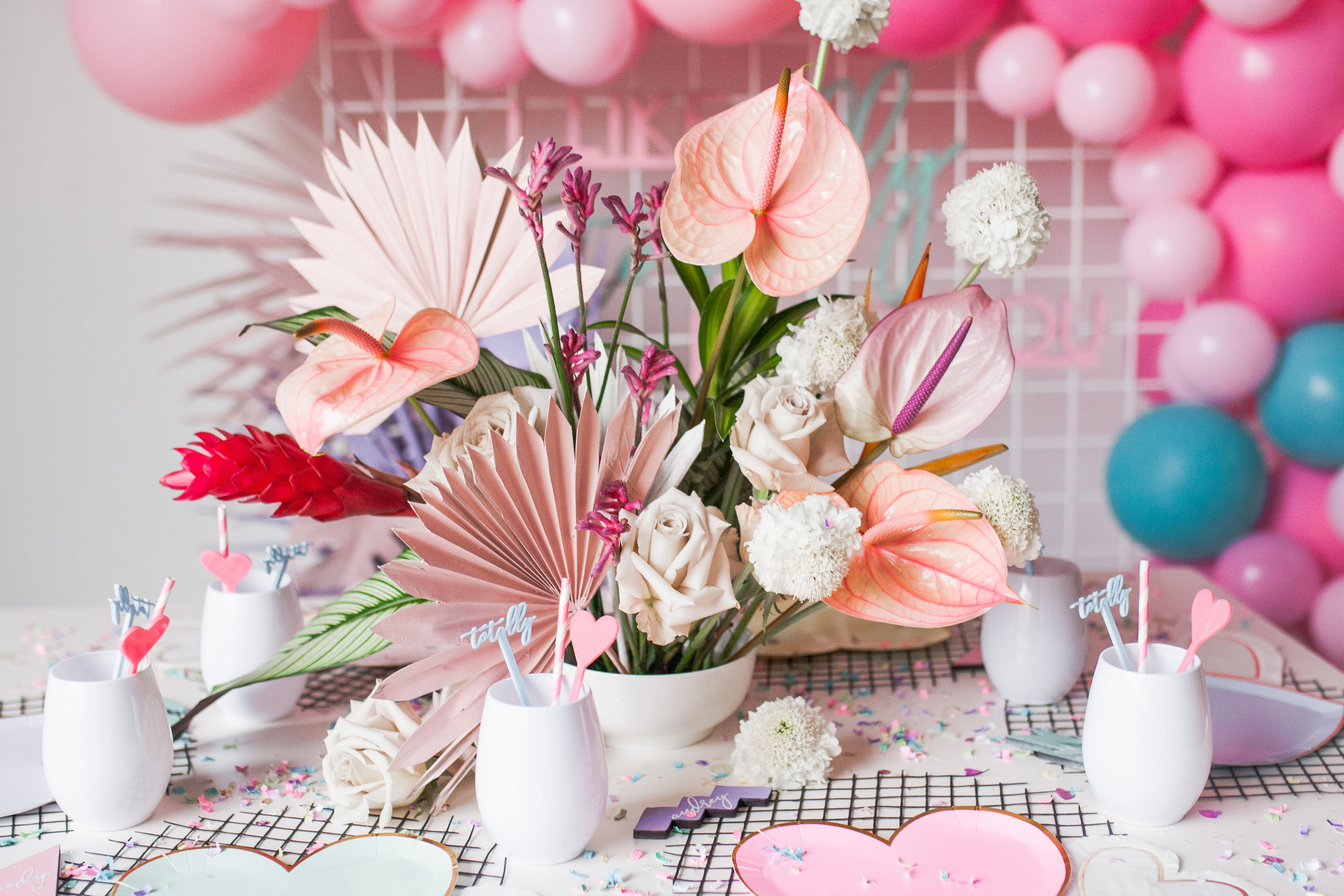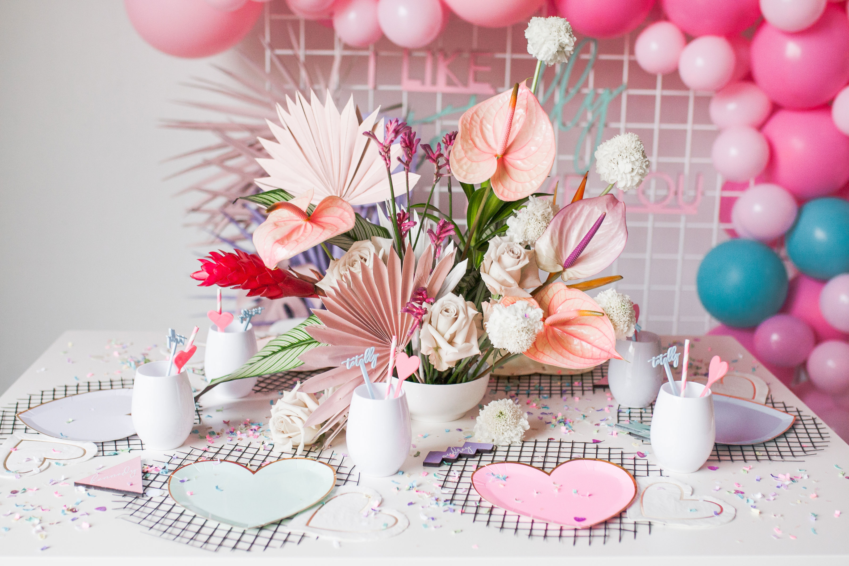 Valentine’s Day is all about the hearts and that classic red and pink… But I decided to mix it up this year… What if we went totally tropical, totally 80’s, and totally radical?! It turns into something totally cute and I, like, totally love it!!! For this fun girl’s Valentine’s Day party I went all out 80’s with a fun pastel vibe and pops of color! Plus, a really rad take on modern tropical florals that I can’t get enough of!