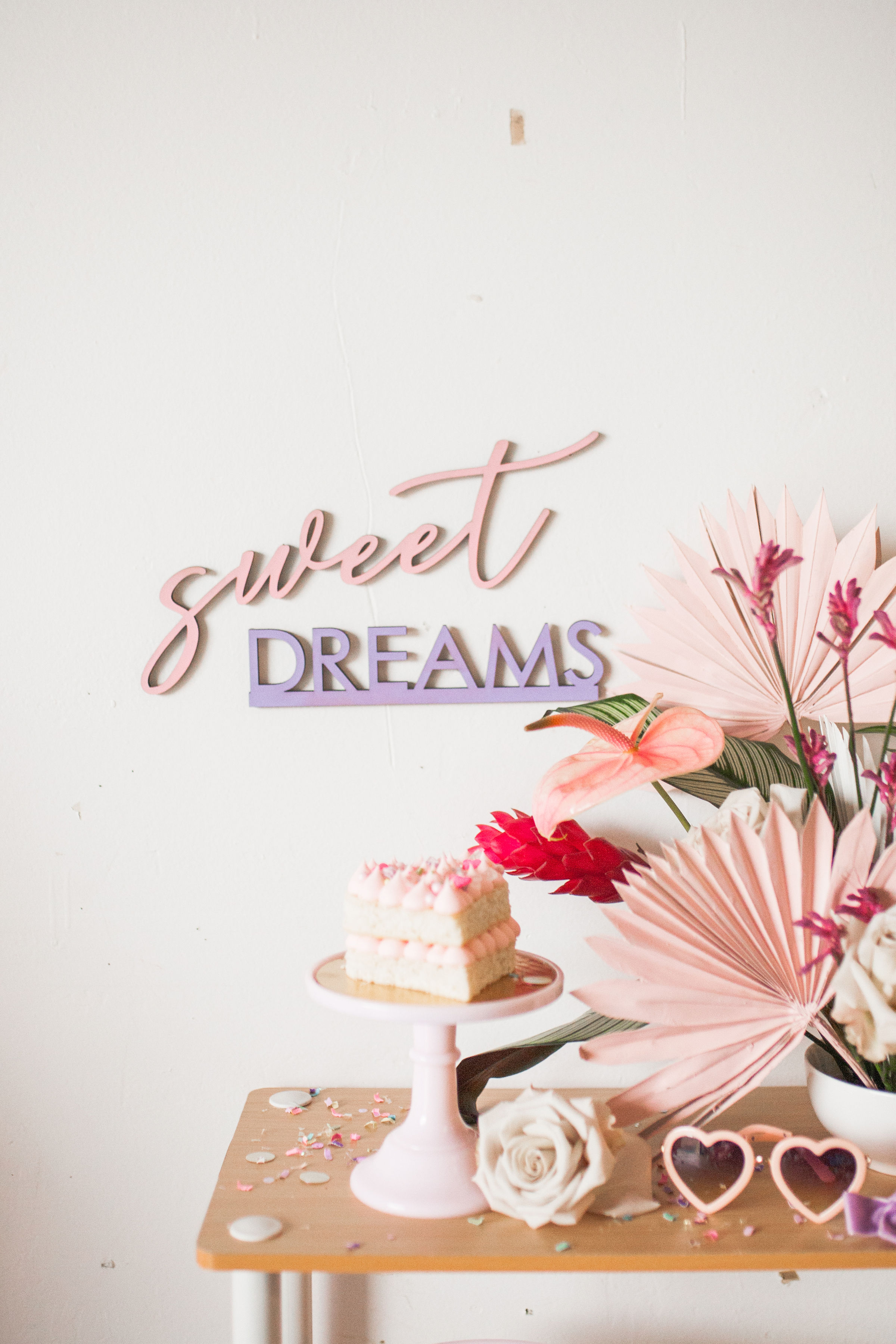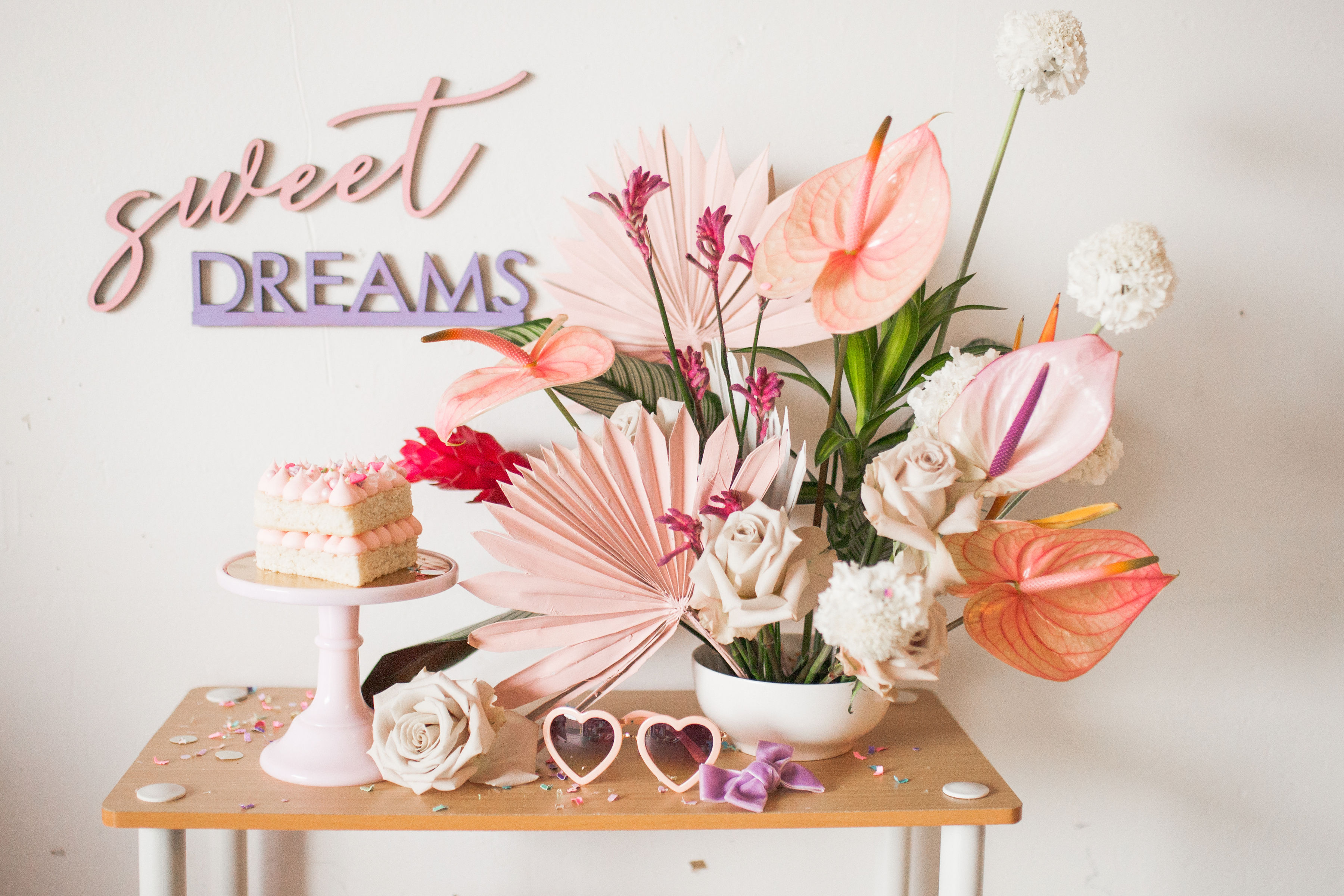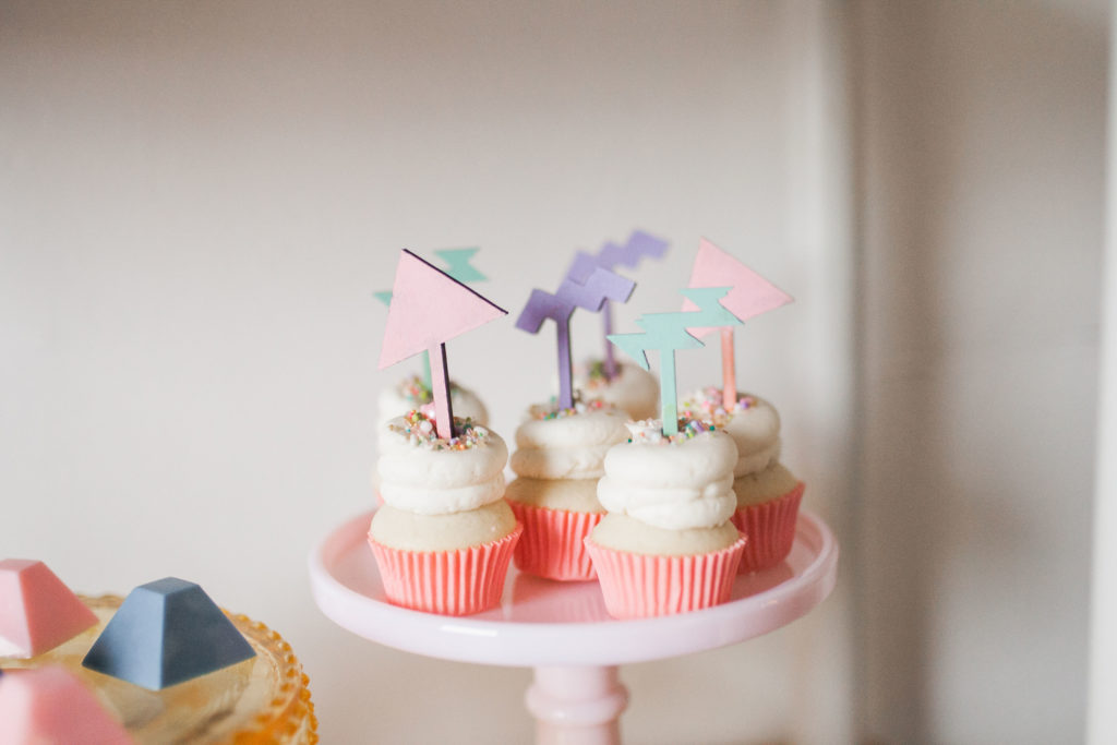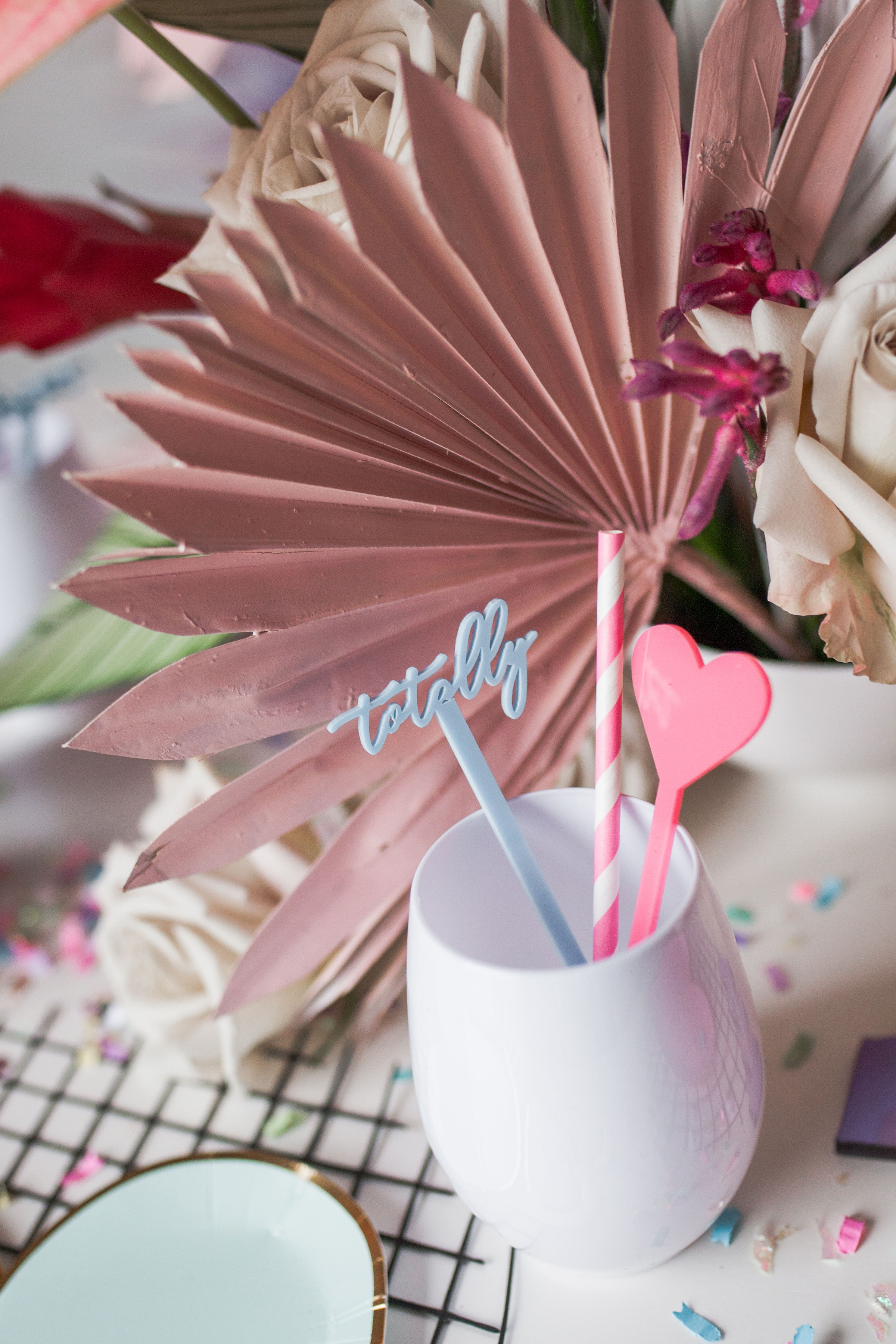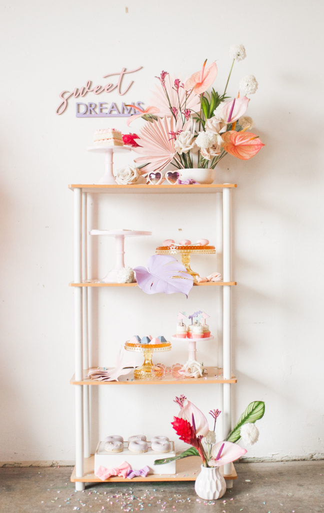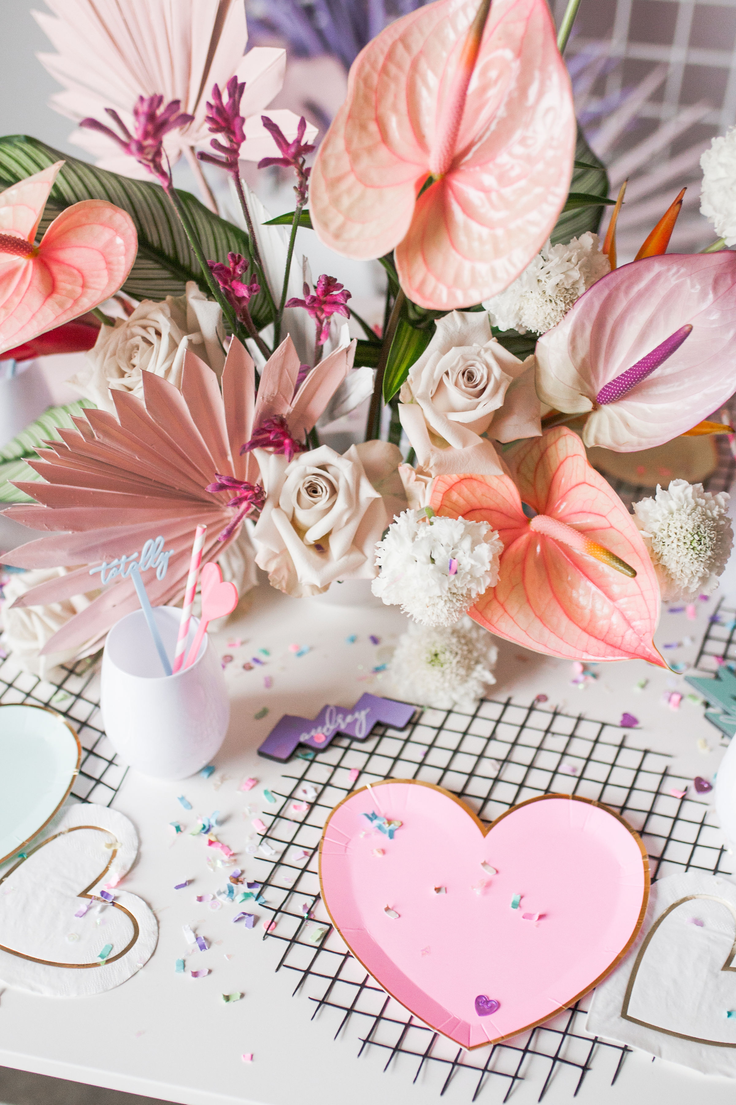 The table was set with the cutest heart plates from Witty Bash, tons of custom details from Creative Amme – including placemats matching our grid backdrop, place cards in 80’s shapes and the cutest stir sticks. Wild Darling Floral did the most amazing tropical floral arrangement and even spray painted the palm leaves to match our theme. We scattered custom Confetti Bar confetti across the table to add some sparkle and fun as well! The backdrop was a white grid adorned with balloons from Witty Bash, florals by Wild Darling and signage from Creative Amme. It was the raddest set up for this fun affair!!