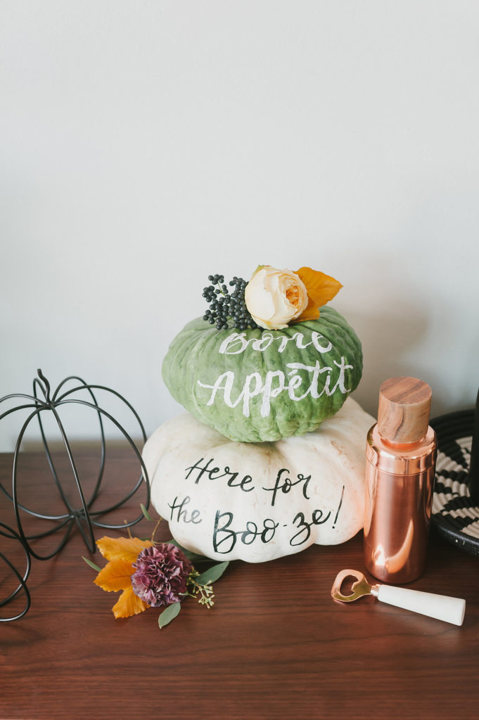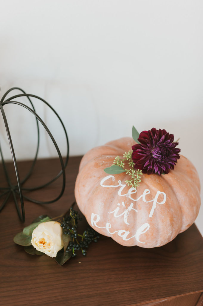 The talented Cindy from Blot & Dot took her turn at the pumpkins! Her calligraphy and witty puns always make me smile. You may remember our similar collaboration last year for this playdate. The wire pumpkins were a Target find! I try to steer clear of the cheesy Halloween decor, much to the dismay of my 3 year old, and these definitley made the cut! I think they are pretty timeless, don’t you?!