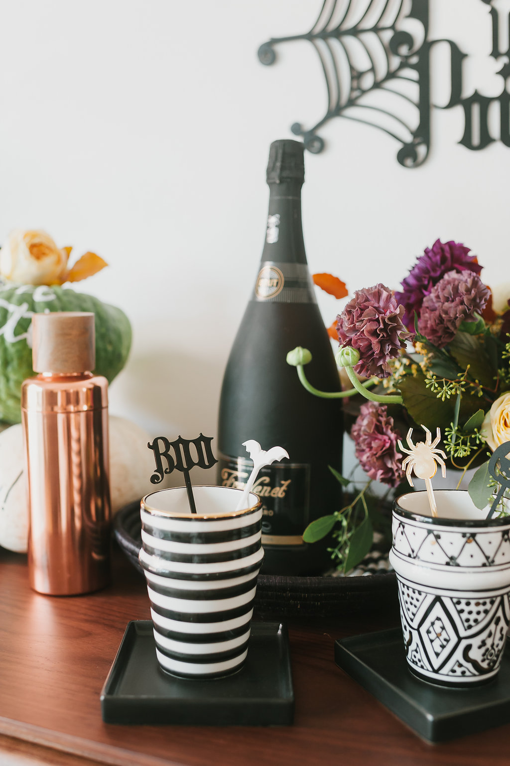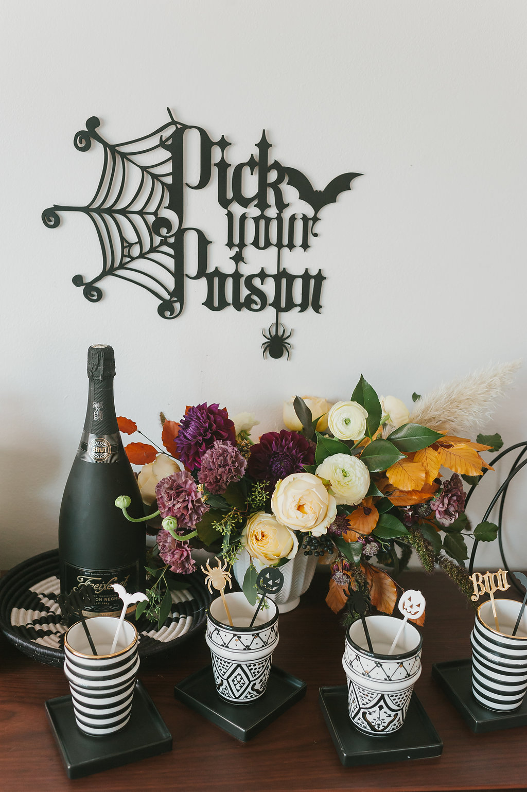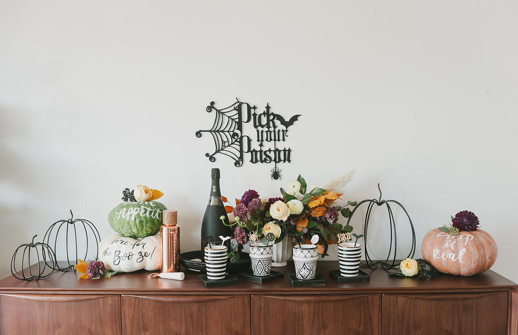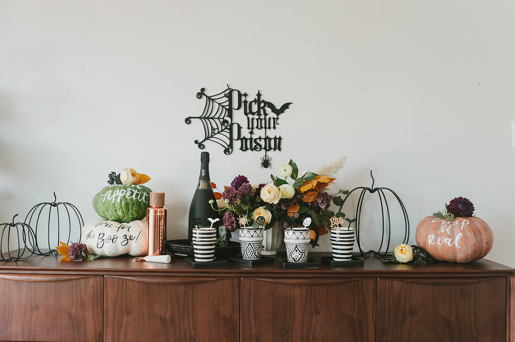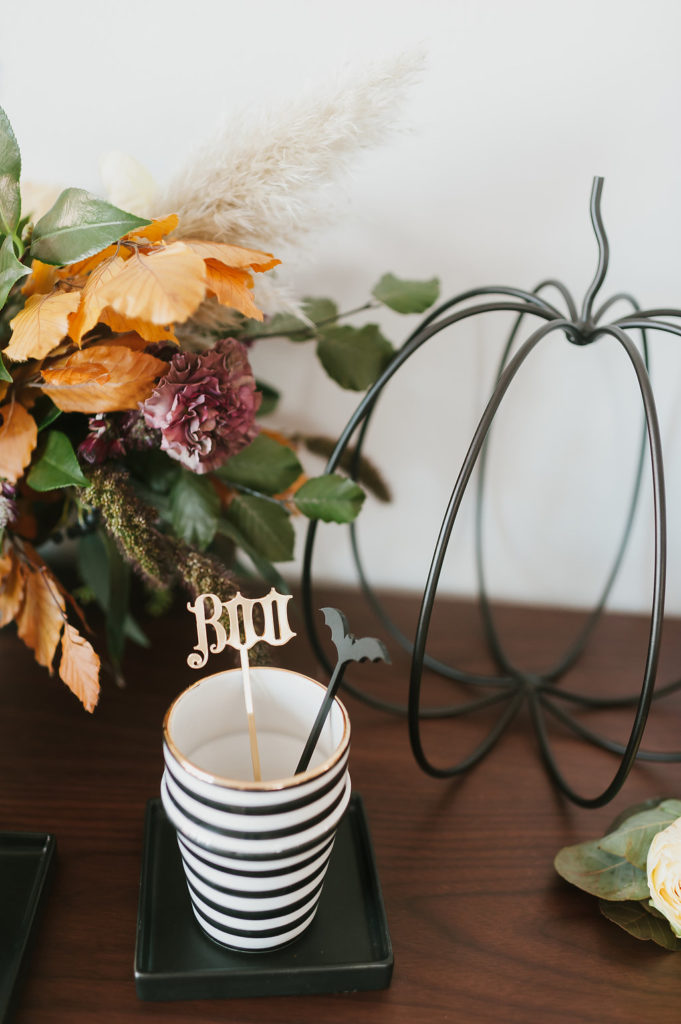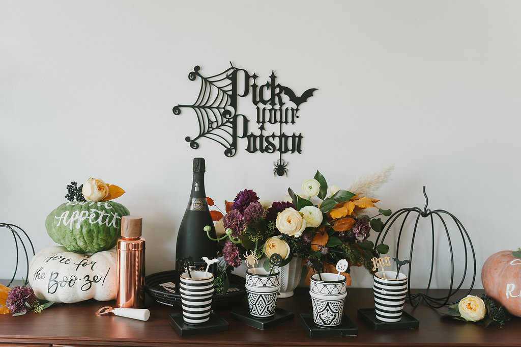 Let’s start with this amazing signage from The Roc Shop! That girl is so darn creative, she always has great pieces for every occasion. I knew she wouldn’t disappoint on Halloween either! Plus, her cocktail stirrers are the cutest little detail for each guest’s glass. I love having the little details for people, they never go unnoticed!