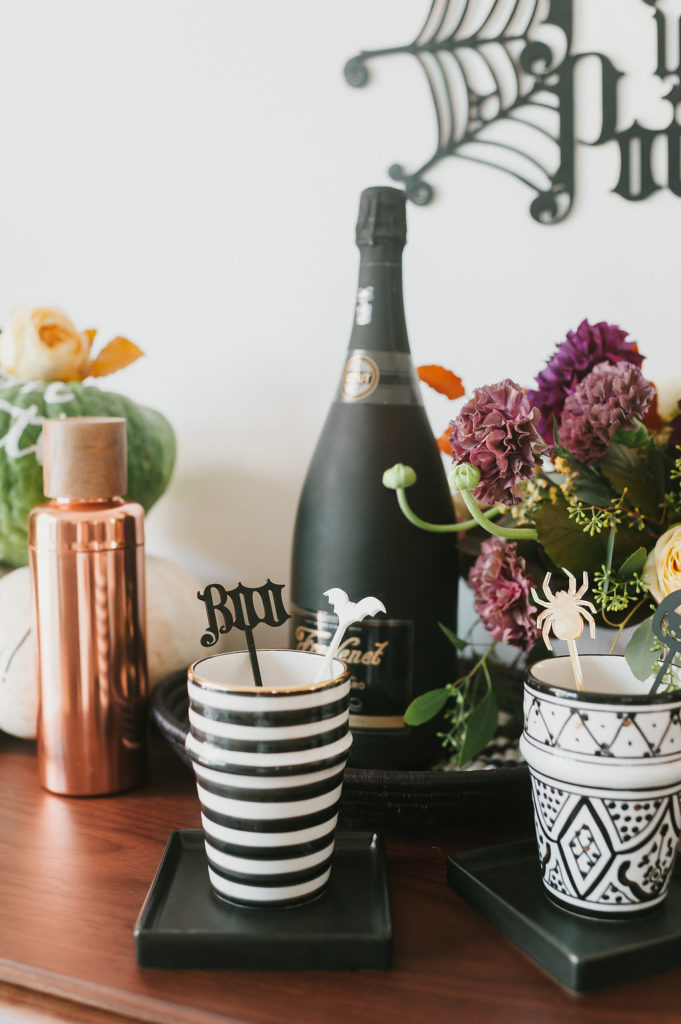 Now, you can’t have a Boo-ze bar without the BOO-ZE! This black Freixenet sparkling wine bottle caught my eye. A black bottle on Halloween is so spot on! Doesn’t get more festive than that! Your guests will love how detailed you were, and they will obviously love you for serving them a drink! So pop some bubbly and enjoy with your guests on the creepiest night of the year!