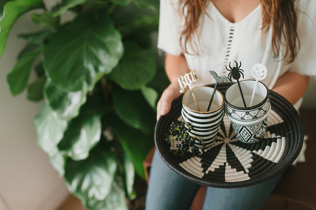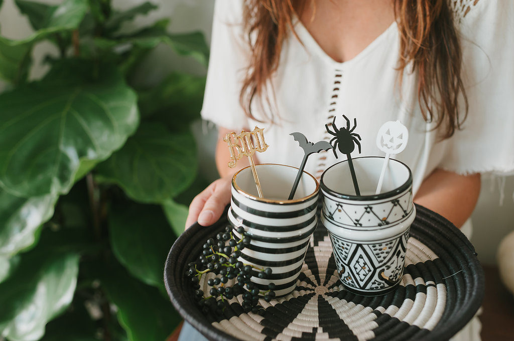 The glassware is from The Little Market, one of our go to shops for anything home. I saw their new black and white collection from Morocco and fell in love! These have a little bit of Beetlejuice meets Boho going for them, no? Just add some of The Roc Shop drink stirrers and you’re good to go! These glasses are so pretty, they will definitely get used again!