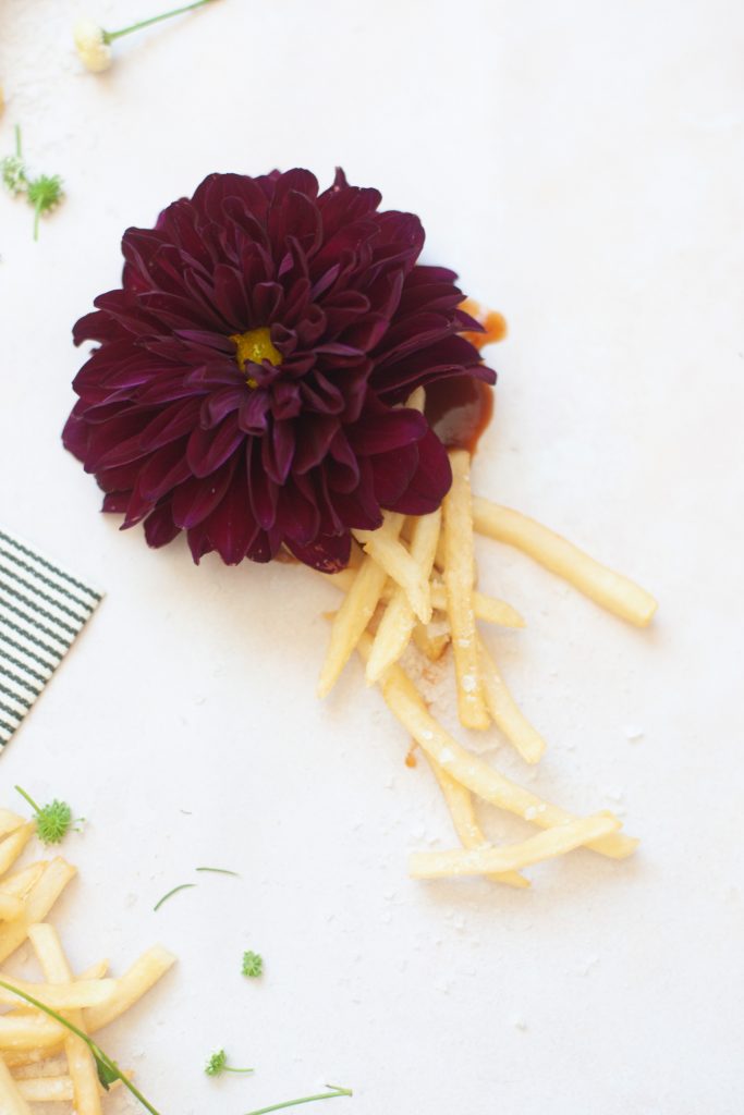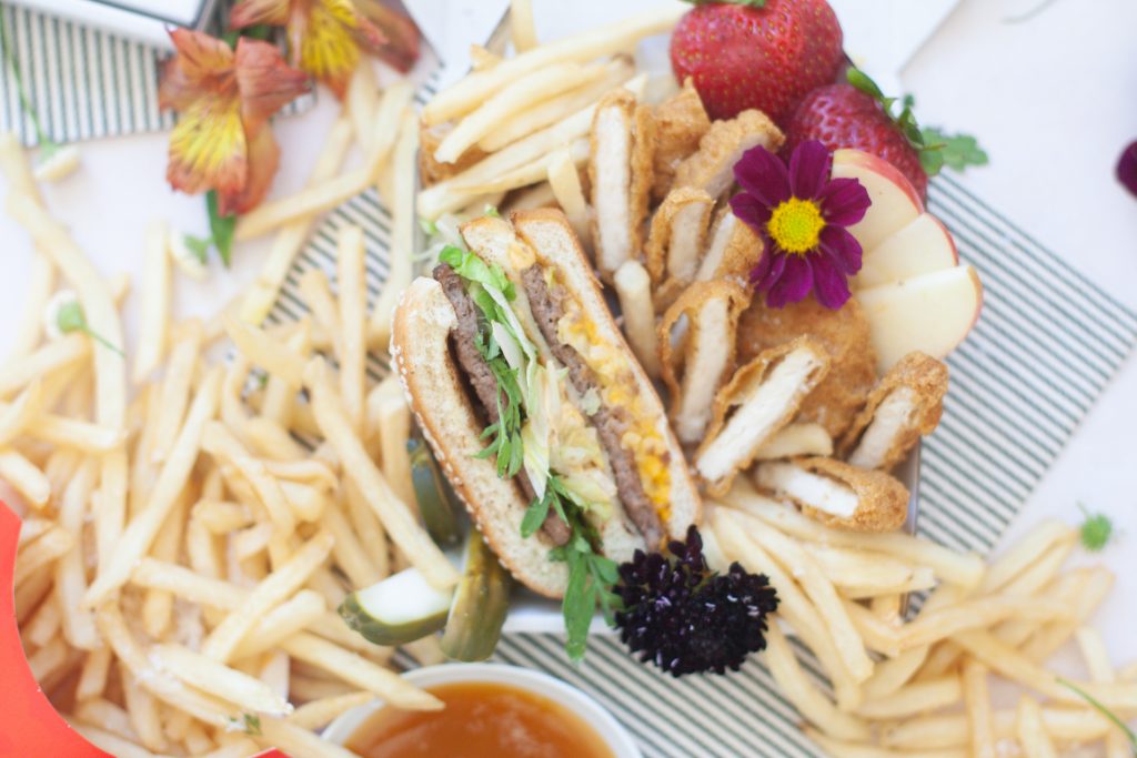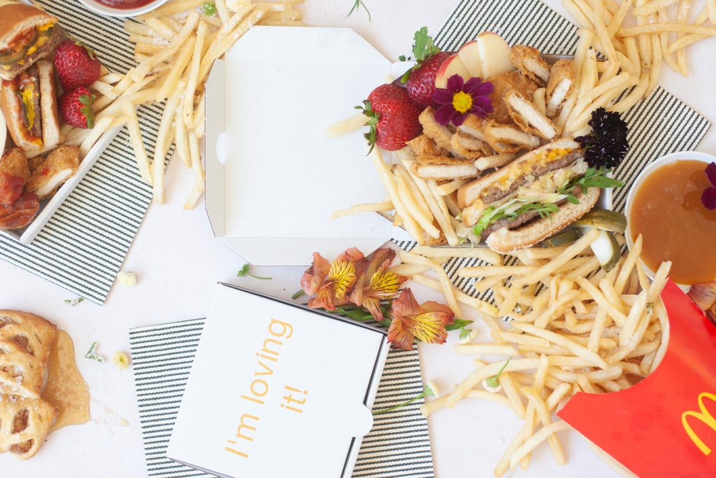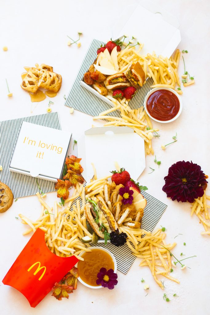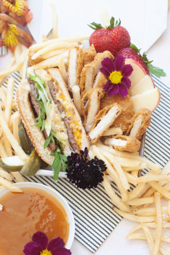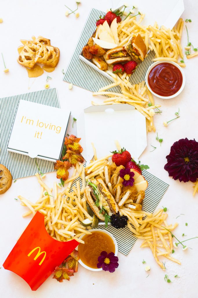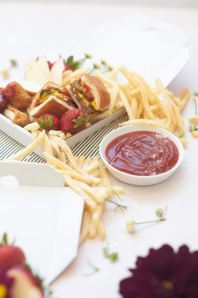 Ok, pals, as usual, we try to keep it pretty simple around here. 1st, if you are doing this for a party, which is a great idea! Cause crossing off food for a party is a big relief! One less thing to worry about, plus I’m pretty sure everyone loves a little Mickey D’s! You can beat their fries. So let’s keep it real here, get the food at the last minute. No one likes cold fast food. Now, grab your little pizza boxes and start creating your masterpiece. Cut the nuggets in half to create little sticks. Slice your cheeseburgers or Big Macs in half. Have fruit sliced and ready to go. Let’s start with the french fries 1st by piling them in a corner. Then work your way around the pizza box. I like to create two corners for the fries. Then start to layer in the big items like a burger or chicken sandwich. Then tuck in the nuggets next to them, followed by some fresh fruit to balance out all that sodium intake. Finally, add some flowers for garnish cause honey, fast food isn’t the prettiest thing to look at! Plus, we love our floral garnishes over here. Add in an apple pie or cookie on the side for a little sweetness. Be sure to serve with your favorite side of sauce; we are a sweet and sour family for sure over here! And, there you have it! One cute little mini pizza box of fast food delish. What kid is going to pass that up! Easy for you and makes those little smiles extra big!