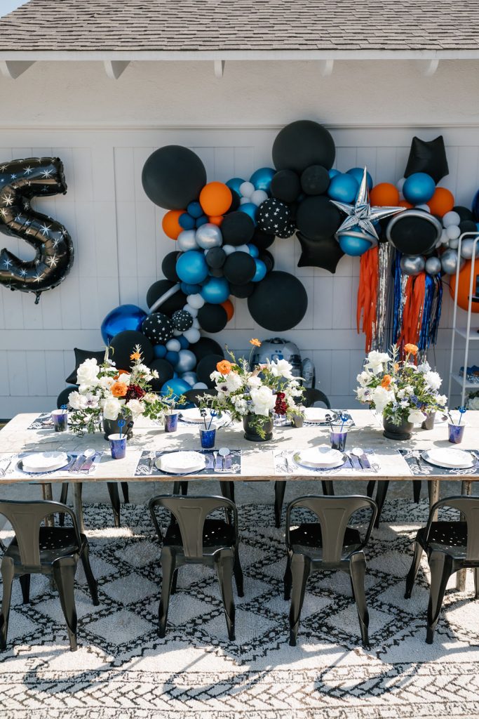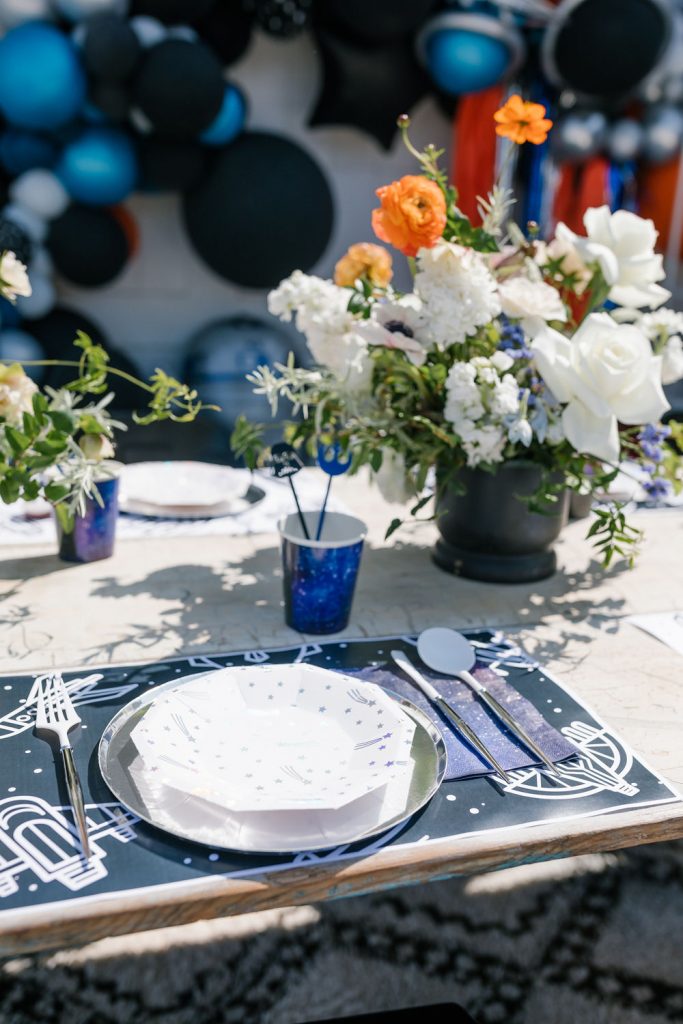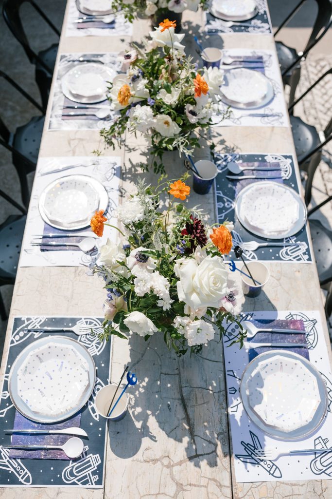 Sweet Salvage Rentals brought her adorable kid’s furniture and Earth & Grace did the gorgeous floral arrangements you see. I asked for neutrals with pops of orange and blue! Love them!! Lastly, I set the table with Daydream Society’s Out of this World collection, Oh Happy Day Party Shop’s silver plates, and Sophistiplate’s Silver Bella flatware.